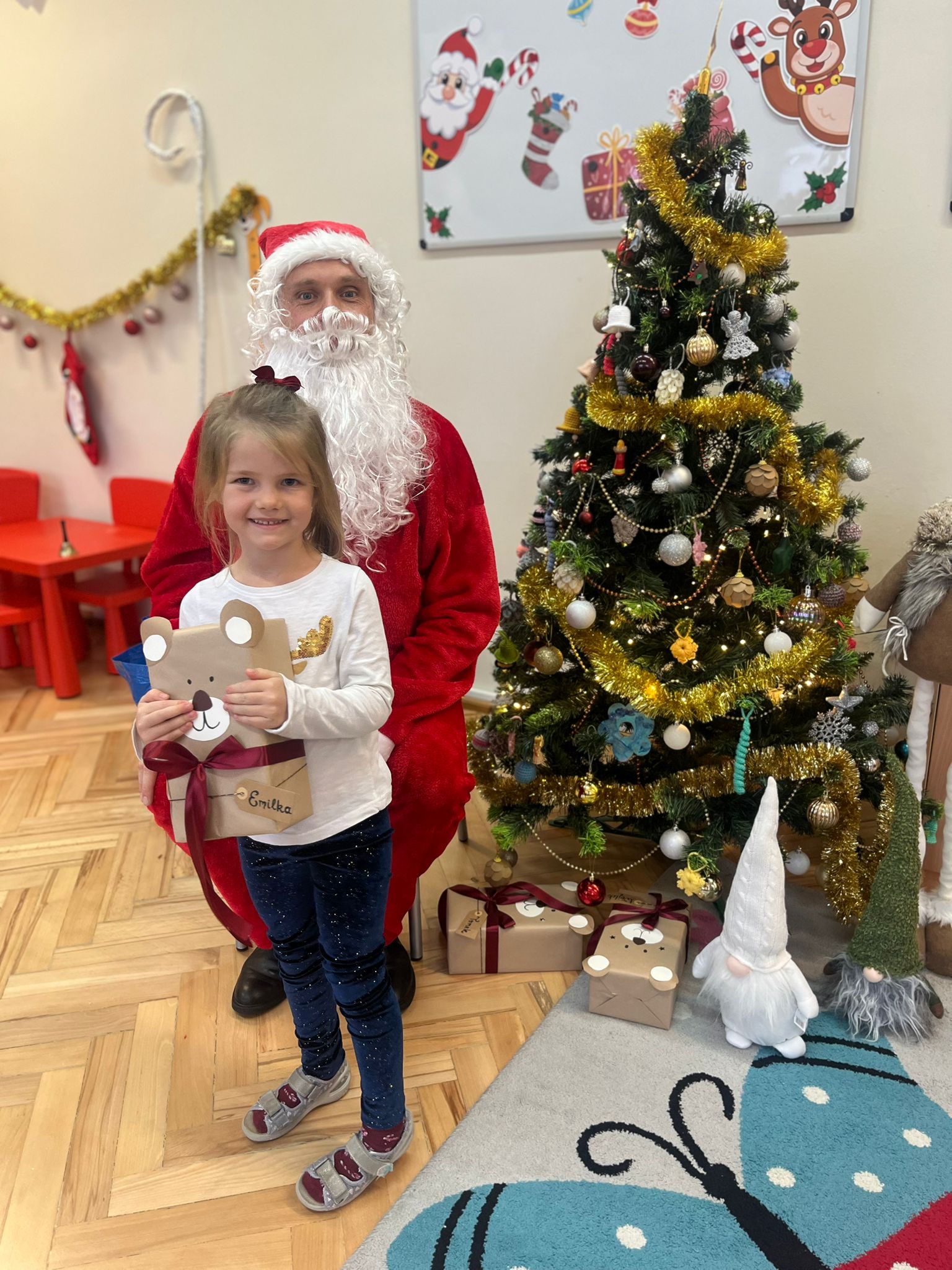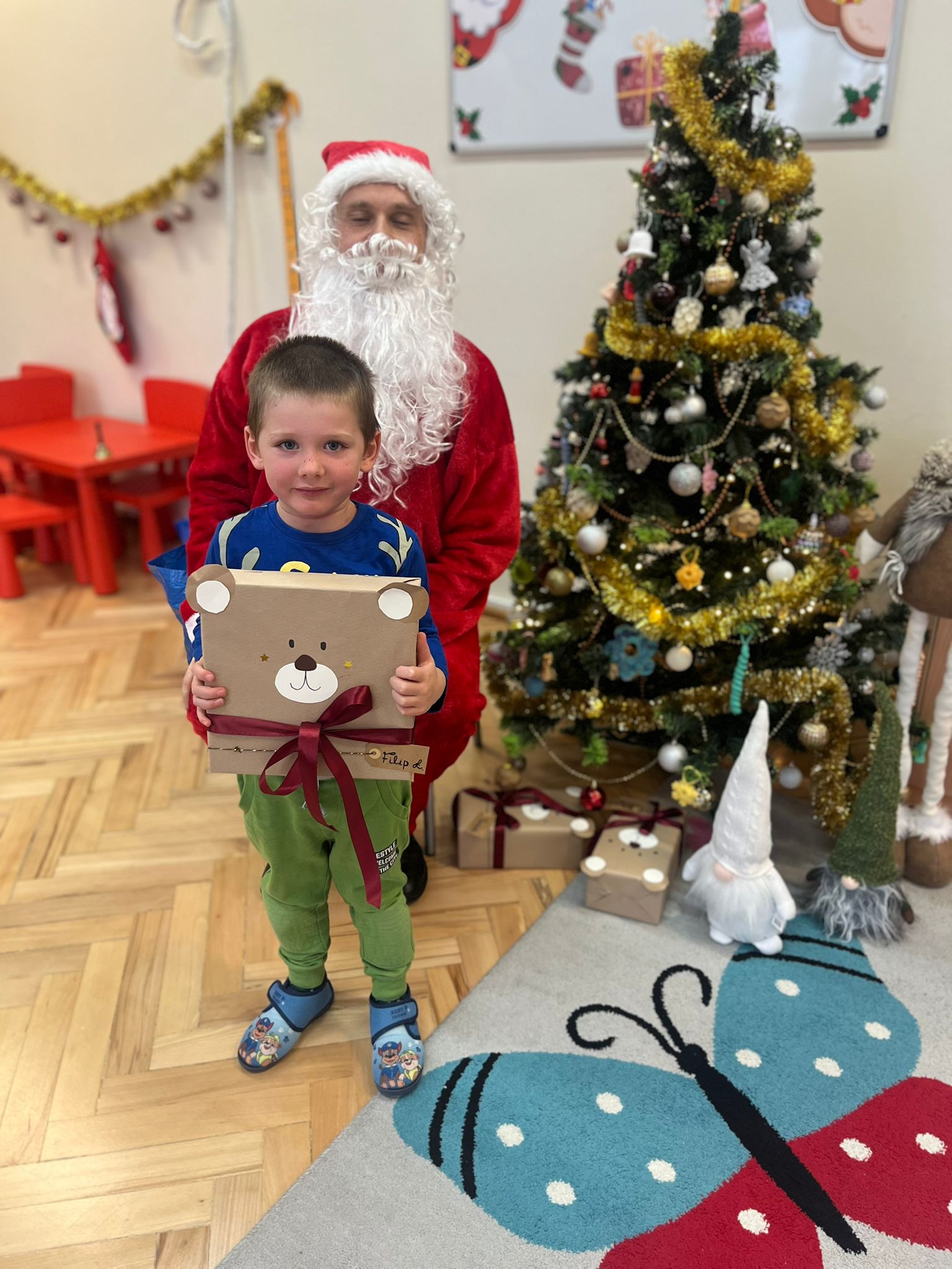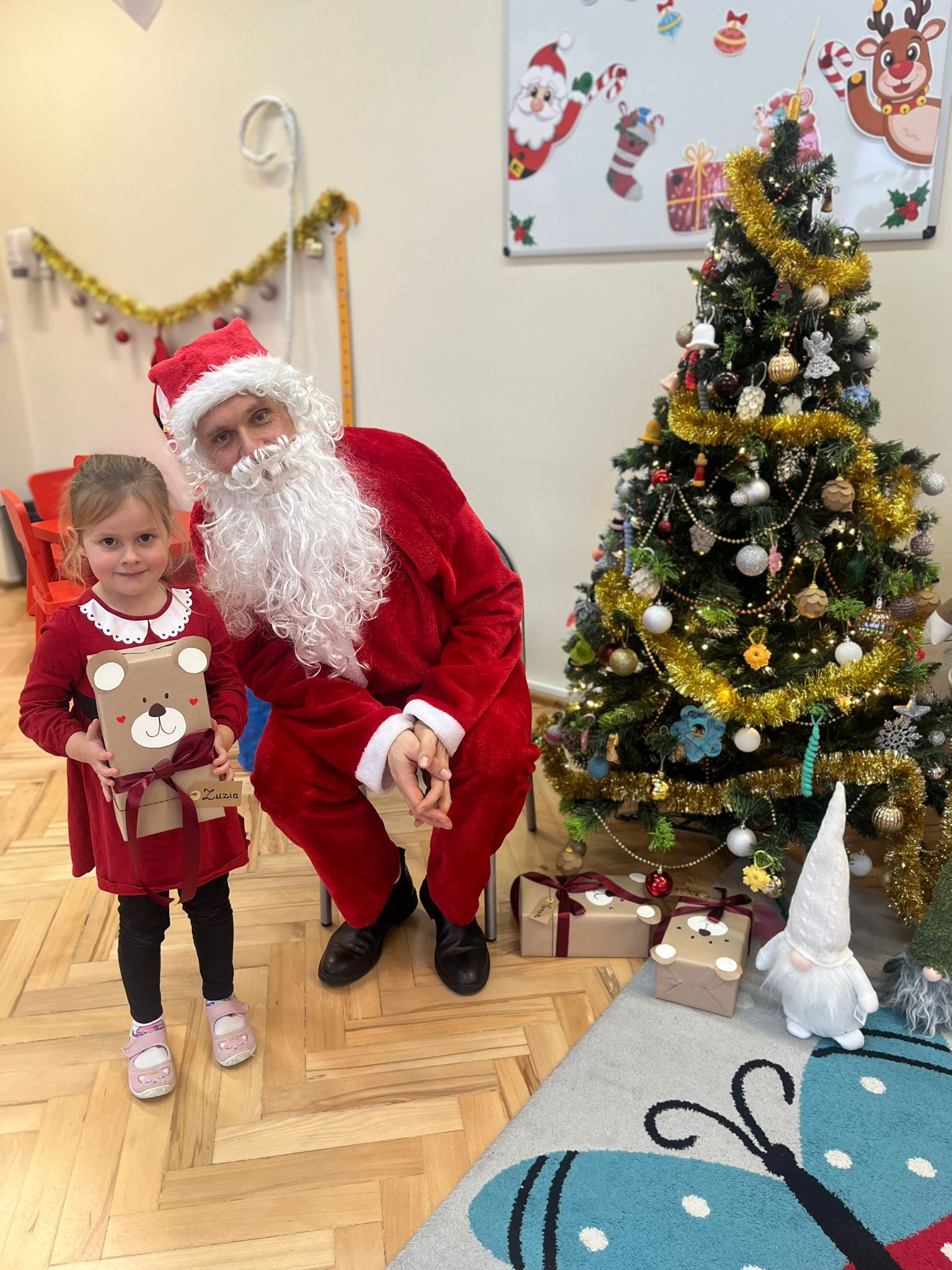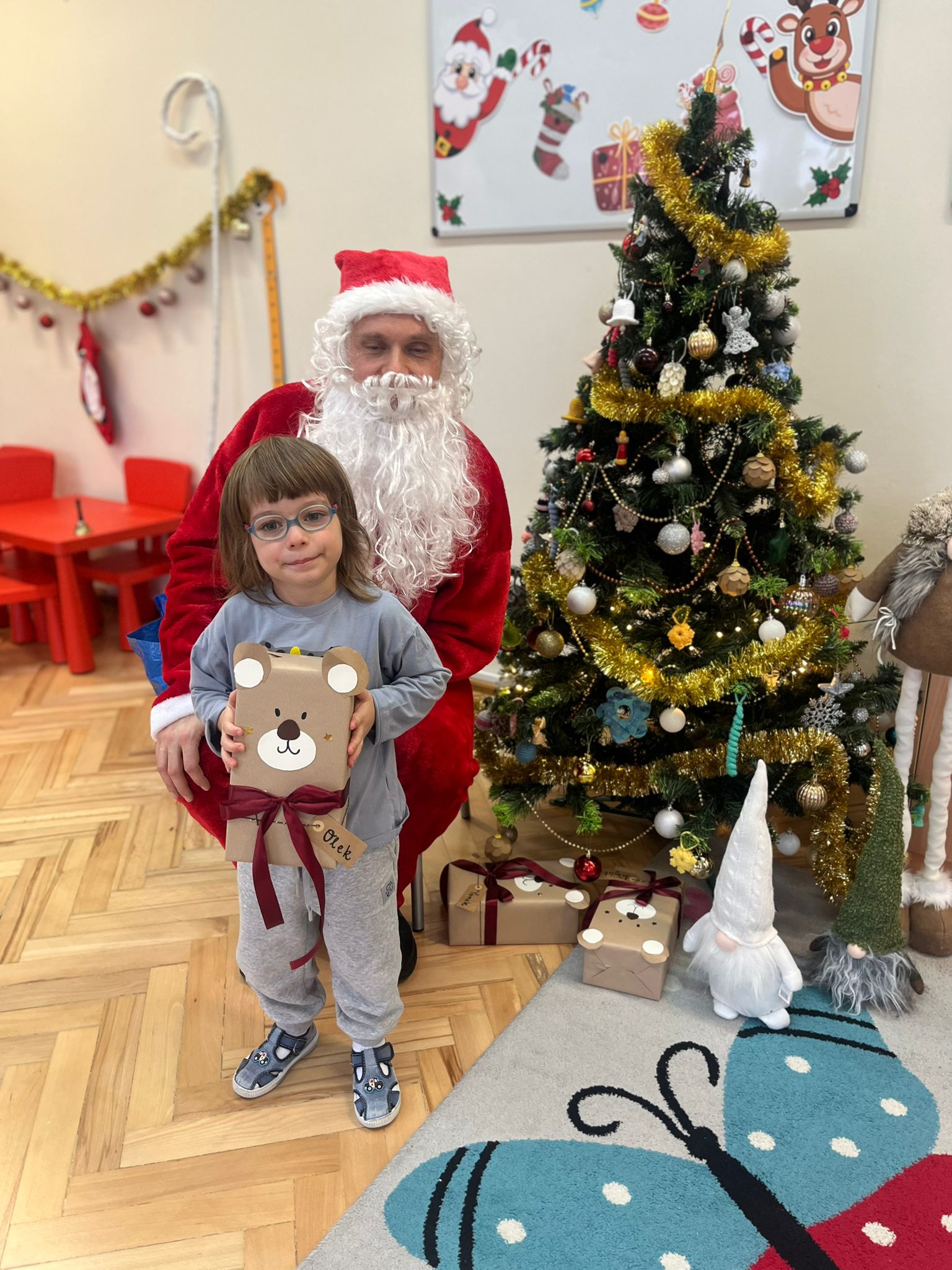 o swoich marzeniach. W sali pojawił się też specjalny „mikołajkowy kącik”, który pomagał tworzyć wyjątkowy nastrój i jeszcze bardziej podkreślał, że ten dzień jest naprawdę wyjątkowy. Wreszcie rozległ się znajomy dźwięk dzwoneczków… I oto Święty Mikołaj pojawił się w naszej sali! Dzieci powitały Go z ogromną radością i zachwytem. Mikołaj rozmawiał z przedszkolakami, chwalił ich za odwagę, życzliwość i koleżeńskość, a na końcu obdarował każdego dziecko pięknym prezentem. Dziękujemy Świętemu Mikołajowi za tę niezwykłą wizytę, za ciepłe słowa i wspaniałe upominki, które wywołały wiele uśmiechów i wzruszeń. 🎁❤️ To był dzień pełen magii, radości i wspólnego świętowania – na długo pozostanie w naszej pamięci!