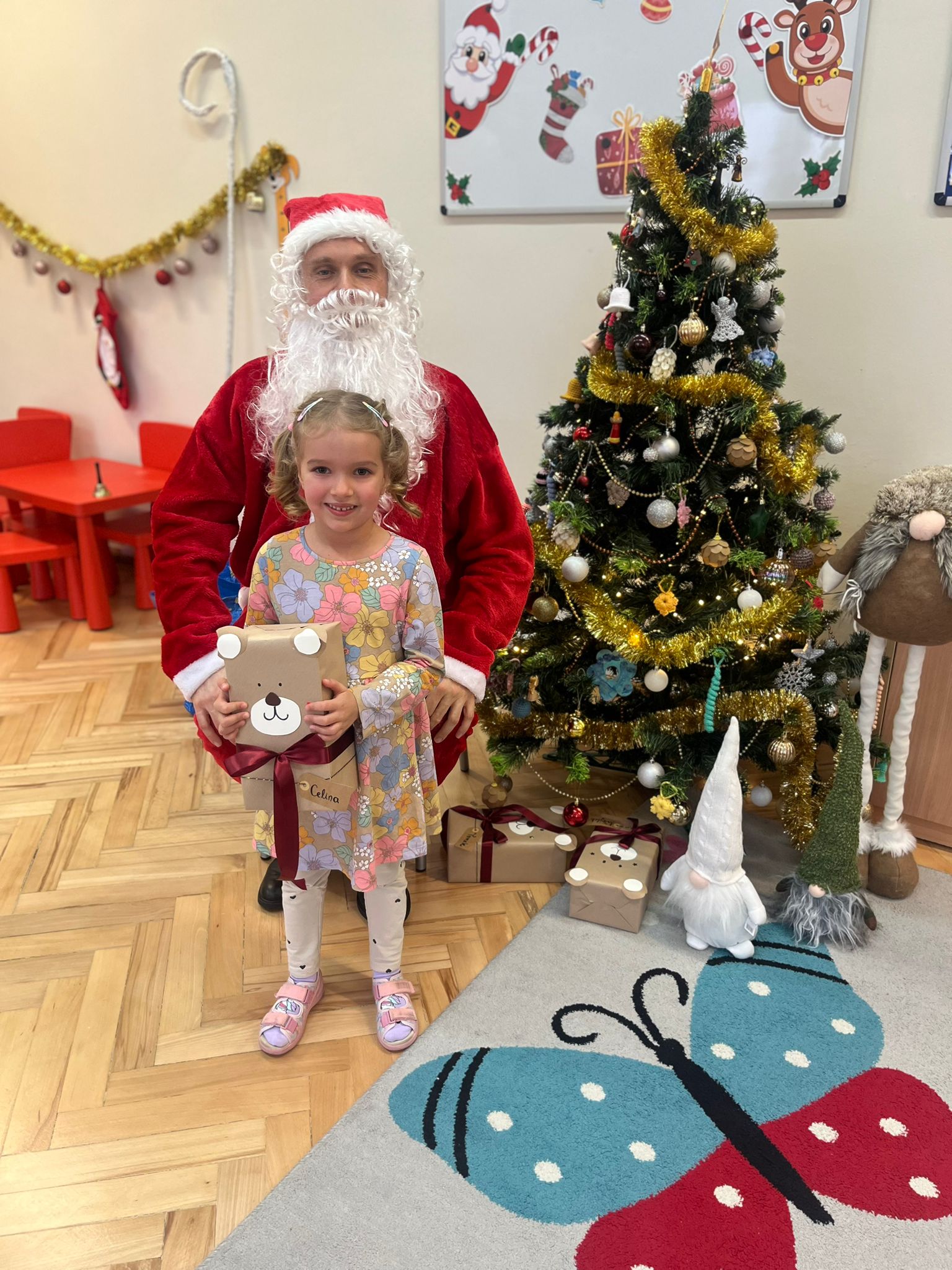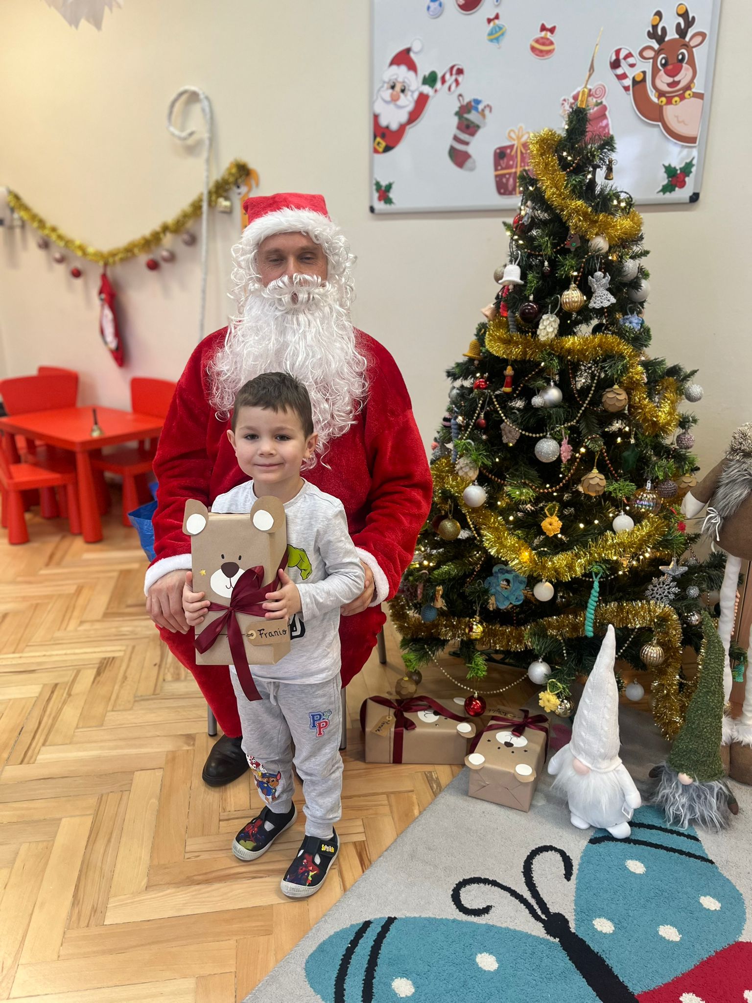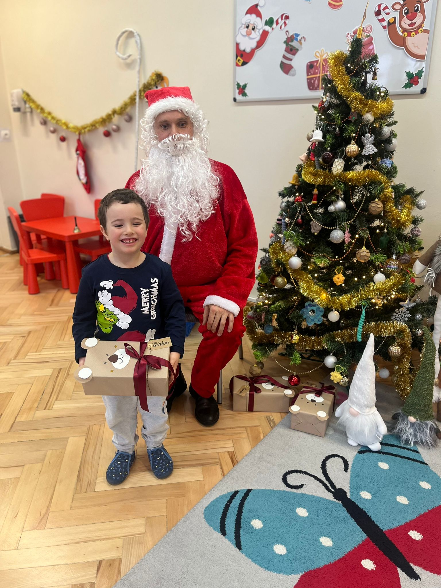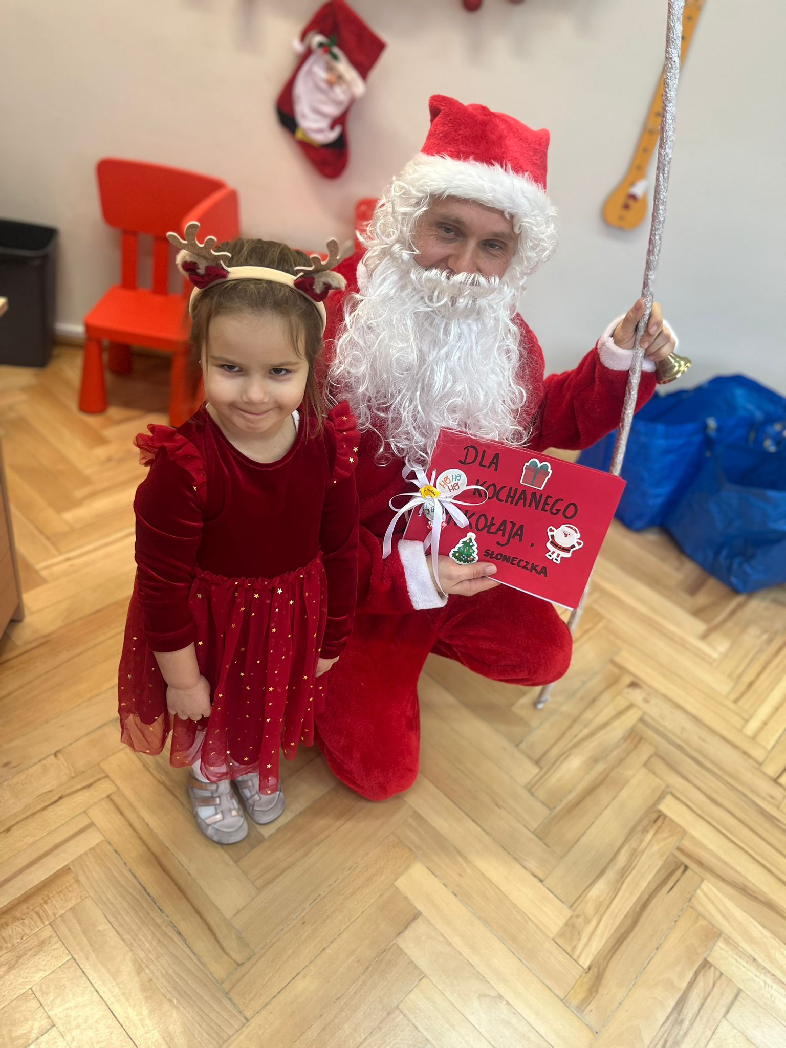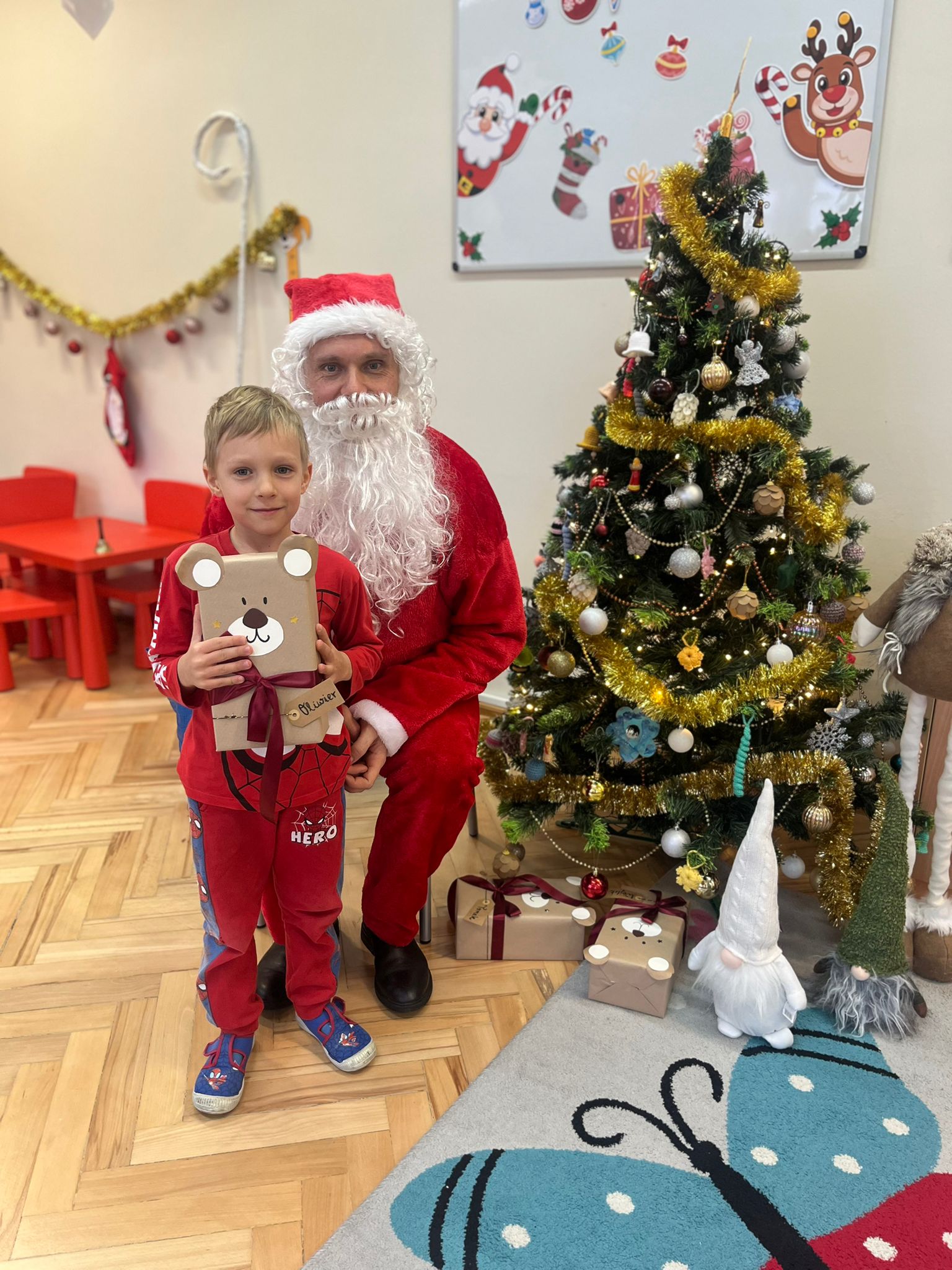 o swoich marzeniach. W sali pojawił się też specjalny „mikołajkowy kącik”, który pomagał tworzyć wyjątkowy nastrój i jeszcze bardziej podkreślał, że ten dzień jest naprawdę wyjątkowy. Wreszcie rozległ się znajomy dźwięk dzwoneczków… I oto Święty Mikołaj pojawił się w naszej sali! Dzieci powitały Go z ogromną radością i zachwytem. Mikołaj rozmawiał z przedszkolakami, chwalił ich za odwagę, życzliwość i koleżeńskość, a na końcu obdarował każdego dziecko pięknym prezentem. Dziękujemy Świętemu Mikołajowi za tę niezwykłą wizytę, za ciepłe słowa i wspaniałe upominki, które wywołały wiele uśmiechów i wzruszeń. 🎁❤️ To był dzień pełen magii, radości i wspólnego świętowania – na długo pozostanie w naszej pamięci!