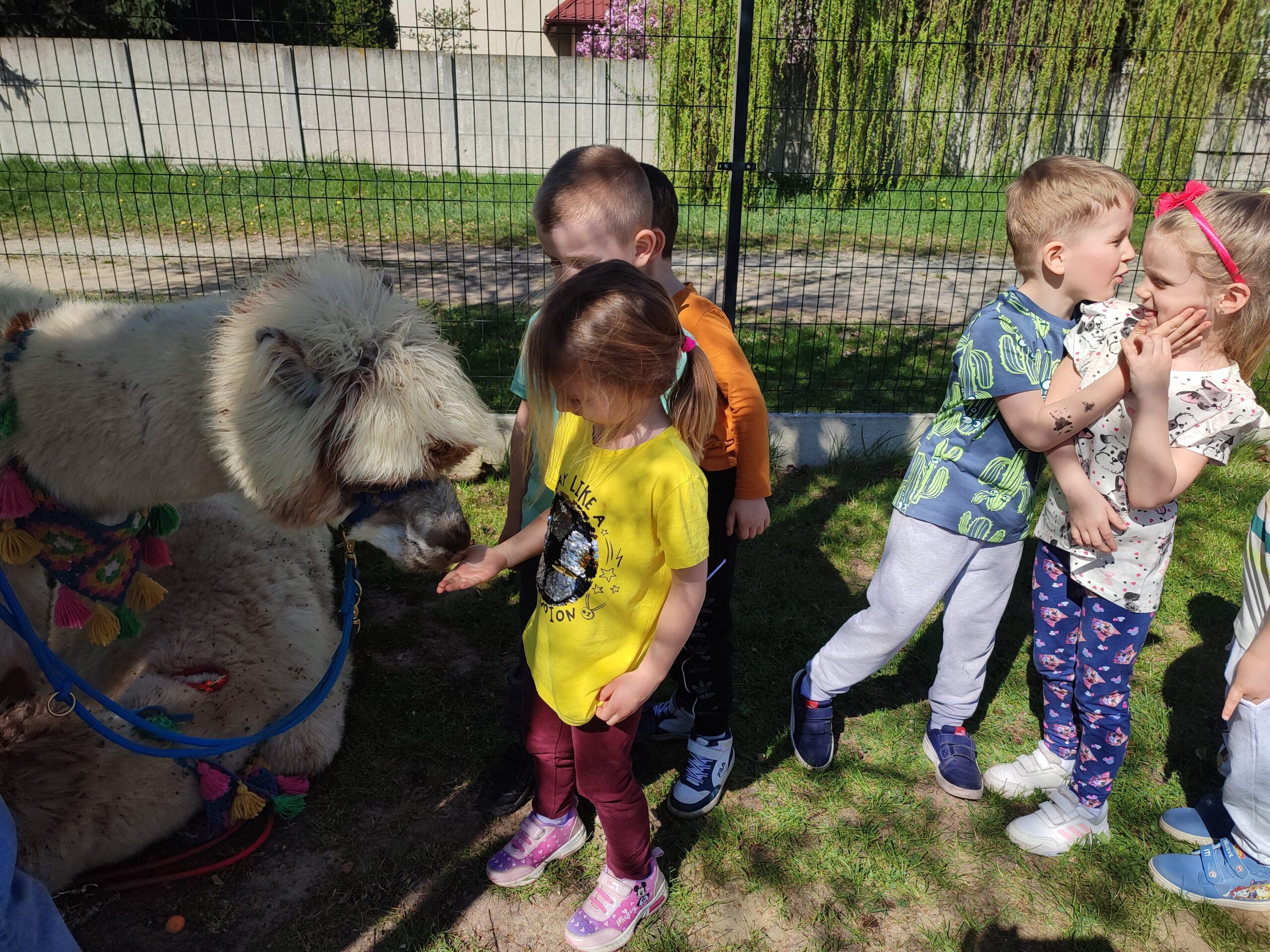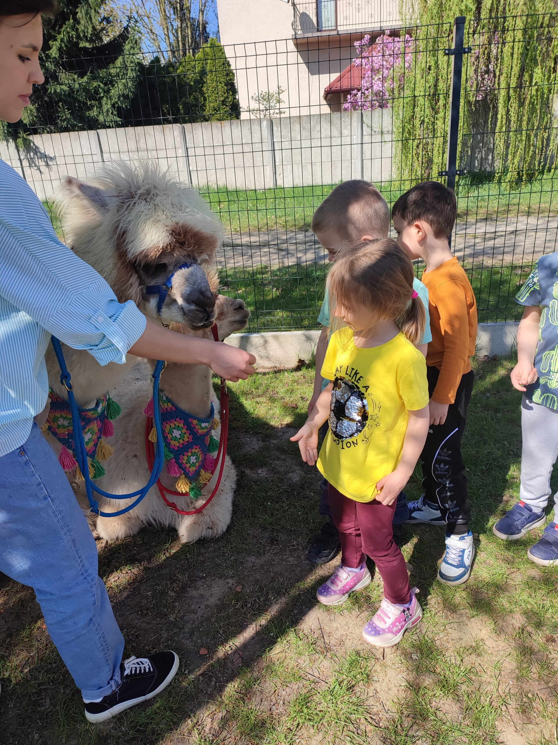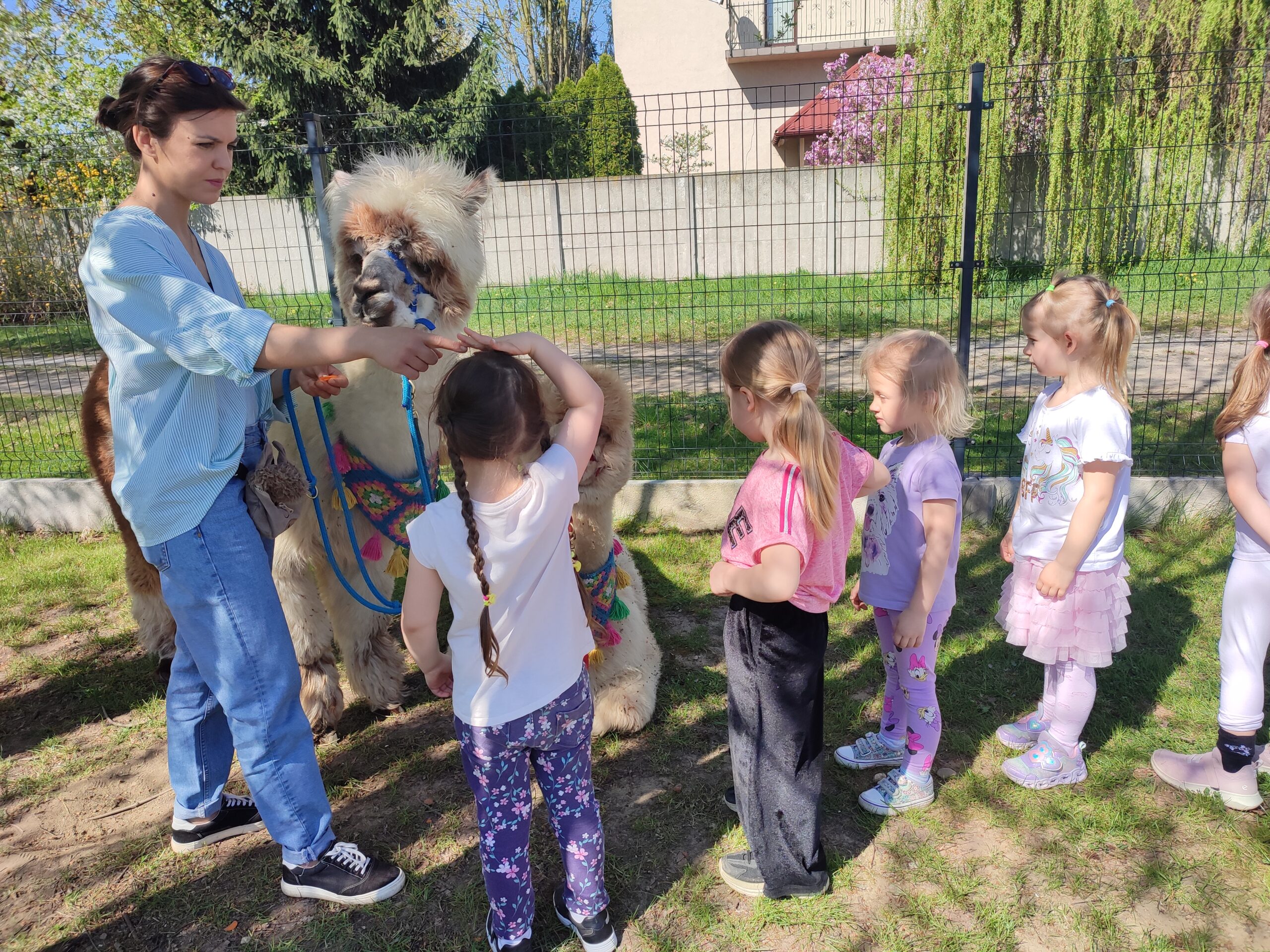 16 kwietnia do naszego przedszkola zagościły alpaki Golden i Billy. W ten słoneczny piękny dzień mogliśmy z nimi pobyć i pogłaskać je Te cudowne zwierzęta dzieci karmiły marchewką, a na koniec wykonały prace plastyczne na świeżym powietrzu z sylwetką alpaka.Na pamiątkę przedszkolaki otrzymały zdjęcia.