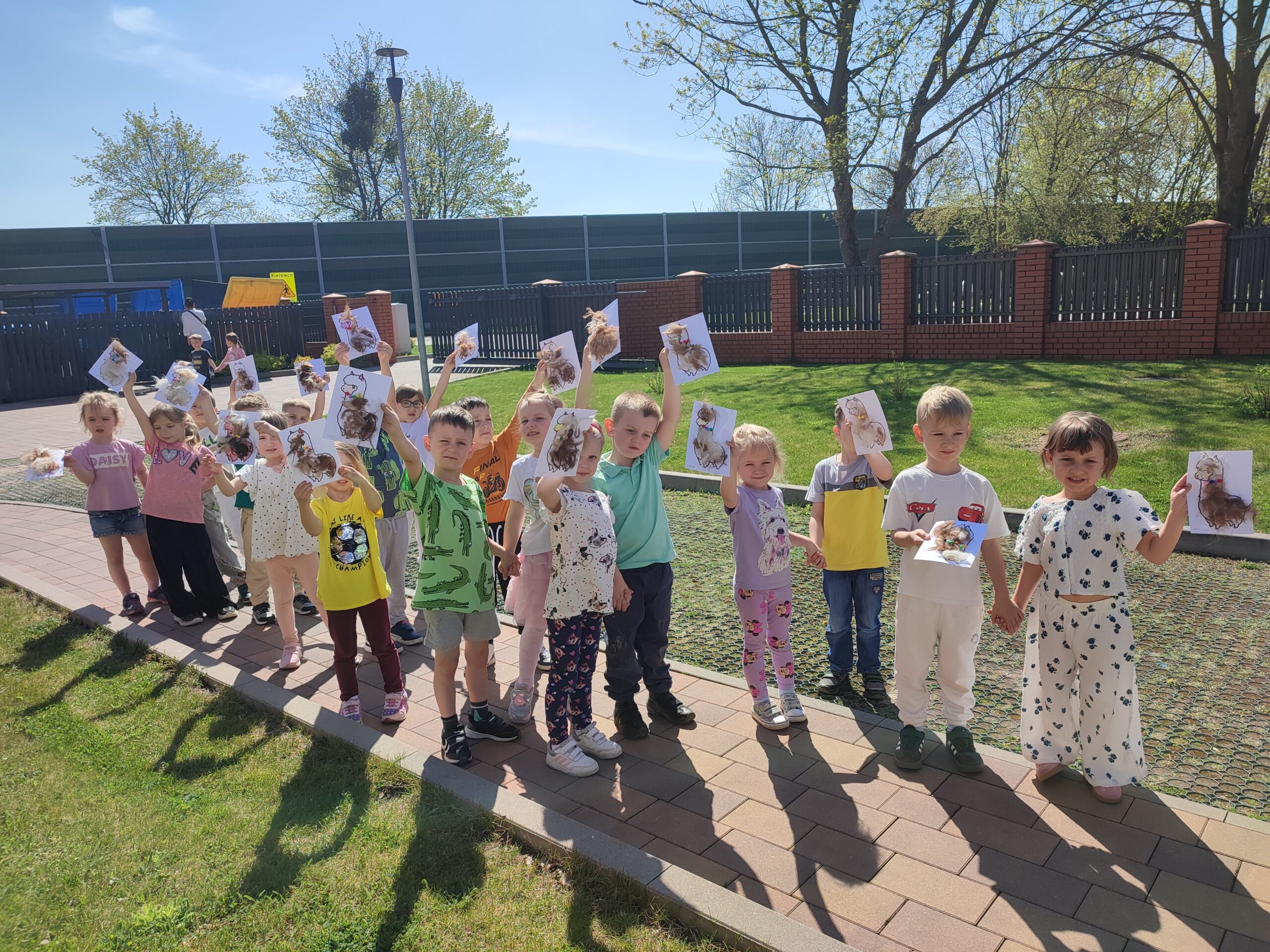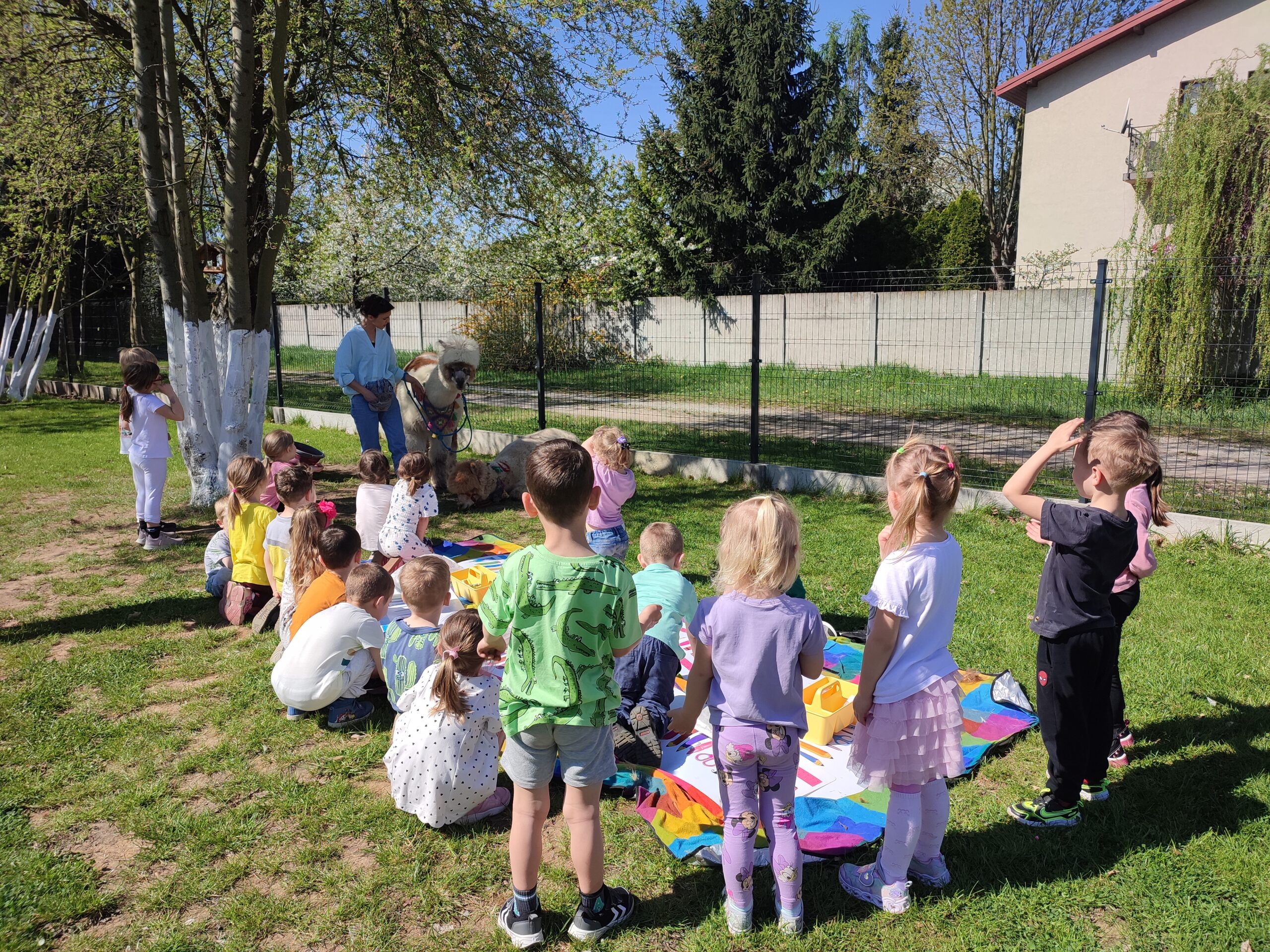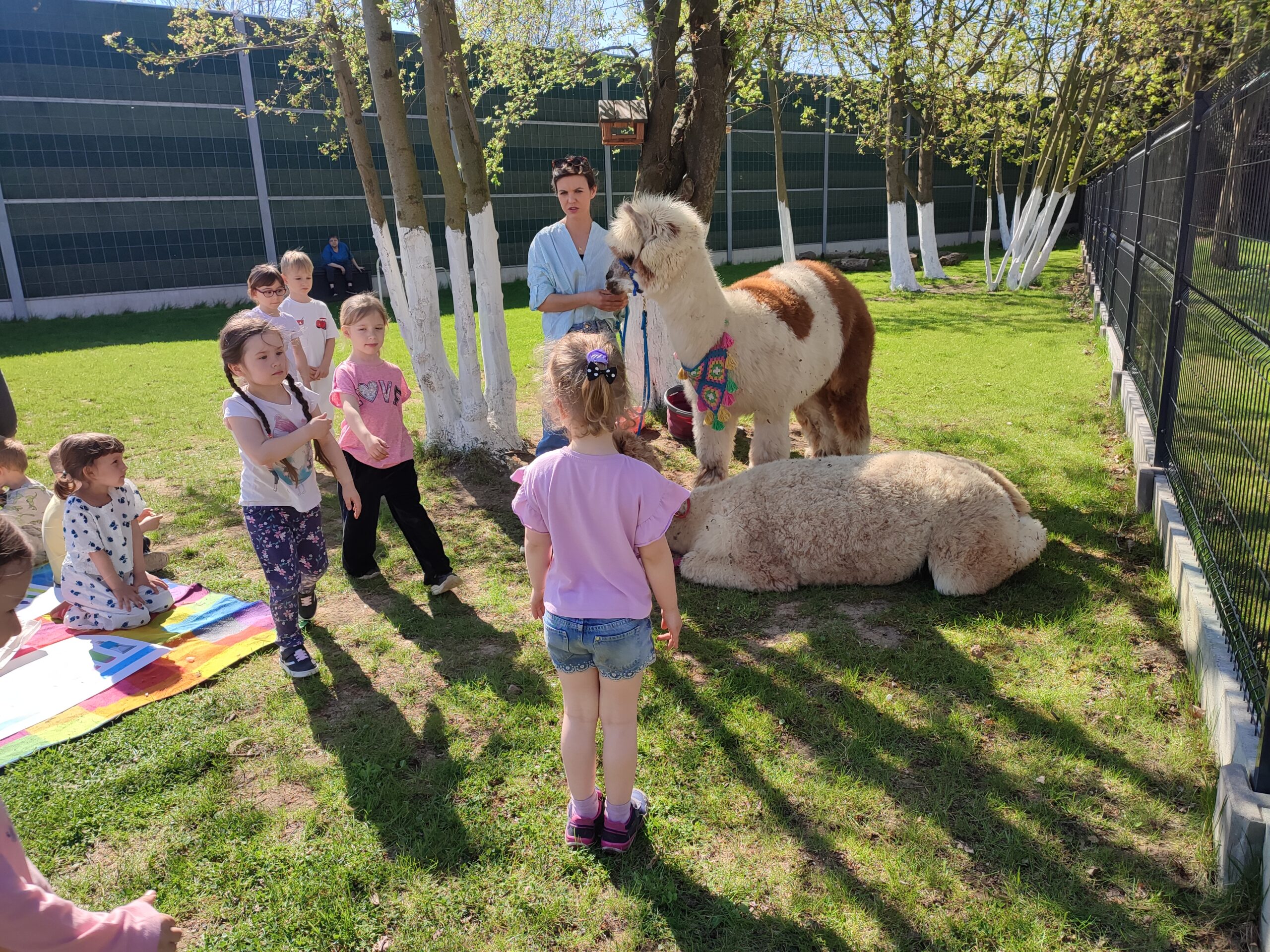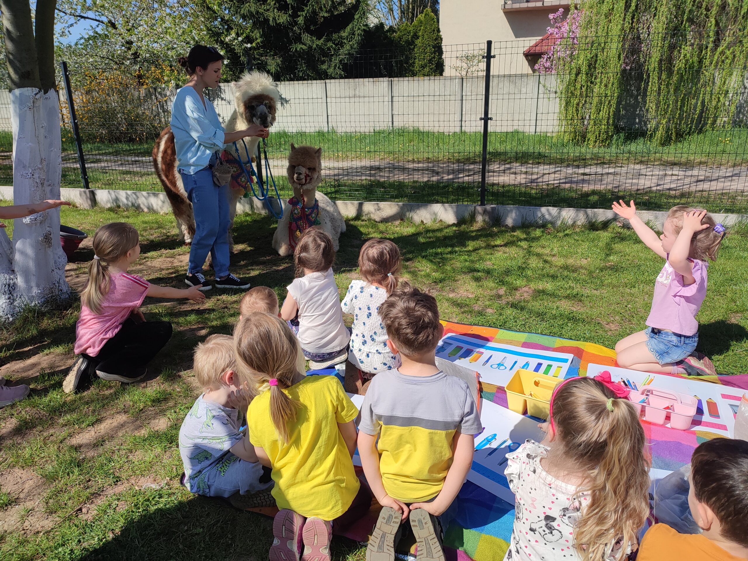 16 kwietnia do naszego przedszkola zagościły alpaki Golden i Billy. W ten słoneczny piękny dzień mogliśmy z nimi pobyć i pogłaskać je Te cudowne zwierzęta dzieci karmiły marchewką, a na koniec wykonały prace plastyczne na świeżym powietrzu z sylwetką alpaka.Na pamiątkę przedszkolaki otrzymały zdjęcia.