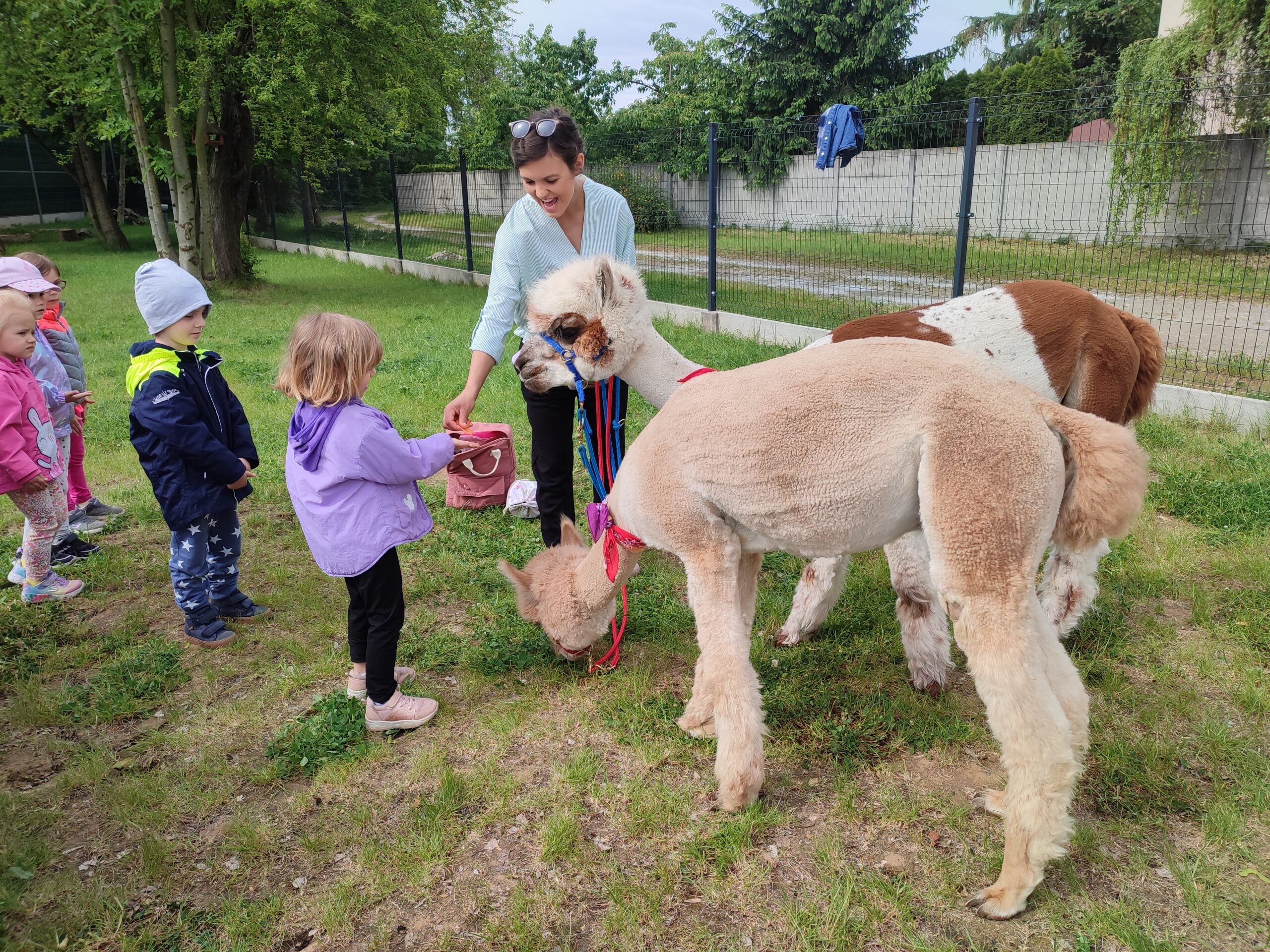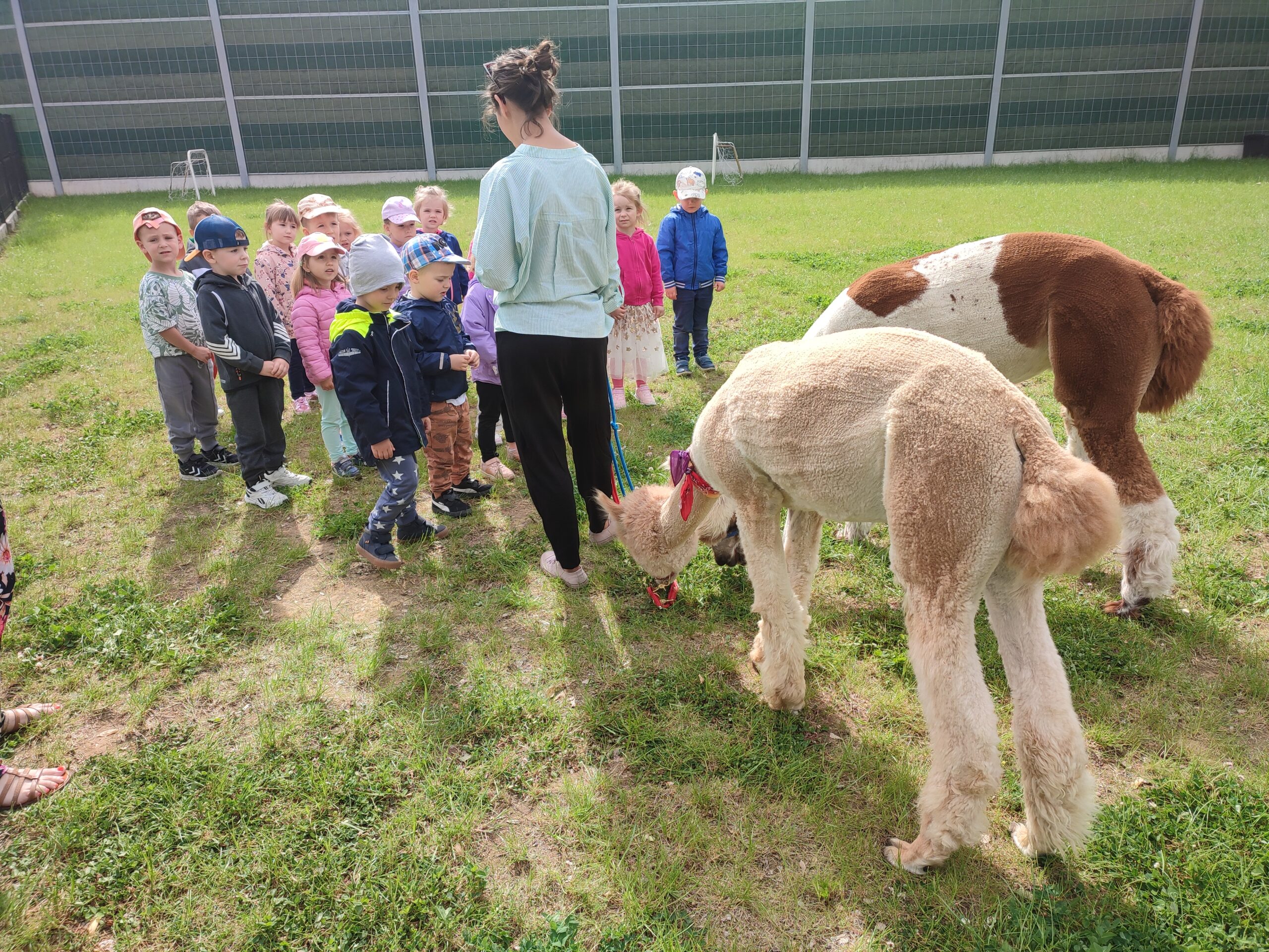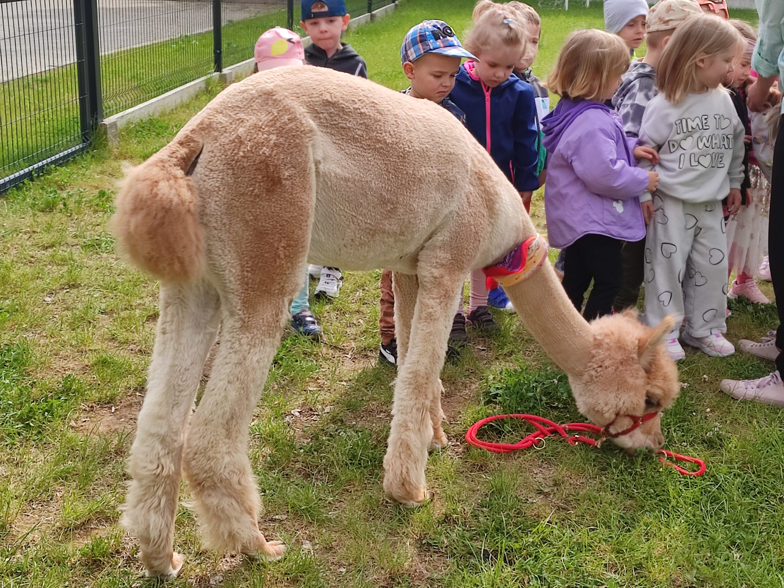 Dzieci z grupy 2 Biedronek odwiedziły alpaki, które dotarły do naszego przedszkola w poniedziałek. Mogliśmy pogłaskać te miłe zwierzątka i poczęstować marchewką. Dla dzieci była to niezwykła przygoda. Na pamiątkę tego spotkania każde dziecko otrzymało zdjęcie z alpakami
