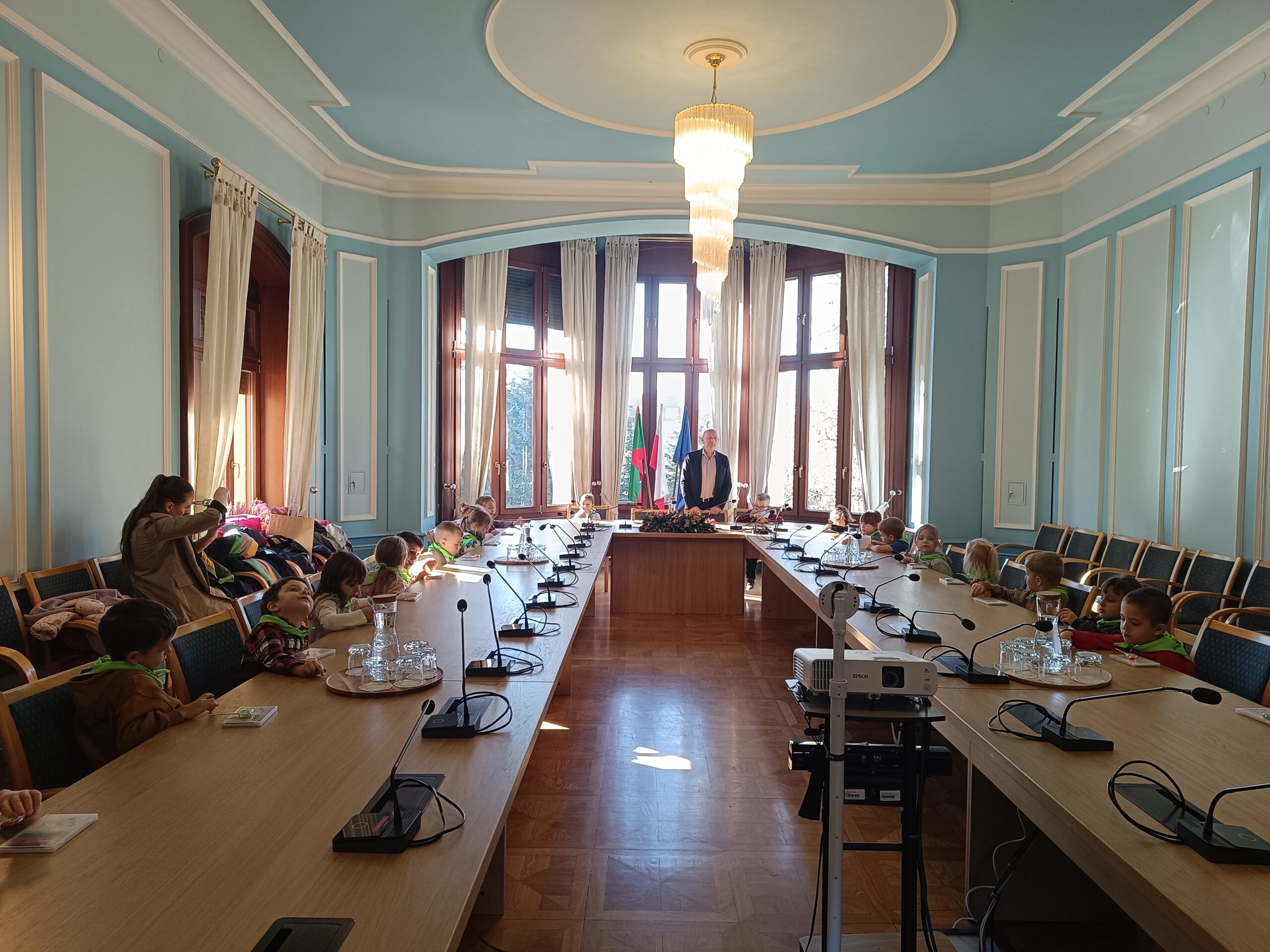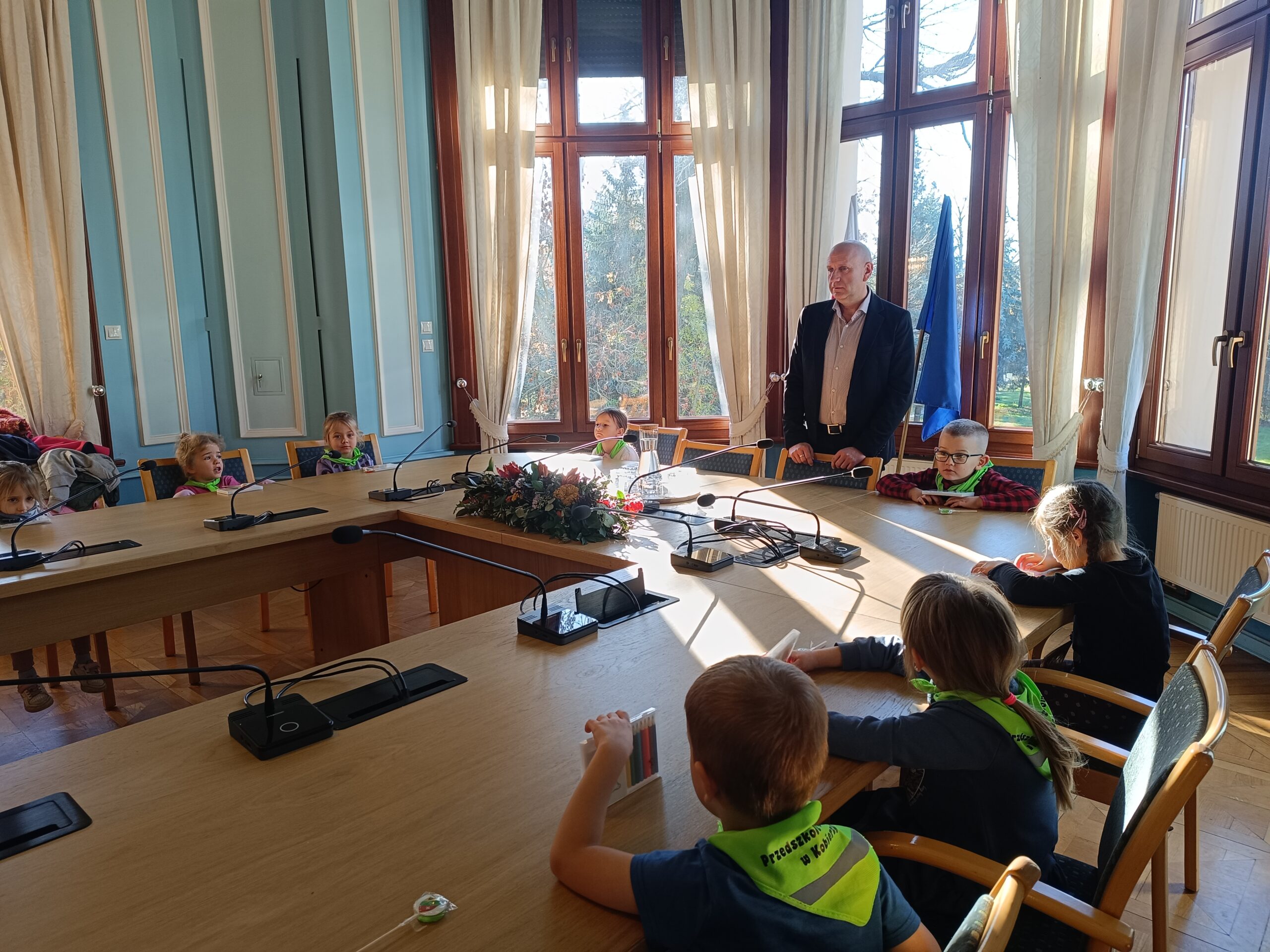 6 listopada, Wójt Piotr Kopeć, zaprosił dzieci z naszej grupy do Urzędu Gminy w Kobierzycach. Po rozmowach i debacie w ogromnej sali posiedzeń, Biedronki zwiedzały zabytkowy budynek urzędu oraz bawiły się wśród starych drzew w parku pałacowym.