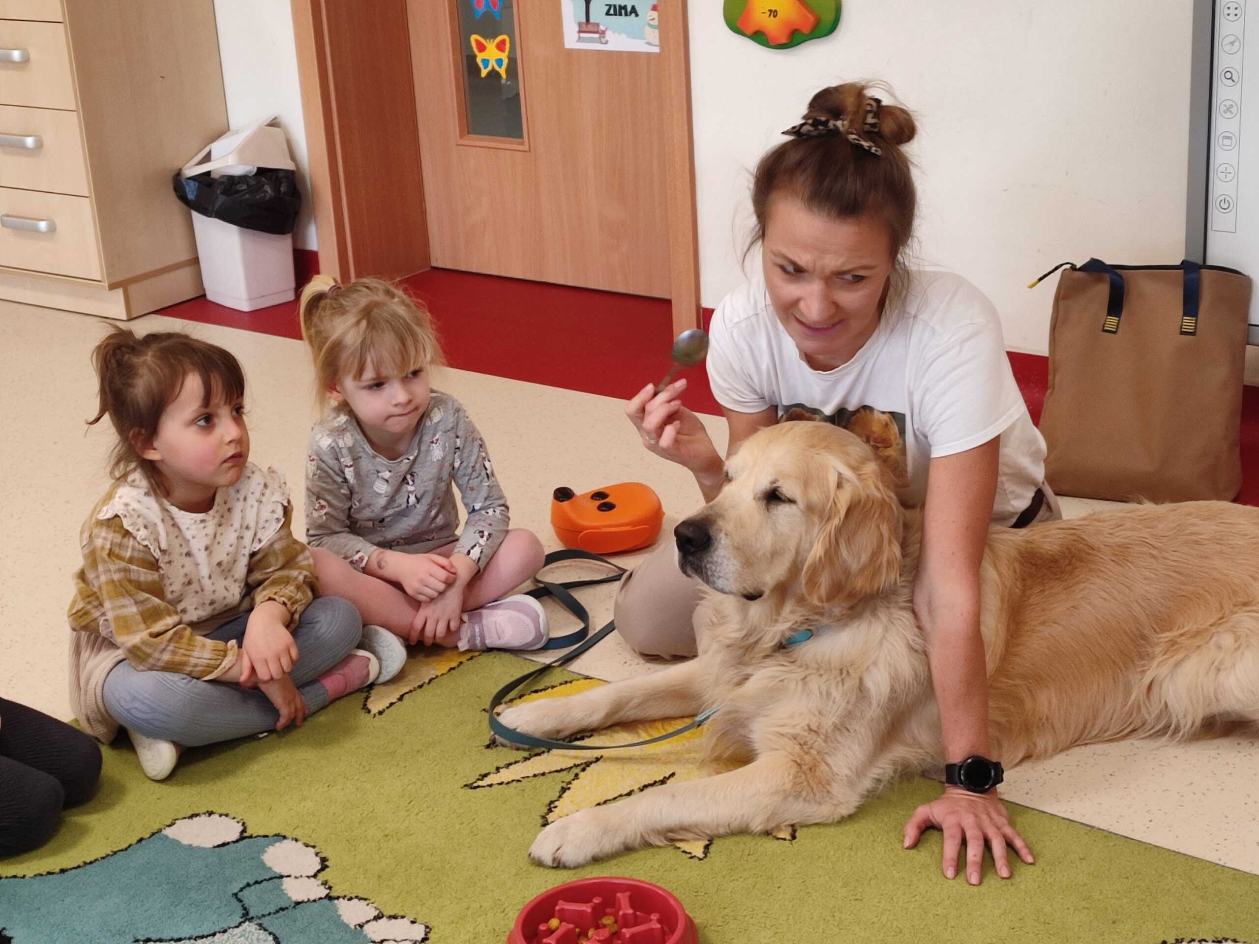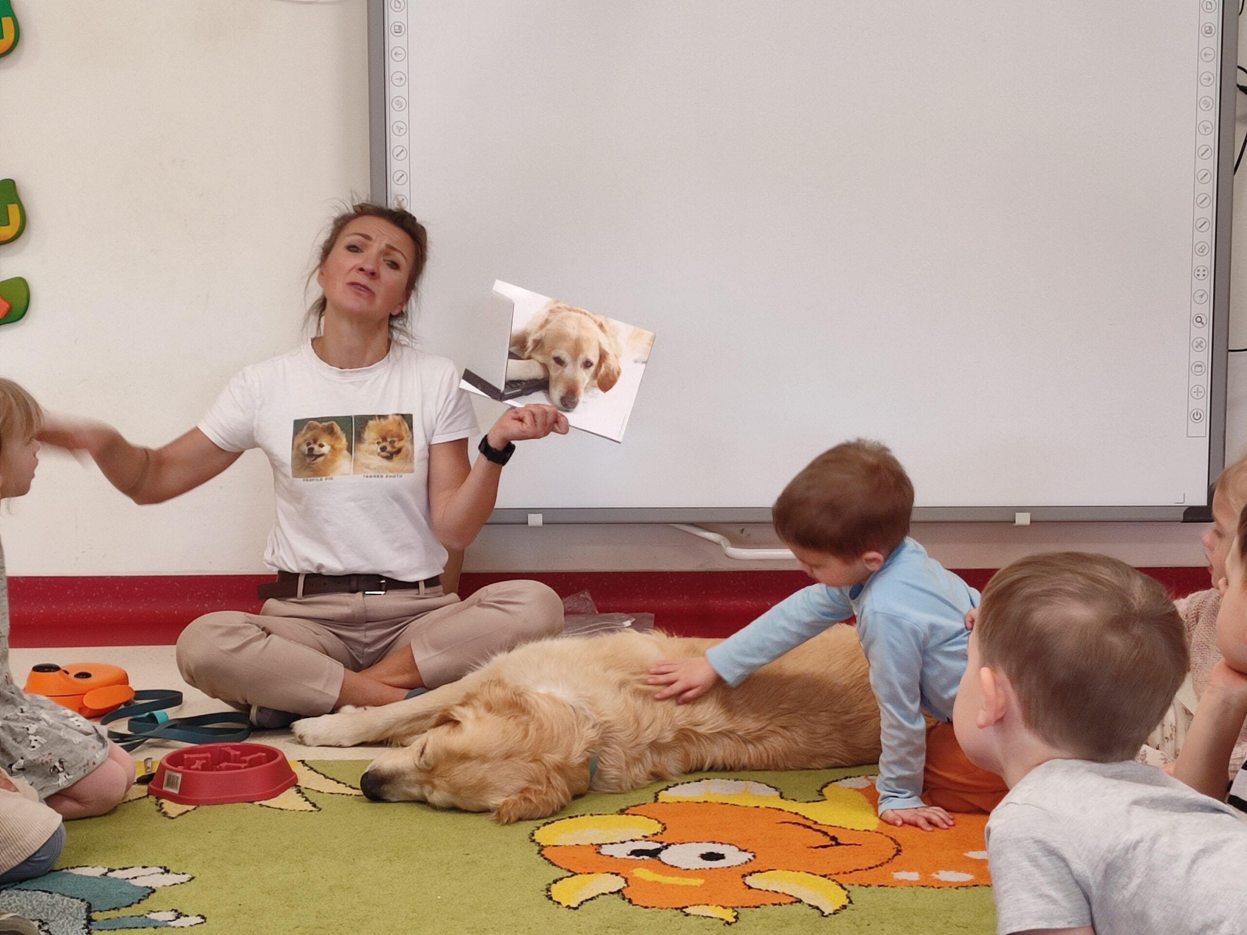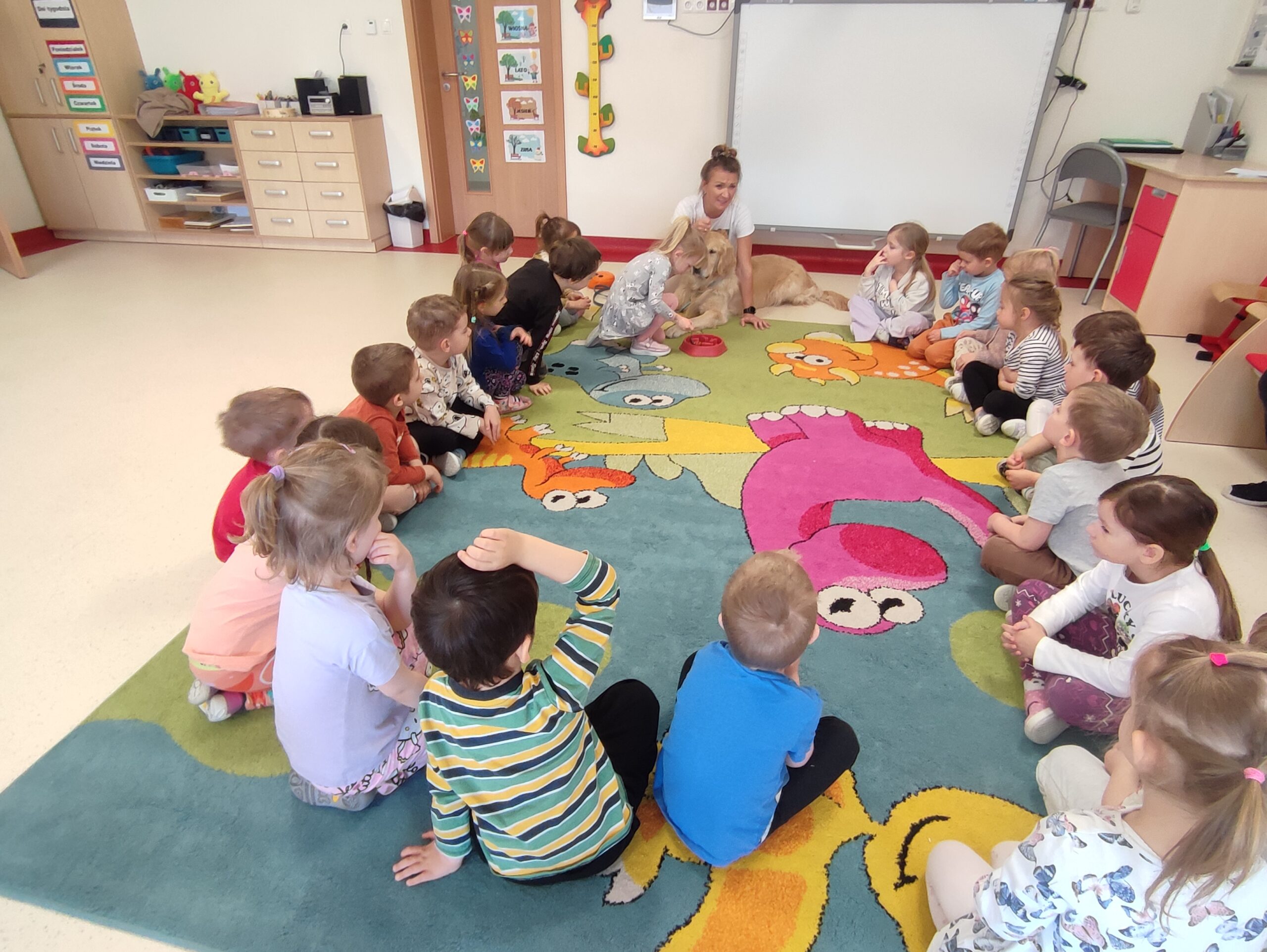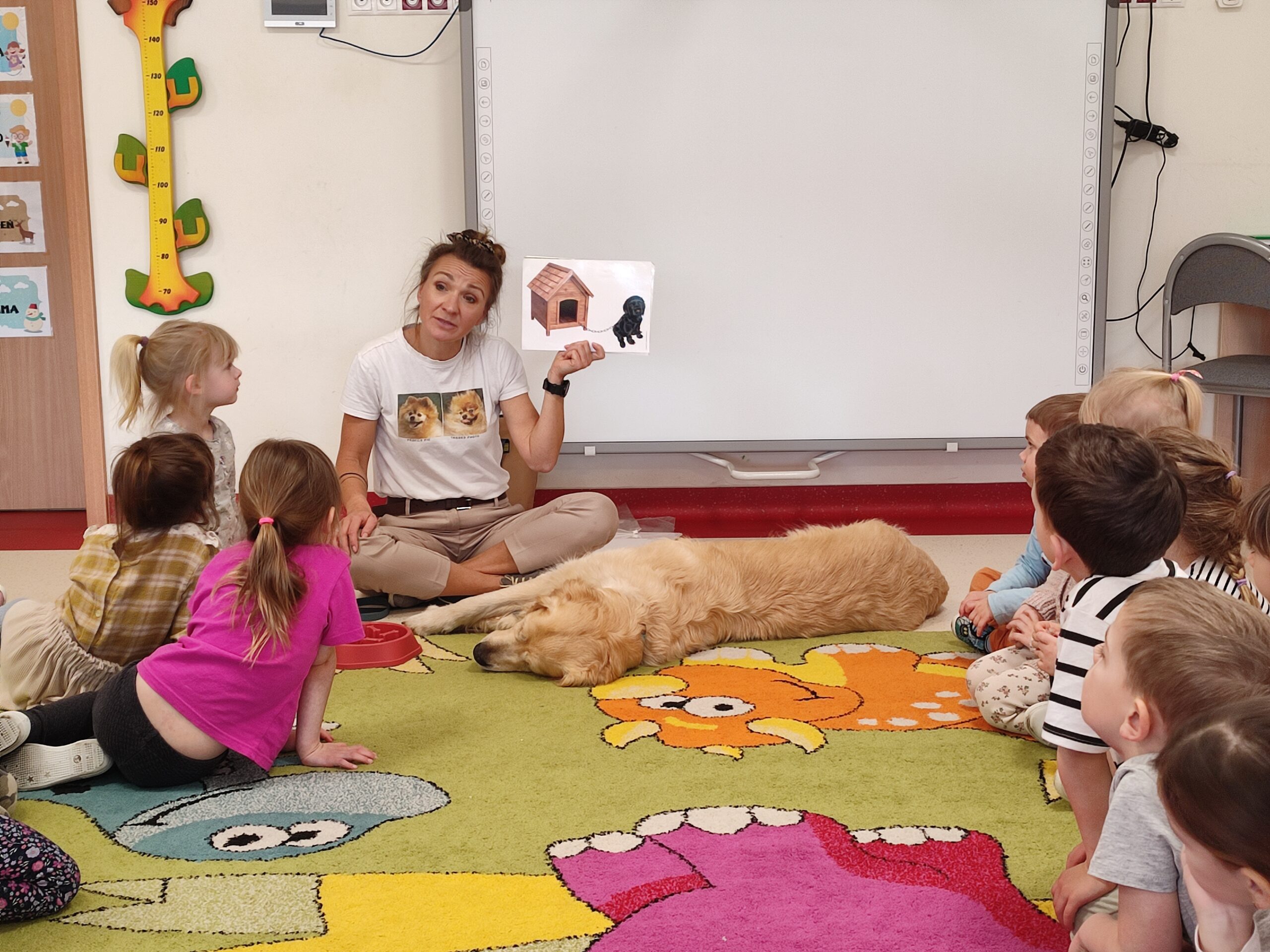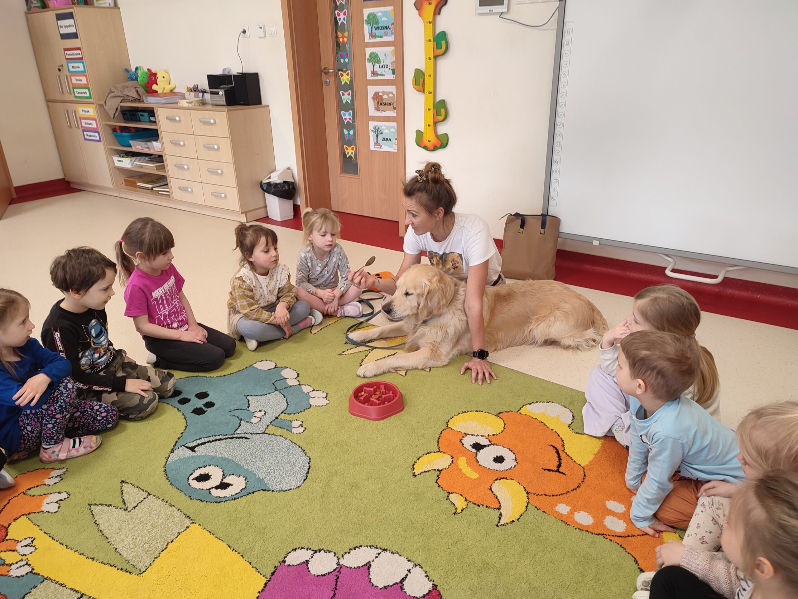 19 Marca gościliśmy w naszym przedszkolu pieska – Leona. Dzieci poznały dużego bardzo przyjaznego psa. Podawały mu karmę, głaskały oraz dopytywały. Odpowiadały na pytania, które zadawała Pani w trosce o pupila czy potrafią zadbać o czworonoga. Dzieci wzorowo zdały test na opiekuna.