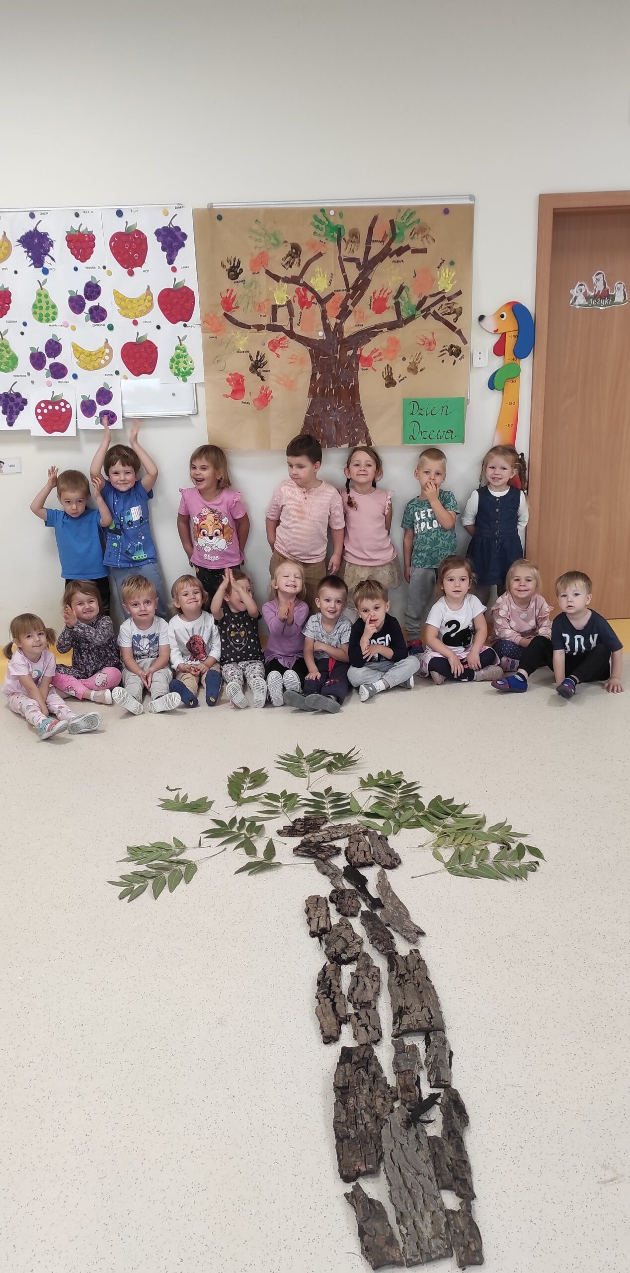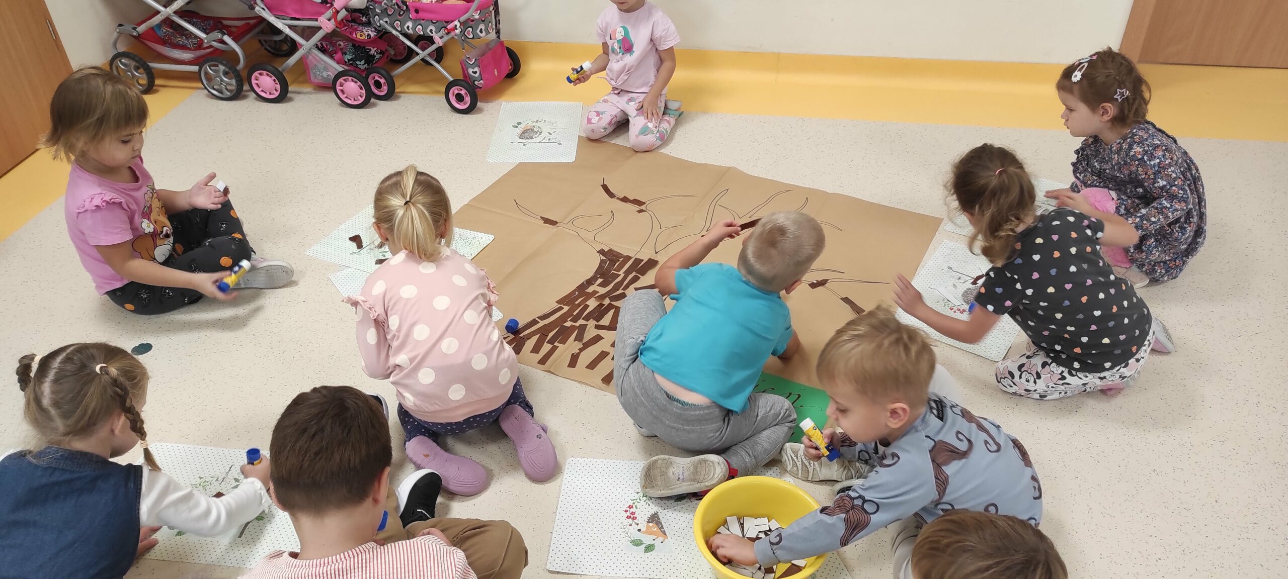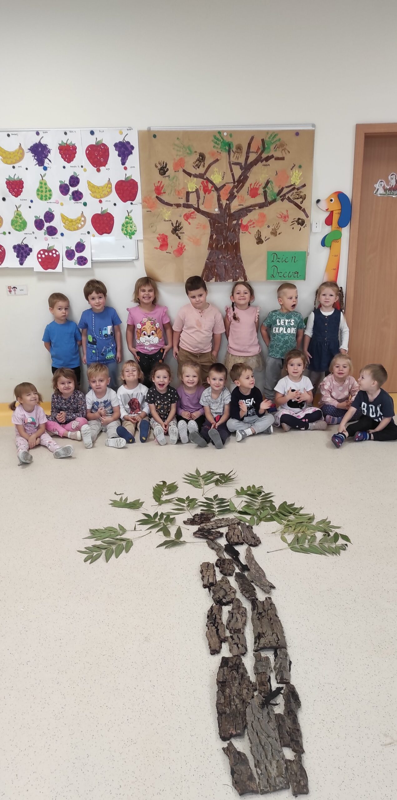 W październiku obchodzony jest Dzień Drzewa. W tym dniu Jeżyki wzięły udział w polisensorycznych zajęciach edukacyjnych. Po szczegółowym obejrzeniu drzew znajdujących się w naszym otoczeniu i omówieniu ich budowy z materiału przyrodniczego zgromadzonego w sali ułożyły drzewo. Dało to dzieciom świetną okazję do pobudzenia zmysłów dotyku, węchu i słuchu. Całość zakończyliśmy wspólnym wykonaniem plakatu „Jesienne drzewo”, w trakcie którego dzieci doskonaliły sprawność motoryczną dłoni.