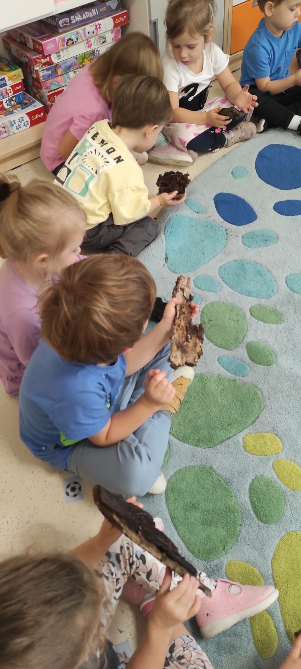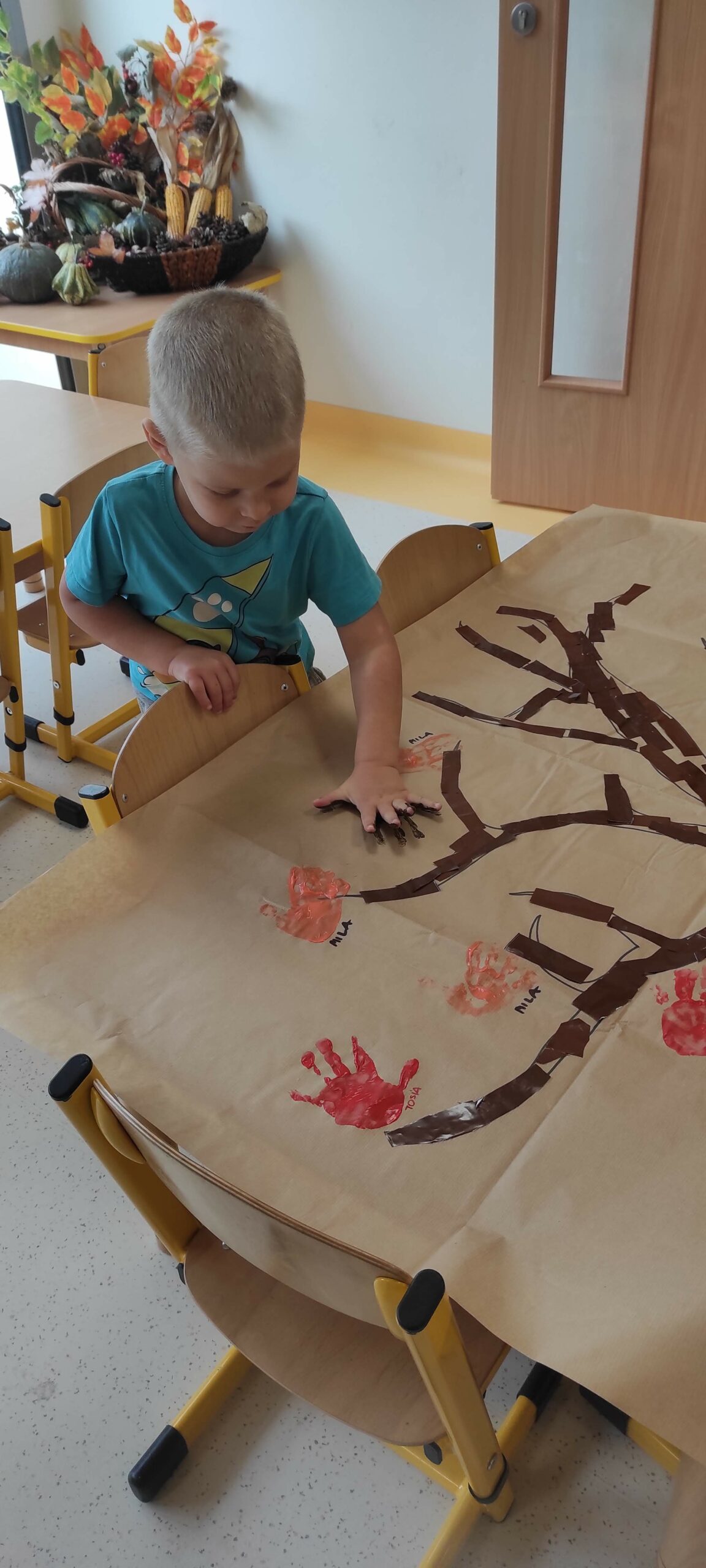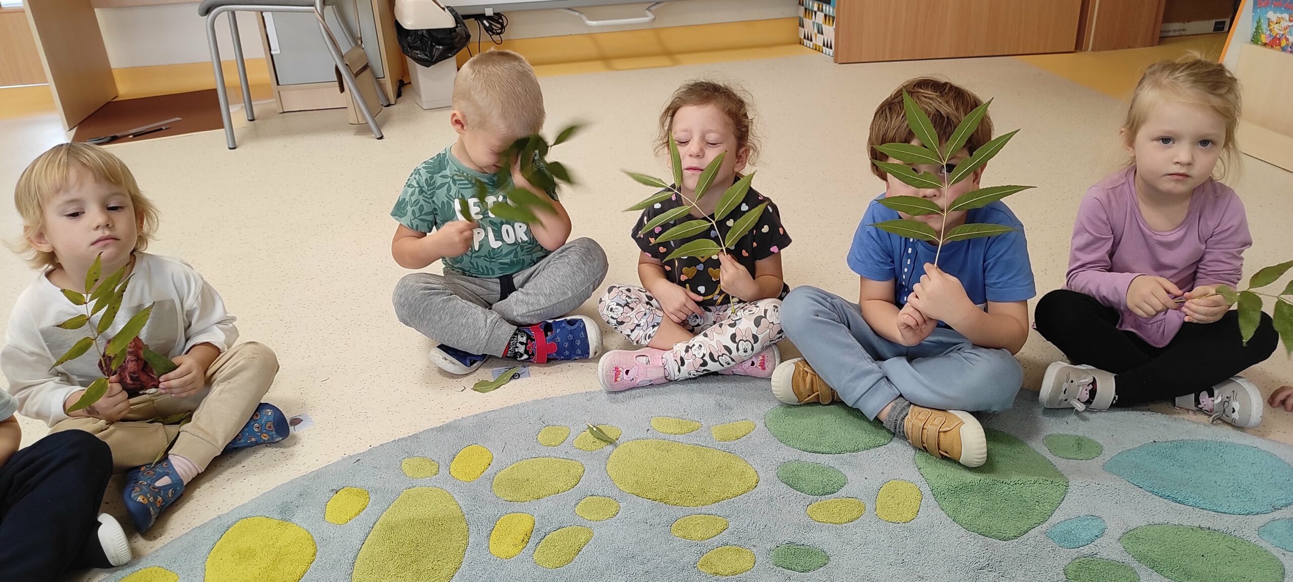 W październiku obchodzony jest Dzień Drzewa. W tym dniu Jeżyki wzięły udział w polisensorycznych zajęciach edukacyjnych. Po szczegółowym obejrzeniu drzew znajdujących się w naszym otoczeniu i omówieniu ich budowy z materiału przyrodniczego zgromadzonego w sali ułożyły drzewo. Dało to dzieciom świetną okazję do pobudzenia zmysłów dotyku, węchu i słuchu. Całość zakończyliśmy wspólnym wykonaniem plakatu „Jesienne drzewo”, w trakcie którego dzieci doskonaliły sprawność motoryczną dłoni.