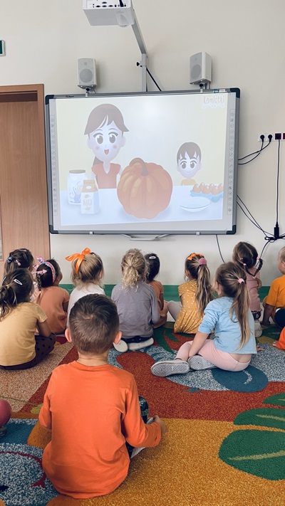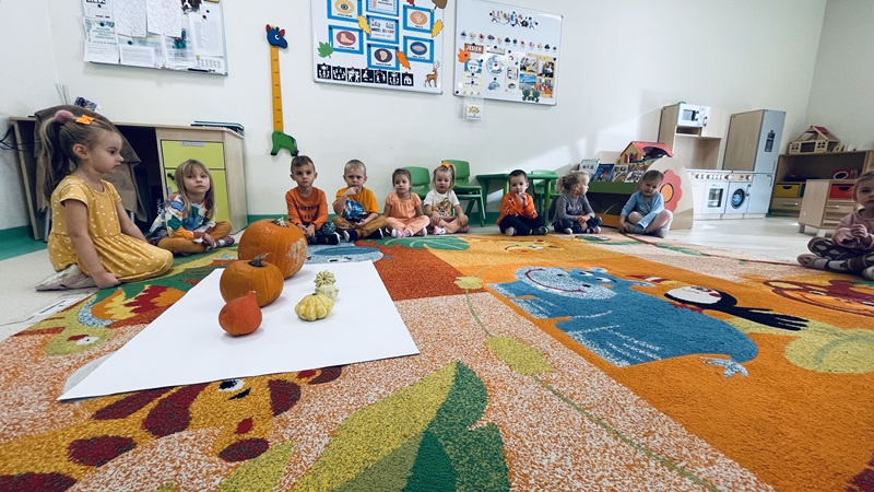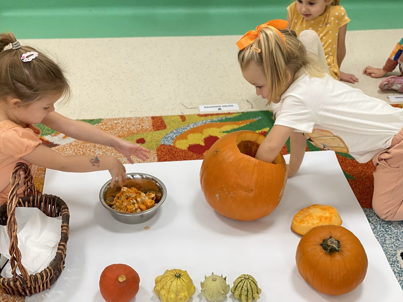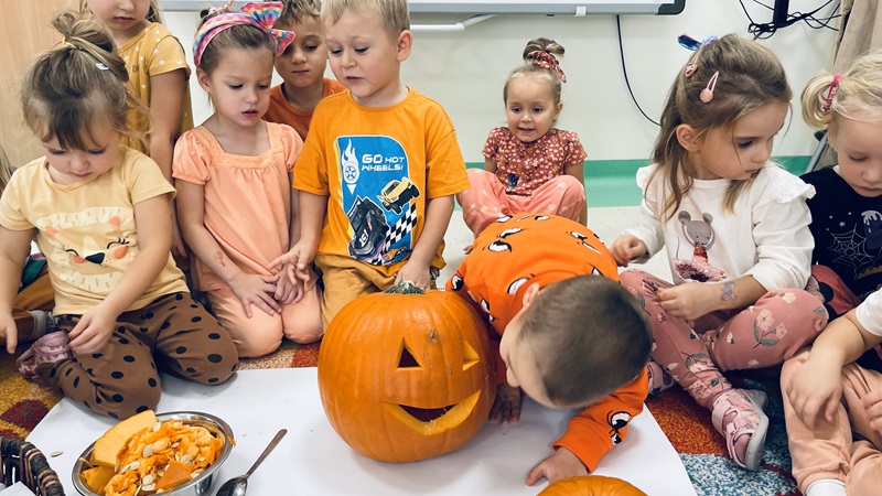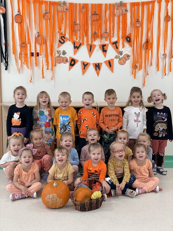 31-go października dzieci z grupy „Żabek” świętowały Dzień Dyni. Przedszkolaki zastanawiały się co można zrobić z dyni, jakie mają kolory, wielkości i kształty. Zatem liczyliśmy, porównywaliśmy, segregowaliśmy. Następnie dzieci wybrały środek dyni i dowiedziały się, że nie cała dynia jest twarda. Było to ciekawe doświadczenie sensoryczne. Z wielkiej dyni powstał lampion, który sprawił dzieciom wielką przyjemność, a całość zajęć podsumowaliśmy filmem edukacyjnym.