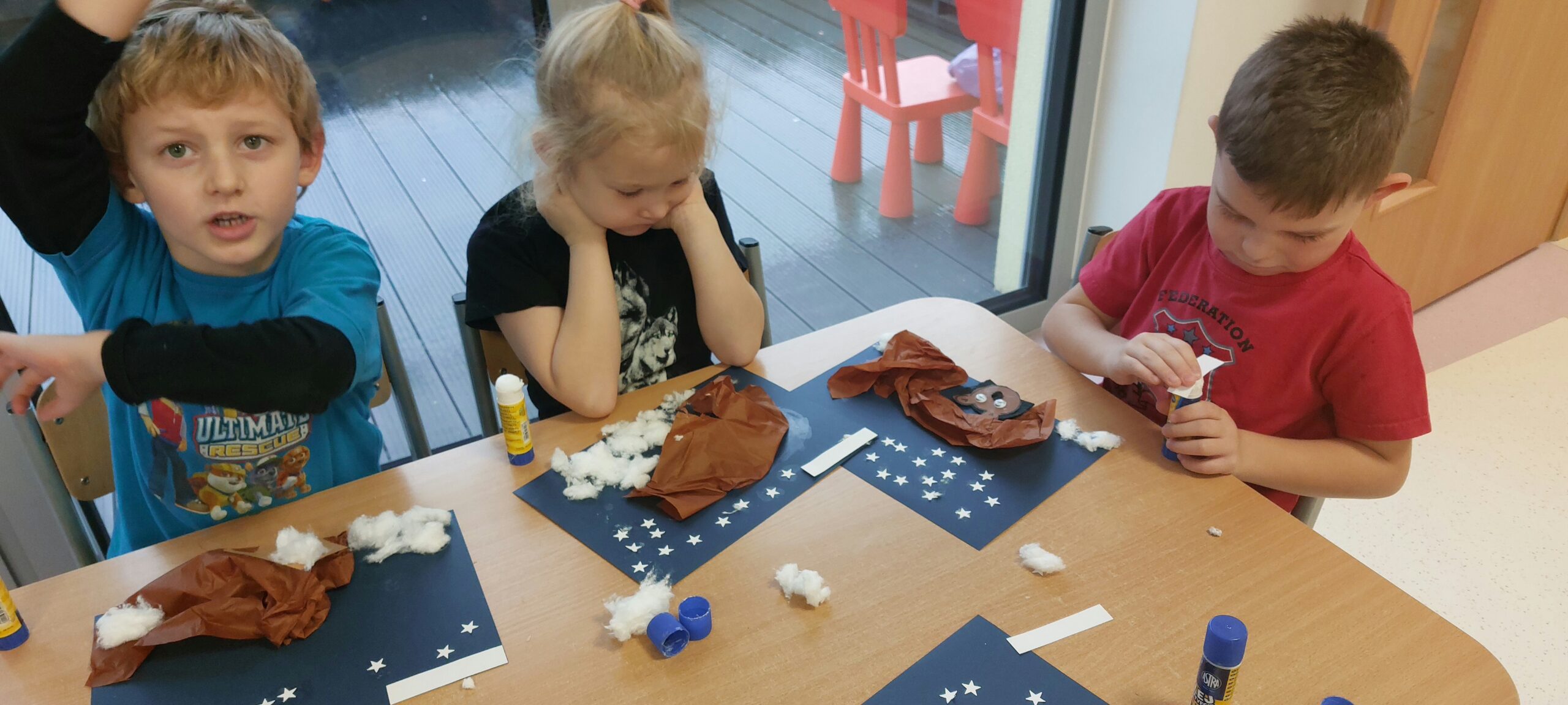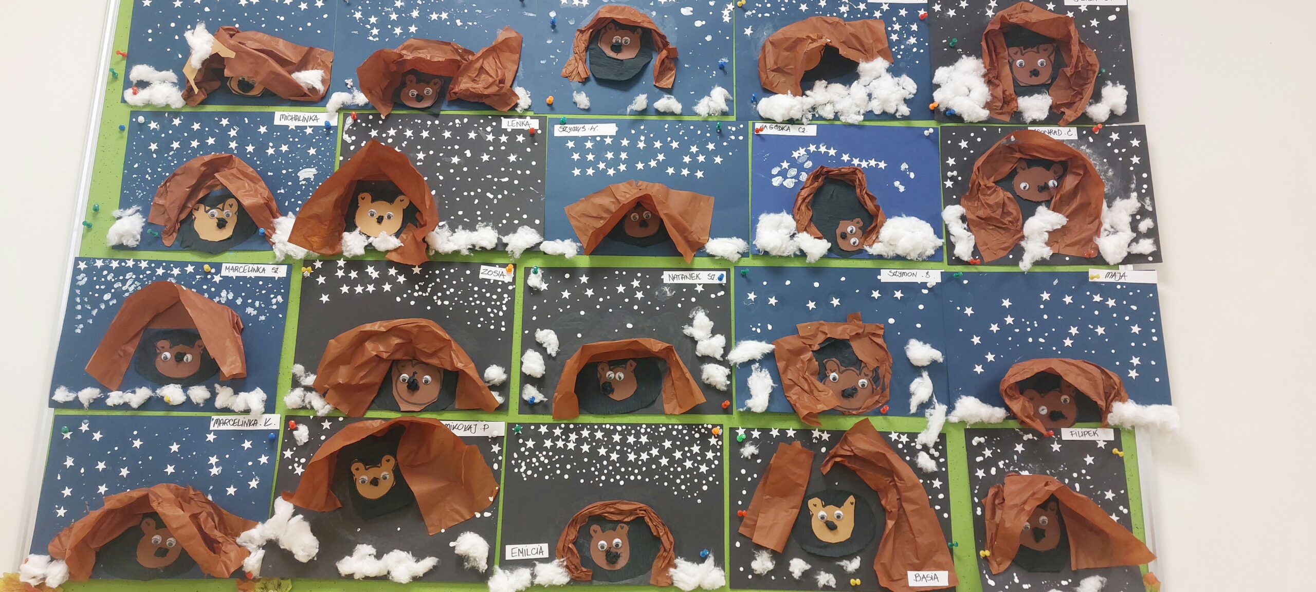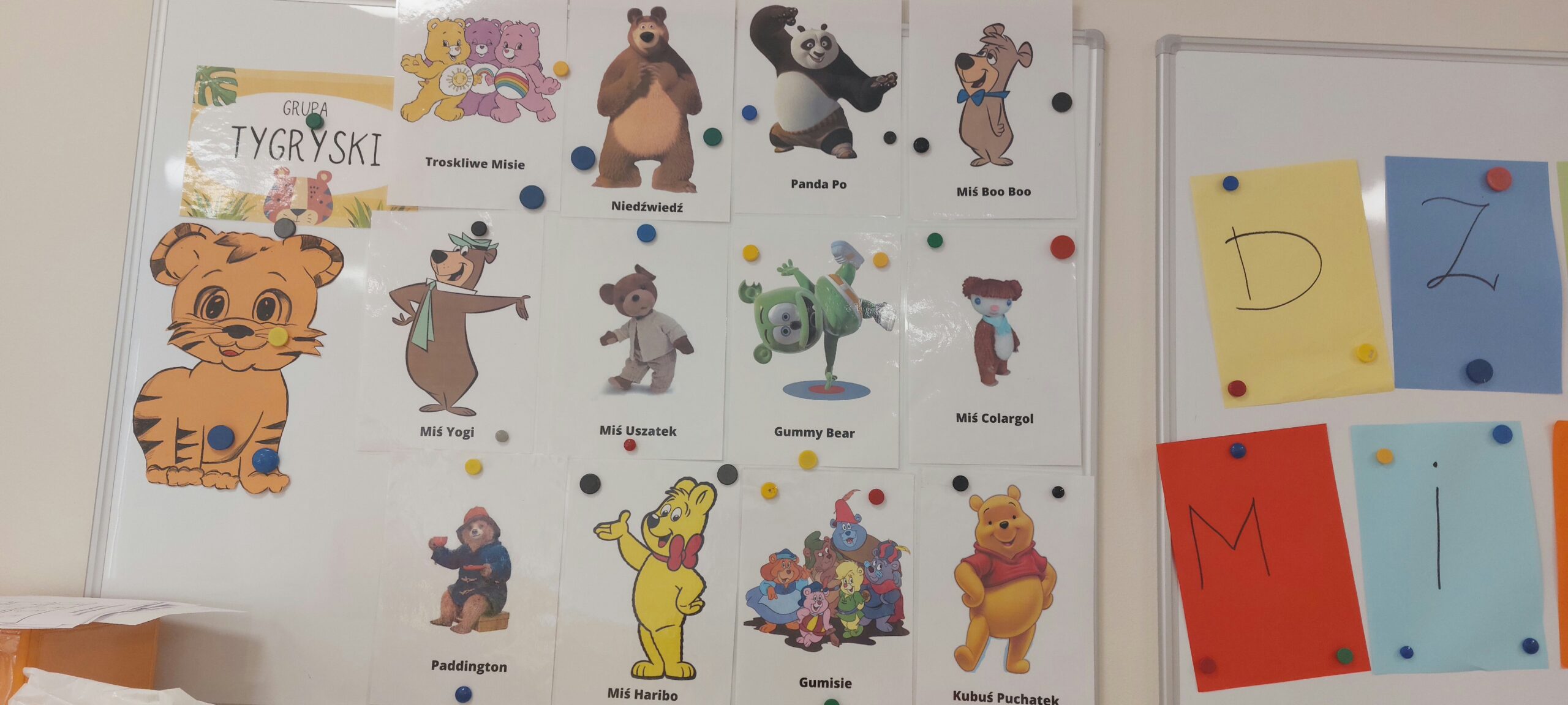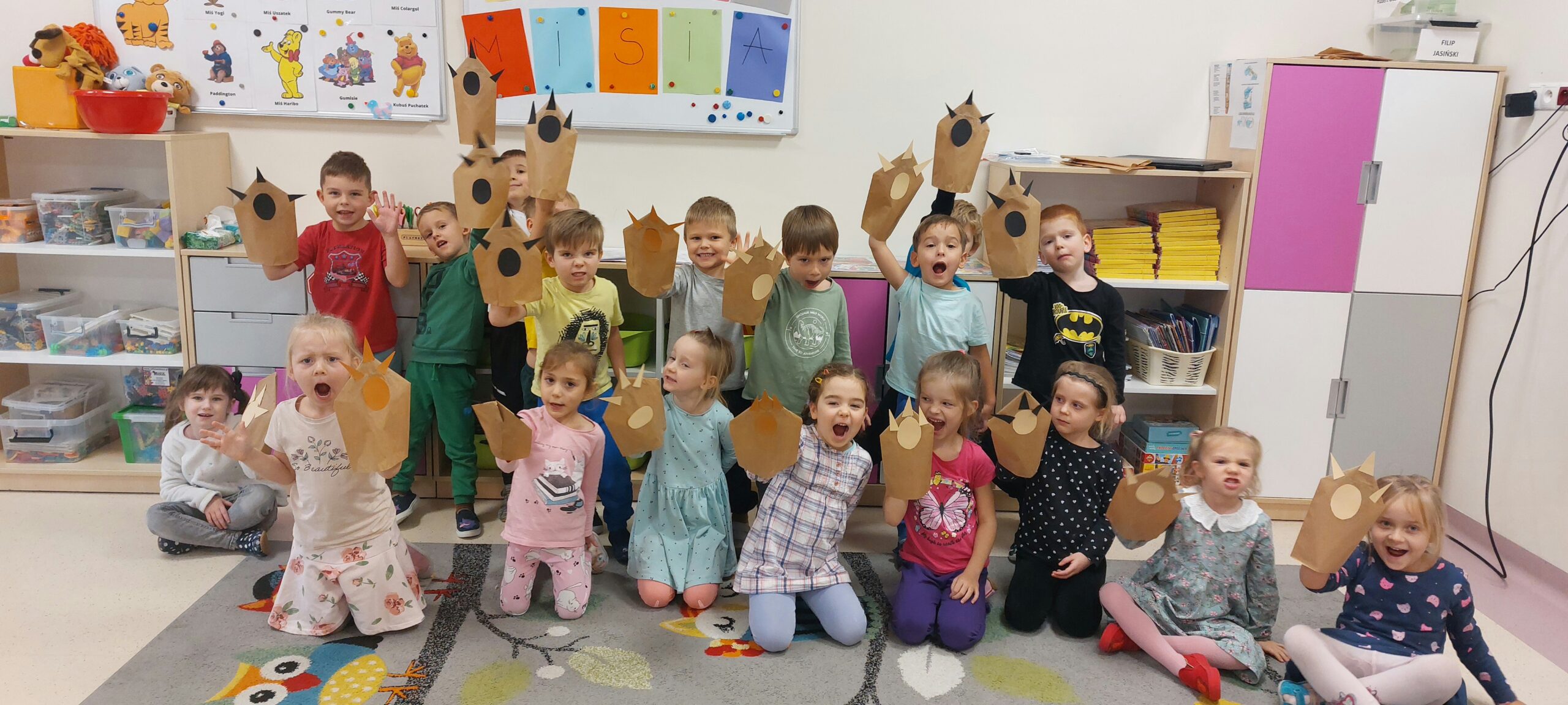 Tygryski przez dwa dni świętowały Dzień Pluszowego Misia. Robiły prace plastyczne- niedźwiadki w jaskini, tworzyły misiowe łapy, rozwiązywały zagadki o misiach określając, z których bajek pochodzą. Były też misiowe karty pracy oraz pląsy w rytm misiowej muzyki z pluszakami przyniesionymi z domu. Dzieci poznały również misie z bajek z dawnych lat- ,, Miś Uszatek” i ,,Miś Koralgol”.