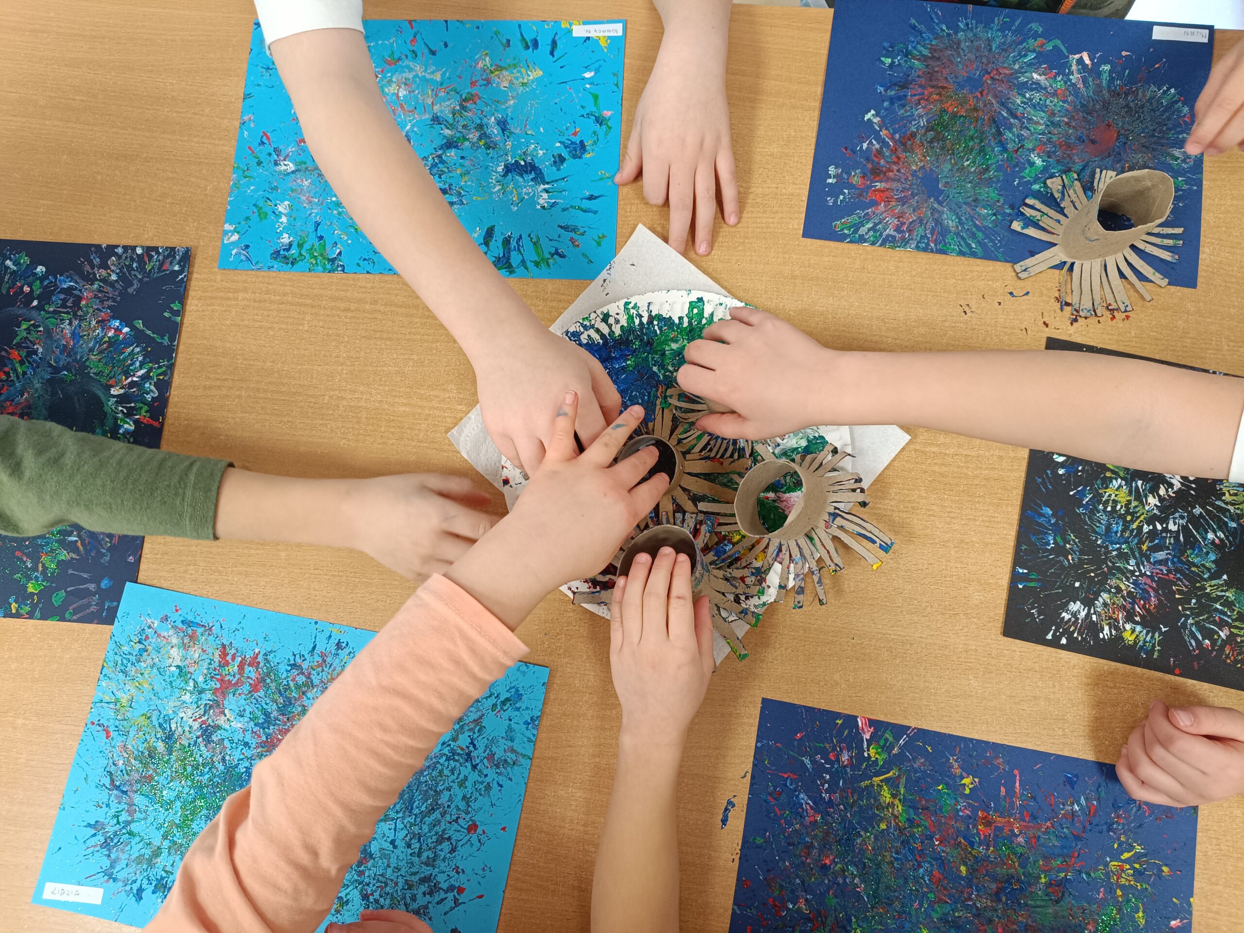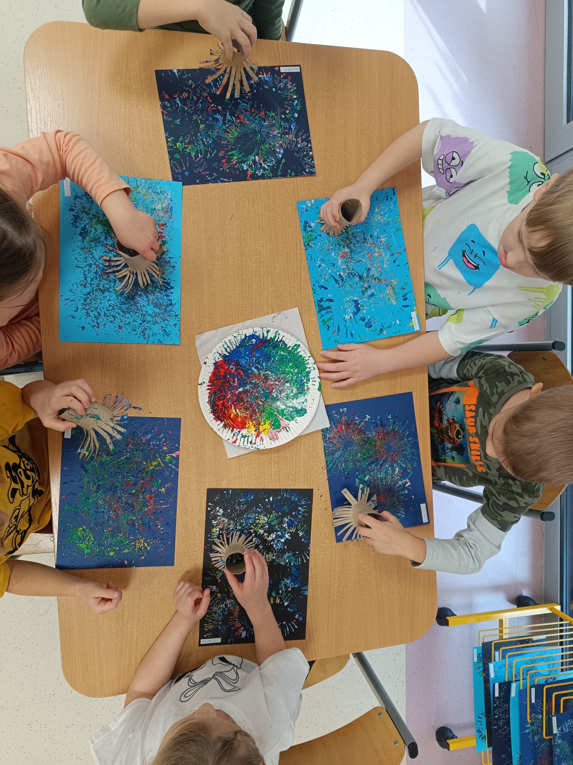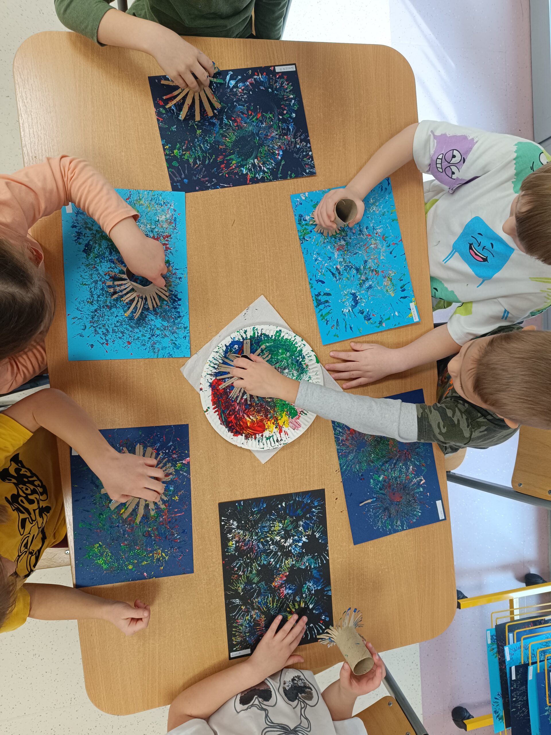 Dzieci z gr. Biedronki uwielbiają poznawać nowe techniki plastyczne. Sylwestrowe fajerwerki były inspiracją do kreatywnych prac plastycznych, które nie tylko ozdobiły naszą tablicę ale również przyczyniły się usprawnienia naszych palców i rąk – przygotowujemy się do pisania 🙂