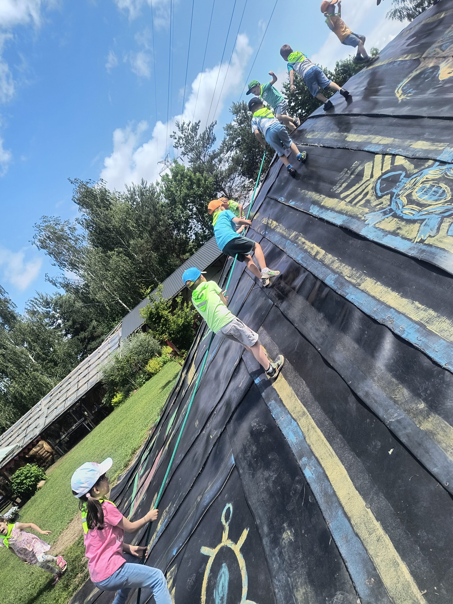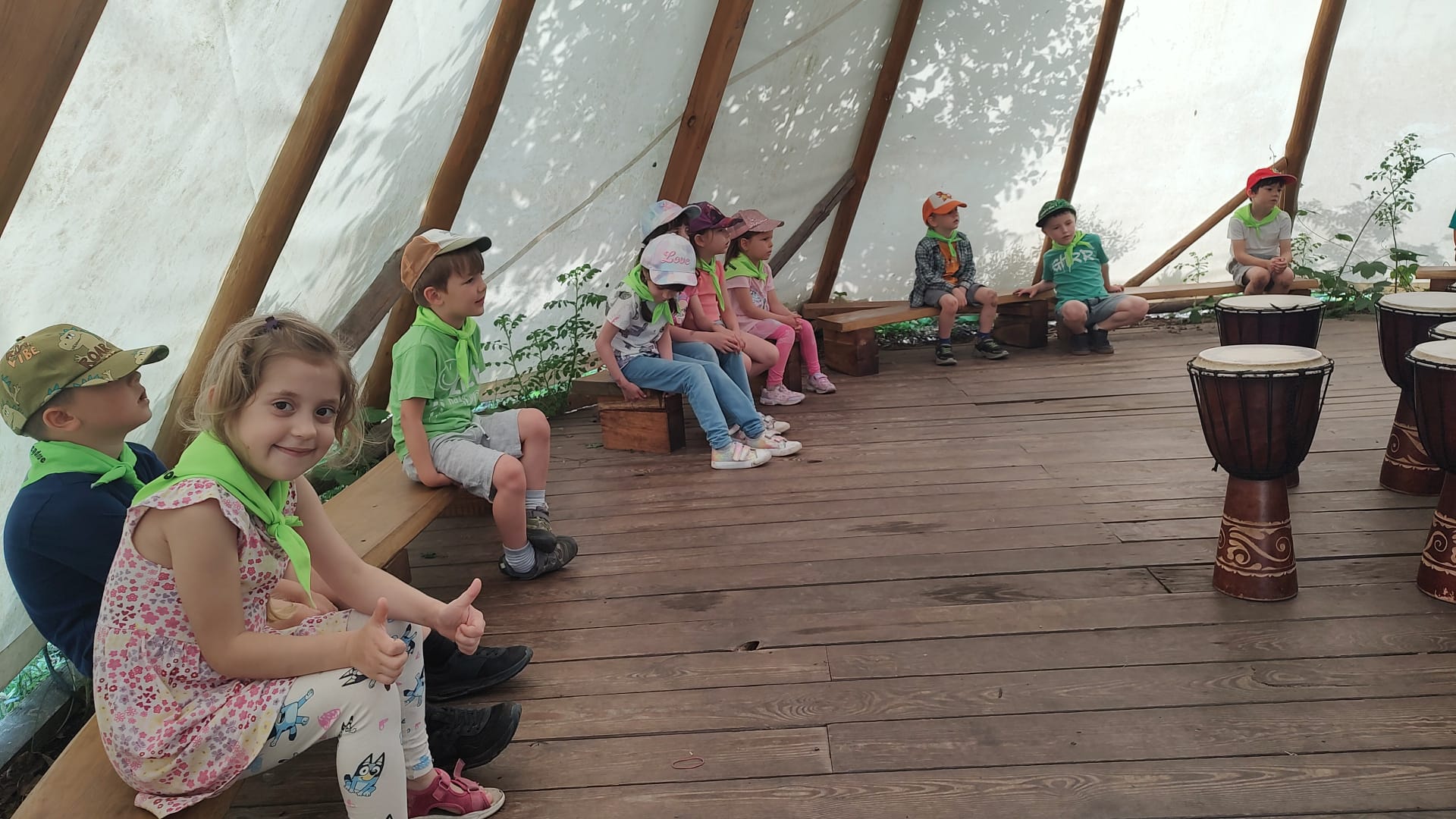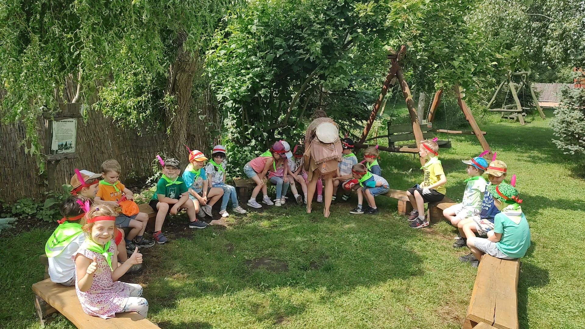 W czwartek grupa Jagódek wybrała się na pełną wrażeń wycieczkę do Wioski Indiańskiej w Zabrodziu. Na dzieci czekała niesamowita podróż do świata rdzennych mieszkańców Ameryki – z tipi, indiańskimi opowieściami, tańcami i mnóstwem aktywności na świeżym powietrzu. Przedszkolaki poznały dawne zwyczaje i symbole indiańskie, własnoręcznie tworzyły pióropusze, a nawet próbowały swoich sił w łucznictwie! Był też czas na wspólną zabawę, piknik i integrację. Pogoda dopisała, humory również – a wspomnienia z tej wyjątkowej wyprawy zostaną z nami na długo!