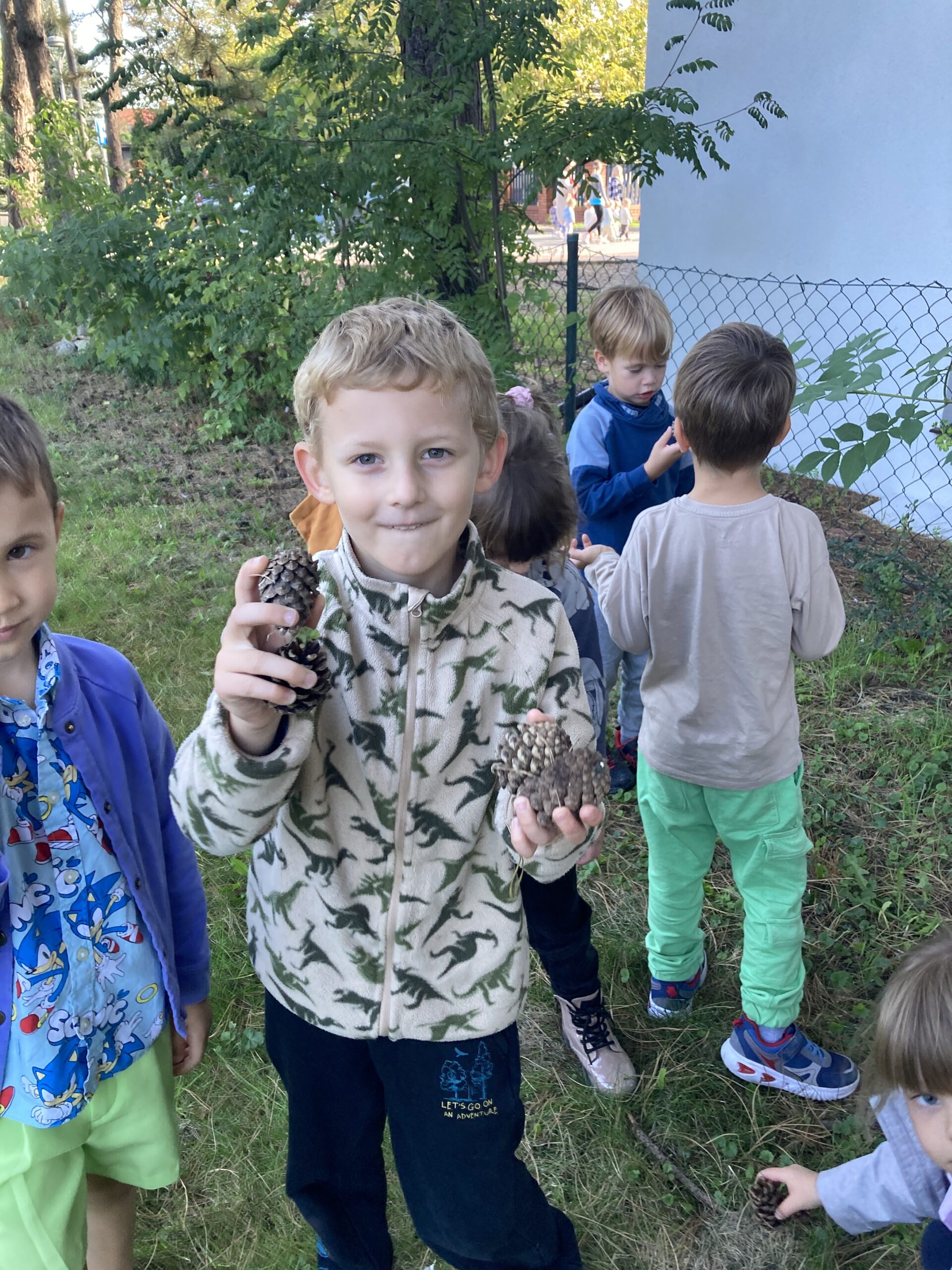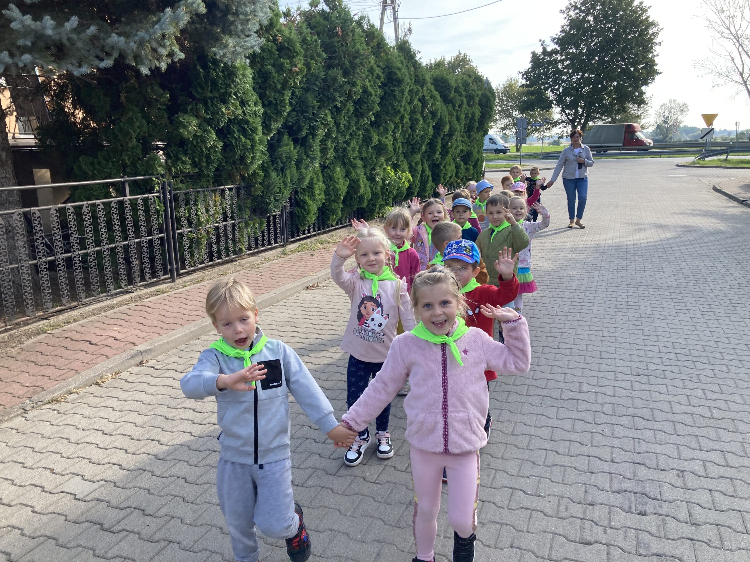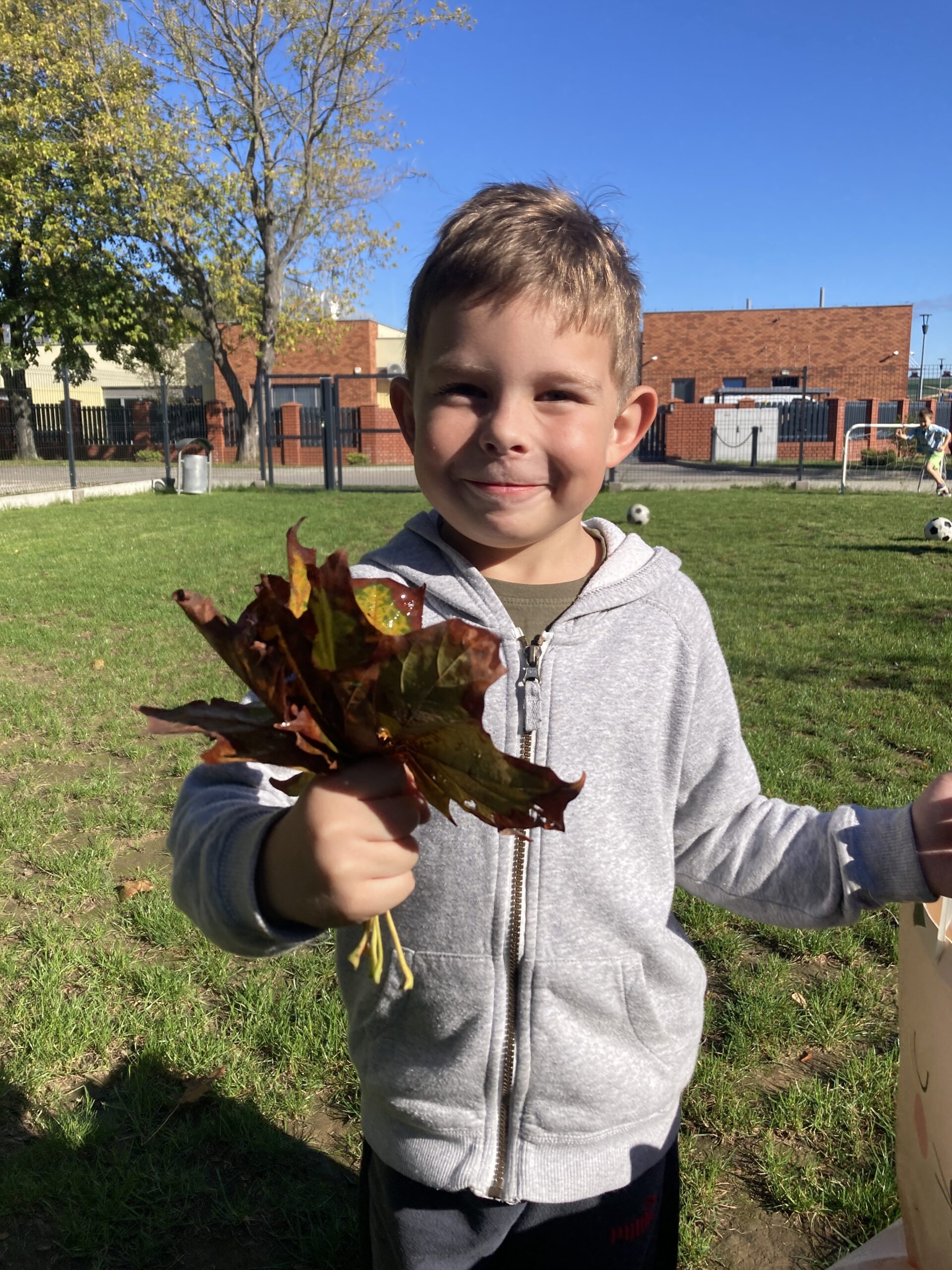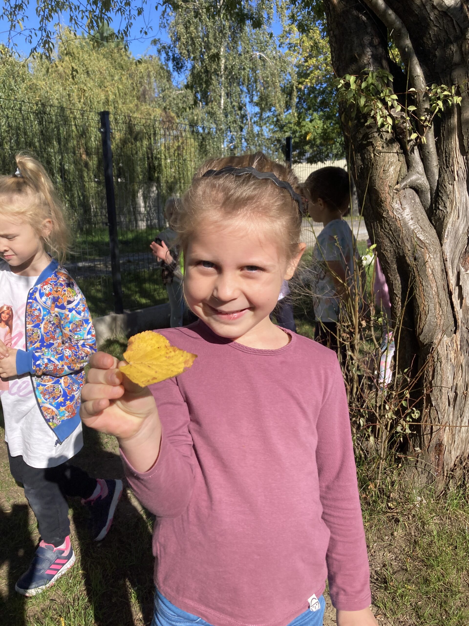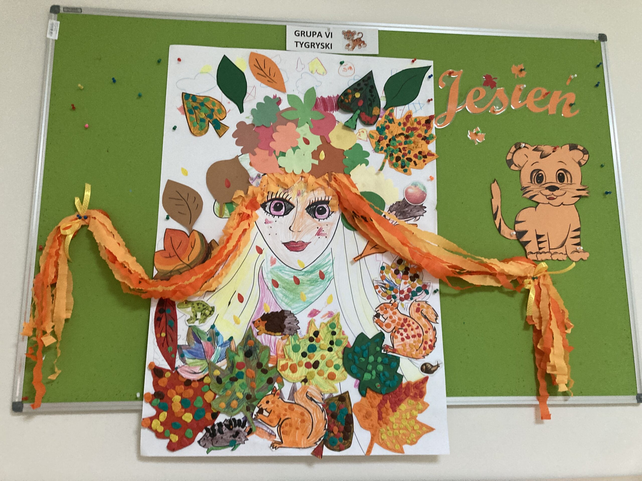 Jesień to piękna pora roku, pełna kolorów i cudownych widoków dlatego Tygryski wyruszyły na spacer, by obserwować zmiany, jakie zaszły w przyrodzie. Przedszkolaki bezpośrednio obcowały z przyrodą, rozpoznawały rodzaje drzew po liściach i owocach oraz zbierały jesienne skarby do kosza w celu wzbogacenia kącika przyrody. Po powrocie do przedszkola namalowały kolorowe liście, przygotowały plakat „Pani Jesień” oraz kosz z darami Jesieni.