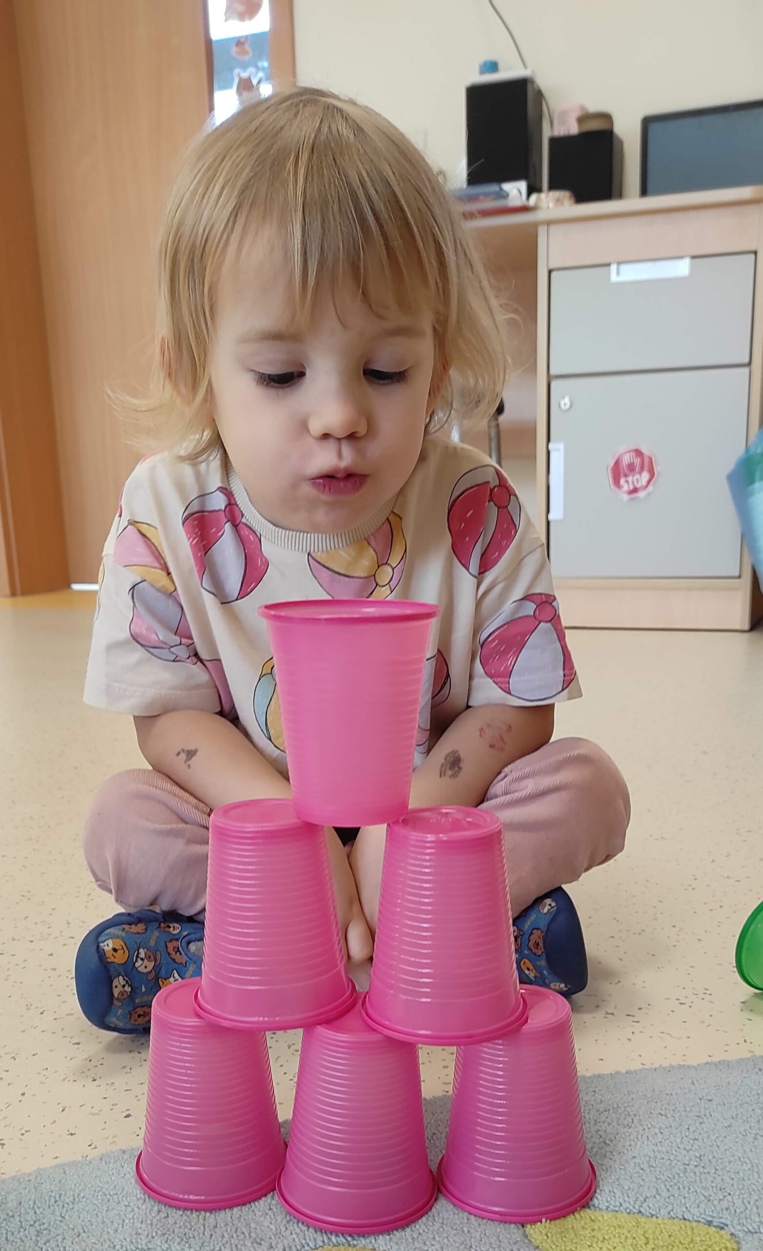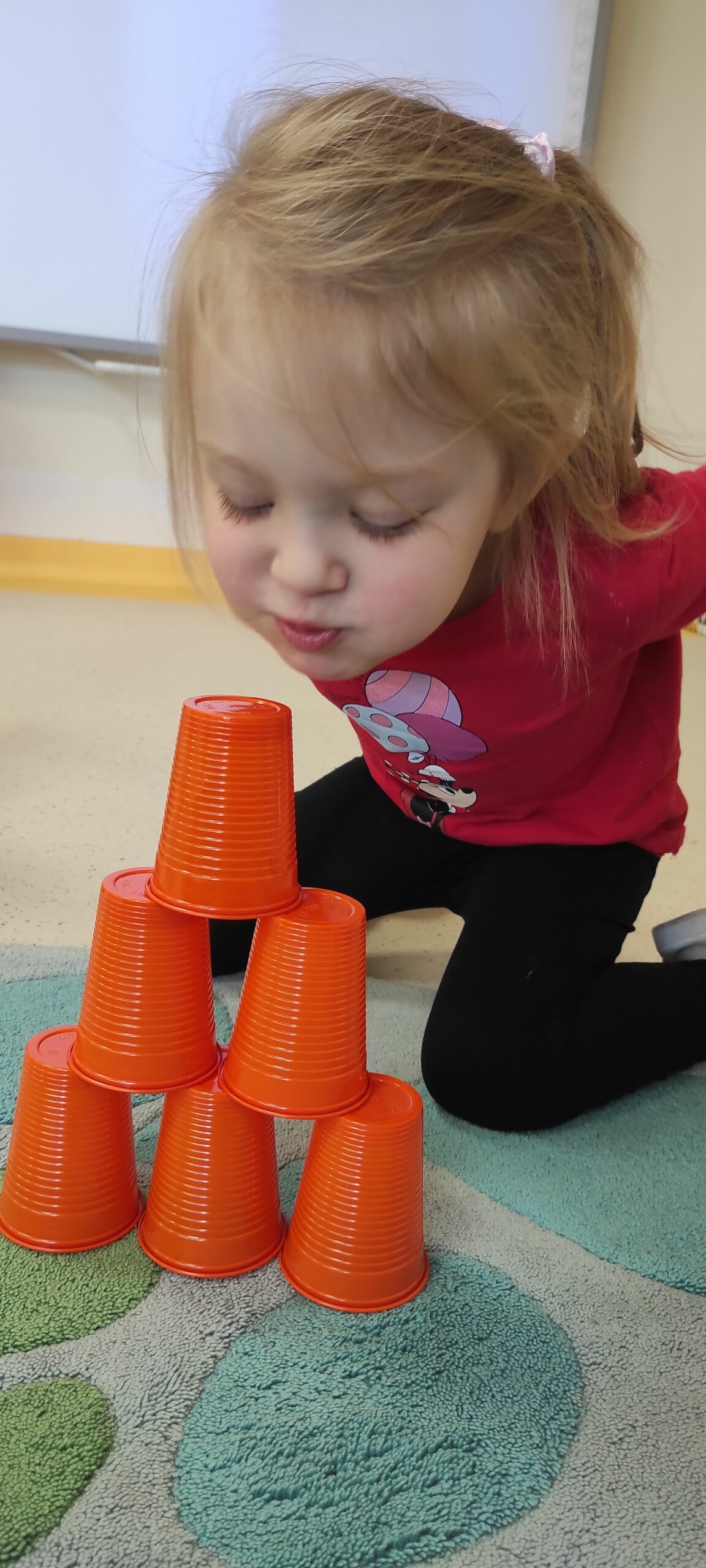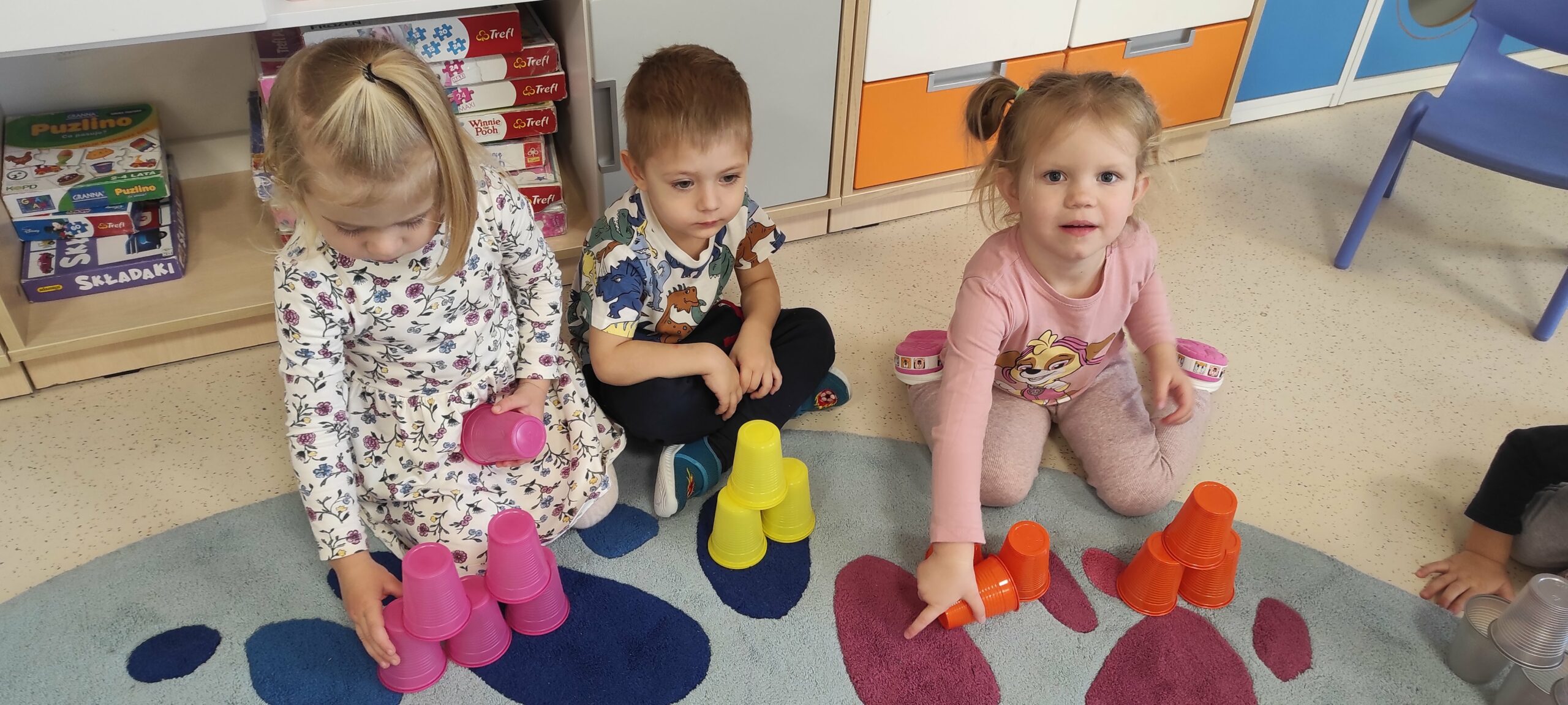 Kodowanie w przedszkolu, kodowanie dla dzieci to wprowadzenie ich w świat programowania oraz sposób nauki podstaw programowania. Jednym z celów kodowania w przedszkolu jest nauka logicznego myślenia, zadaniowego podejścia do problemów, kształcenie umiejętności matematycznych i analitycznych. Naszą przygodę z kodowaniem rozpoczęliśmy od zabaw „przy okazji” . W trakcie czytania doskonale znanego opowiadania „Trzy świnki” dzieci postanowiły zabawić się w budowniczych domów. Każde z nich wybrało sobie kolorowe kubeczki, z których samodzielnie, wg własnego pomysłu miało stworzyć konstrukcję domu. Następnym zadaniem było zbudowanie wieży wg przedstawionego wzoru. Budowania, poprawiania i podglądania innych nie brakowało; najwięcej jednak frajdy sprawiła zabawa w wilka zdmuchującego domy. Okazało się, że skierowanie strumienia powietrza na budowlę tak, aby się ona przewróciła, wcale nie jest prostym zadaniem.
