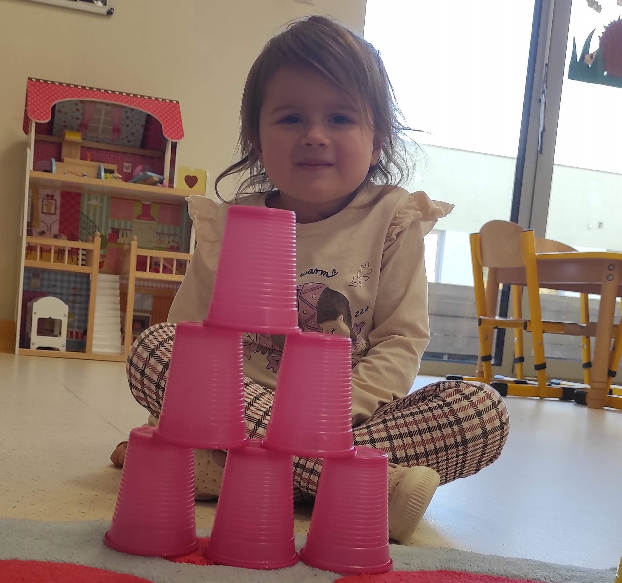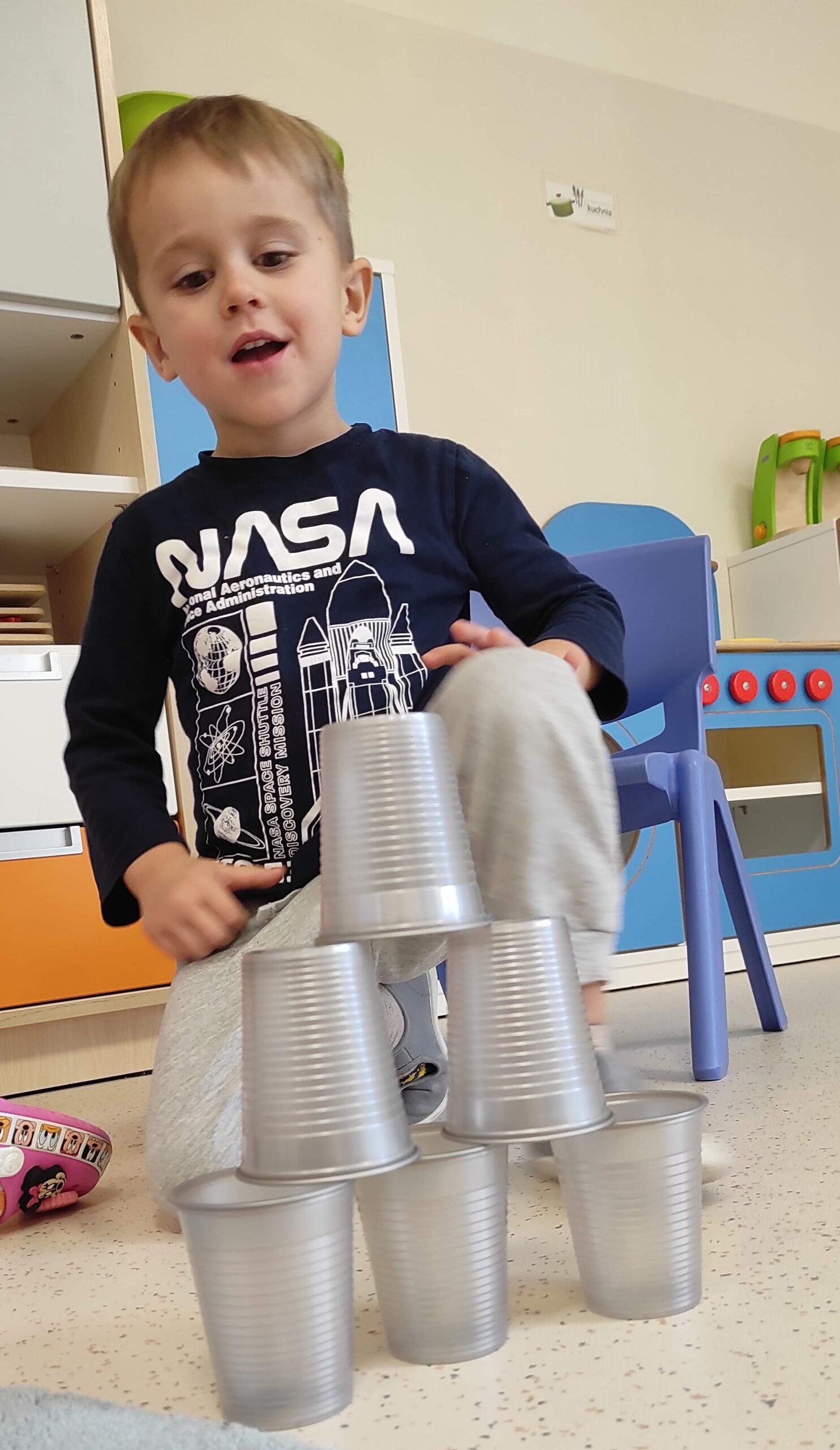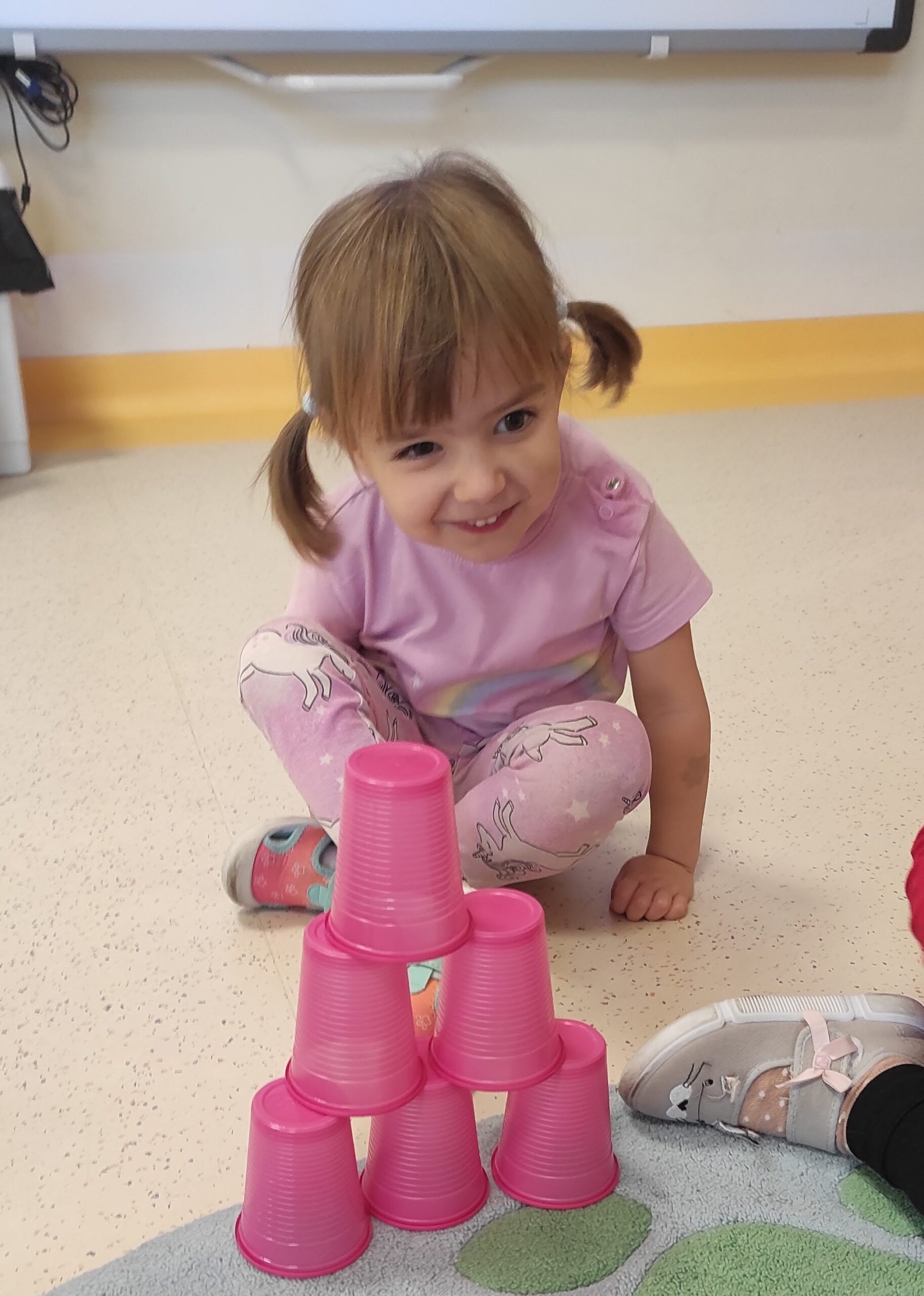 Kodowanie w przedszkolu, kodowanie dla dzieci to wprowadzenie ich w świat programowania oraz sposób nauki podstaw programowania. Jednym z celów kodowania w przedszkolu jest nauka logicznego myślenia, zadaniowego podejścia do problemów, kształcenie umiejętności matematycznych i analitycznych. Naszą przygodę z kodowaniem rozpoczęliśmy od zabaw „przy okazji” . W trakcie czytania doskonale znanego opowiadania „Trzy świnki” dzieci postanowiły zabawić się w budowniczych domów. Każde z nich wybrało sobie kolorowe kubeczki, z których samodzielnie, wg własnego pomysłu miało stworzyć konstrukcję domu. Następnym zadaniem było zbudowanie wieży wg przedstawionego wzoru. Budowania, poprawiania i podglądania innych nie brakowało; najwięcej jednak frajdy sprawiła zabawa w wilka zdmuchującego domy. Okazało się, że skierowanie strumienia powietrza na budowlę tak, aby się ona przewróciła, wcale nie jest prostym zadaniem.