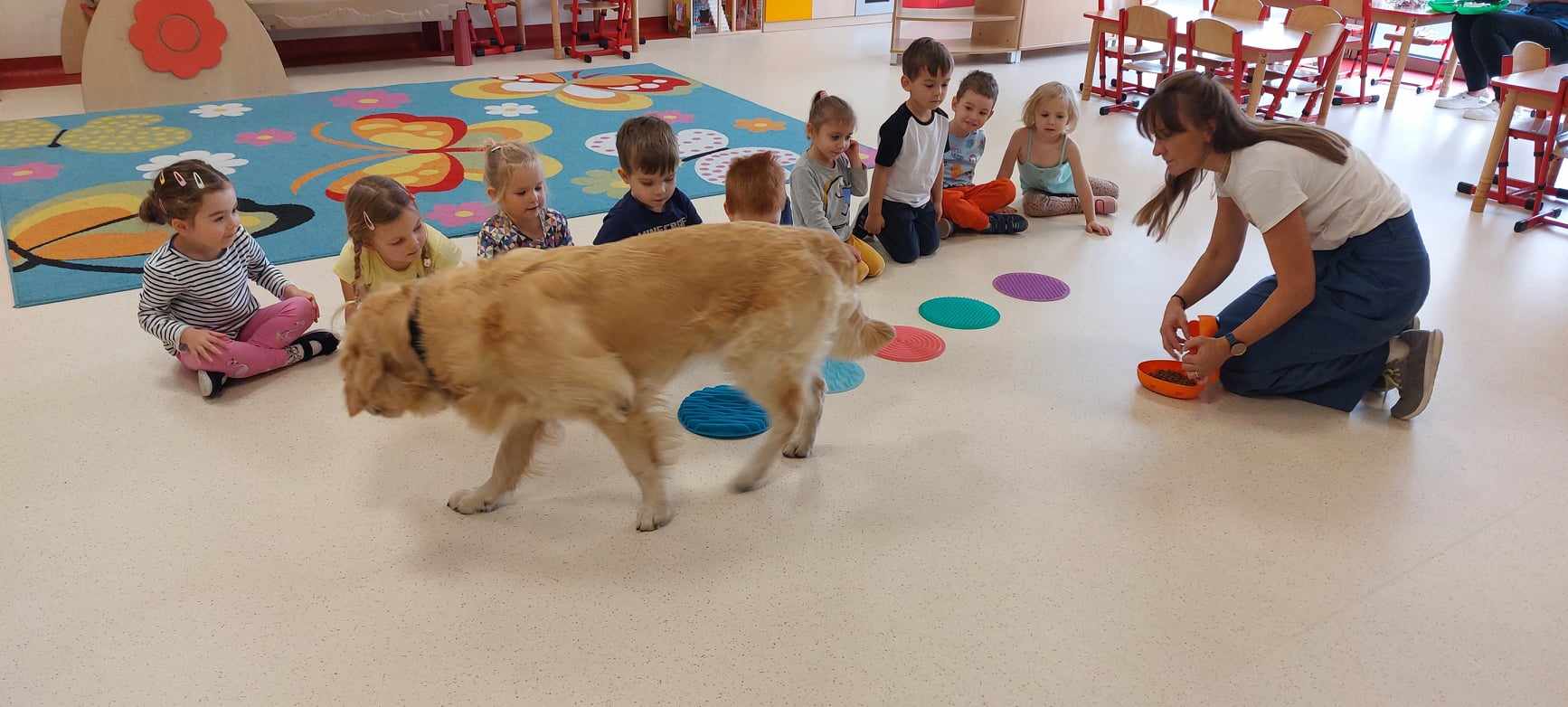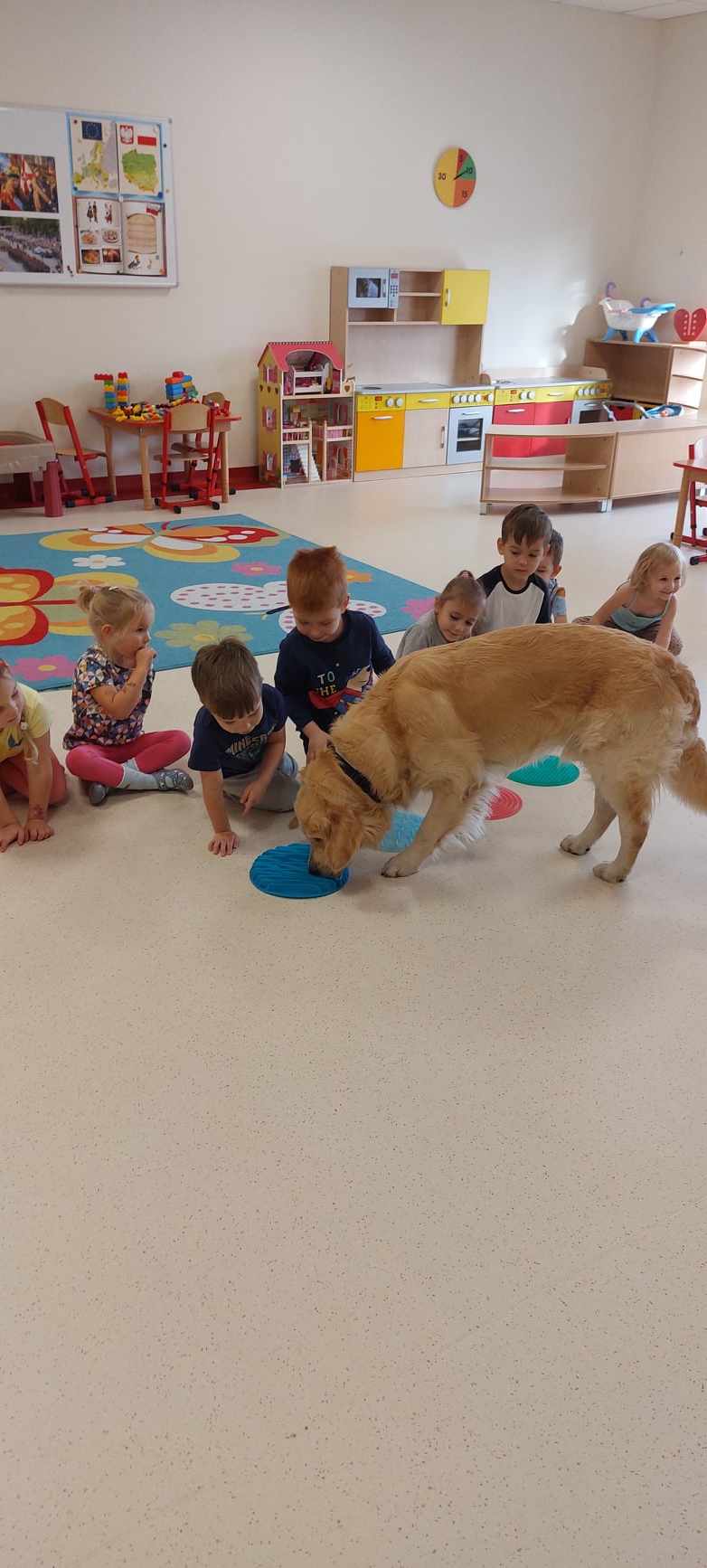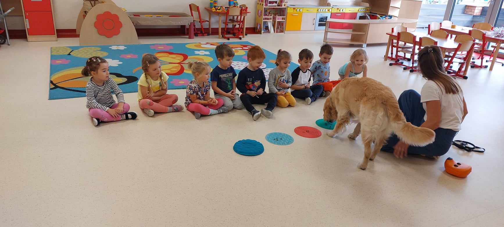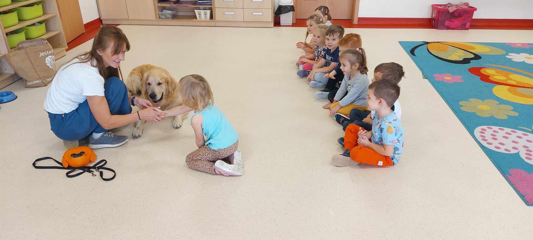 „Tygryski” gościły specjalnego czworonożnego gościa- pieska Leona:). Leon to nasz dobry znajomy z ubiegłego roku, więc bardzo cieszyliśmy się, że znowu zechciał nas odwiedzić w przedszkolu. Przypomnieliśmy sobie zasady obchodzenia i zabawy z pieskiem, żeby ten czuł się dobrze, a my bezpiecznie. Leoś zaprezentował nam swoje umiejętności oraz sztuczki -największą z nich jest sztuka cierpliwości, której my nadal się uczymy 😉 Leosiu odwiedzaj nas częściej!
