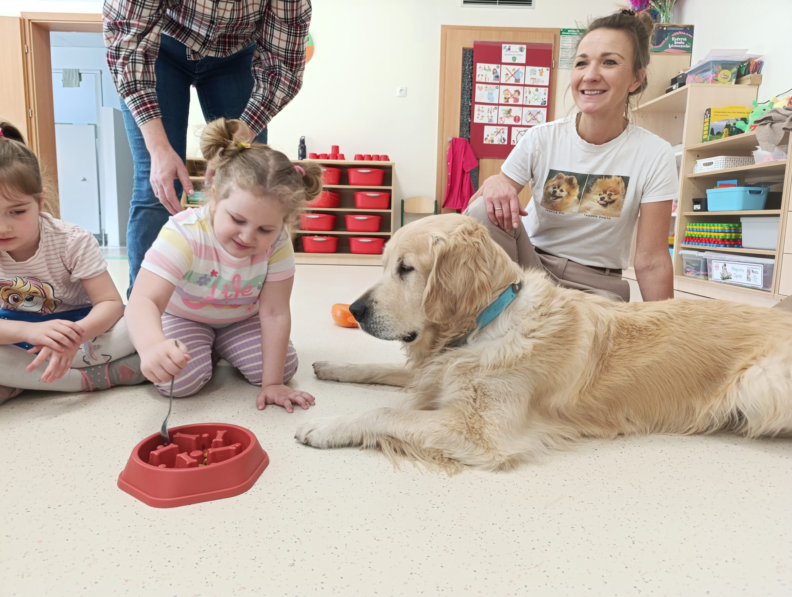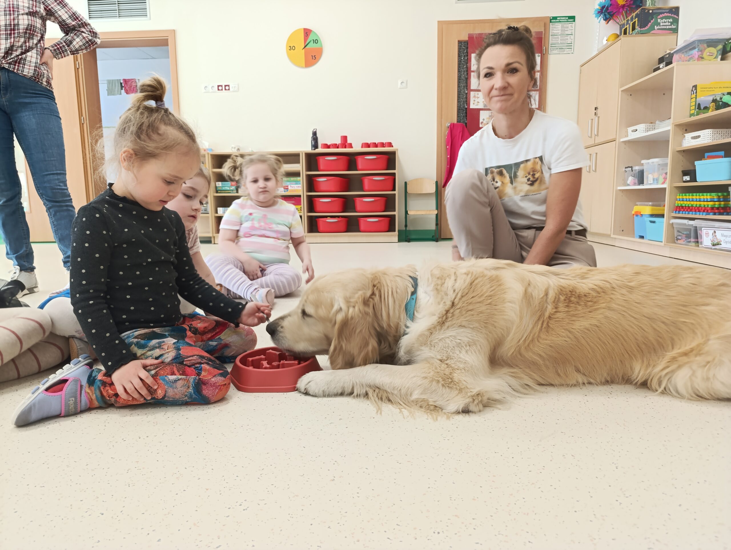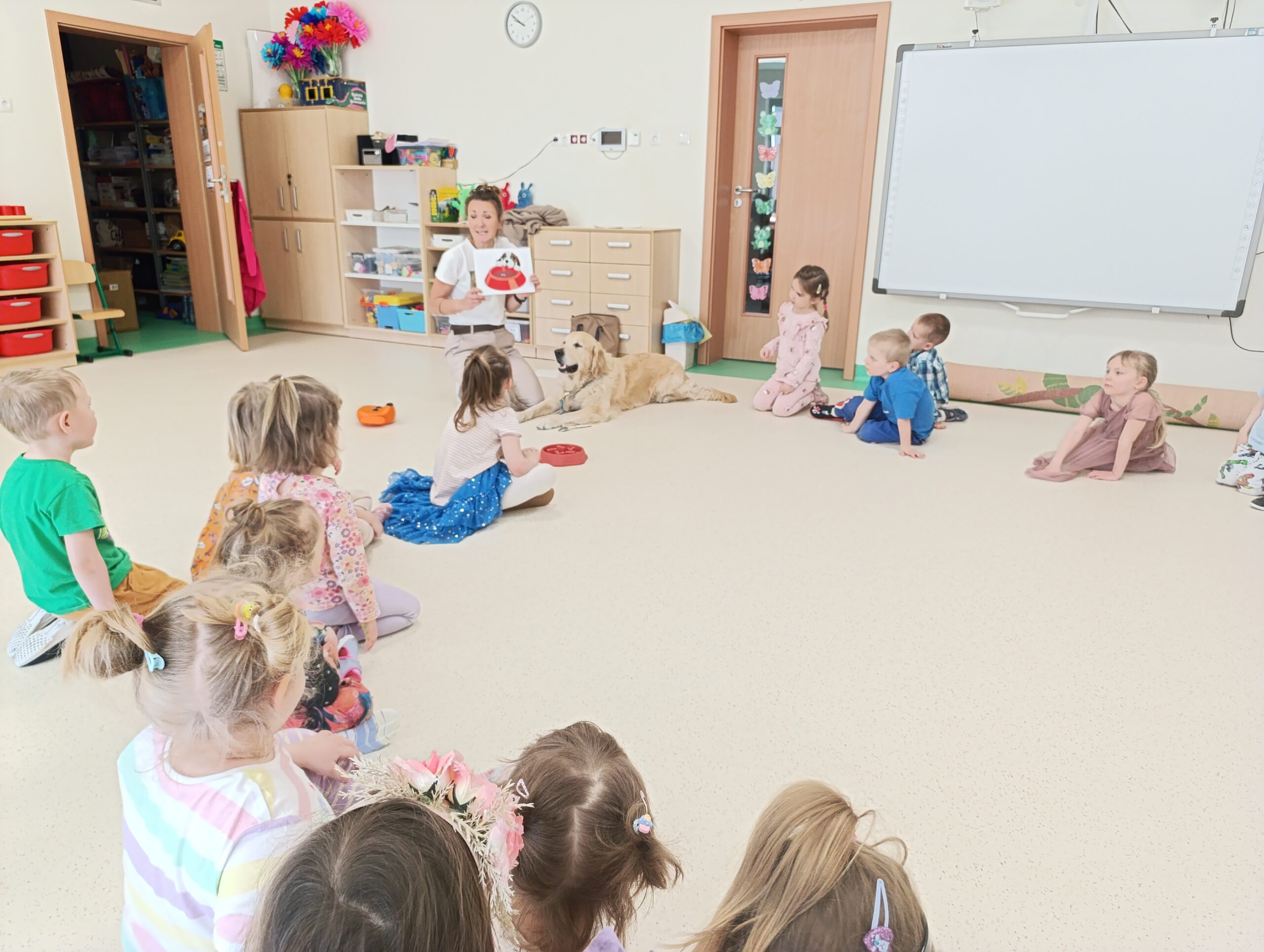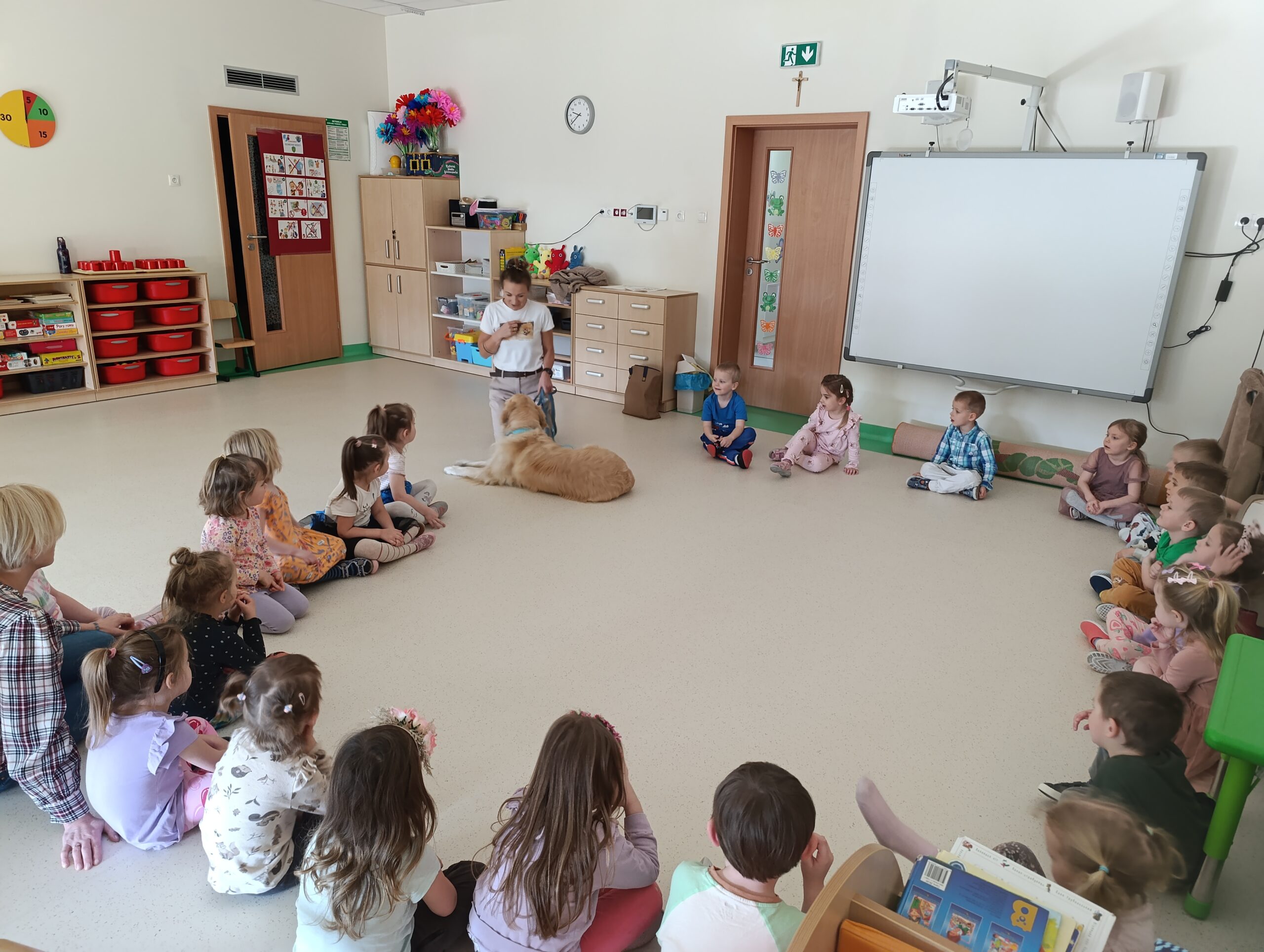 W środę 19 marca Żabki odwiedził pies terapeutyczny Leoś wraz ze swoją opiekunką- panią Anią. Przedszkolaki dowiedziały się jak należy zachować się w obecności psa oraz jak się troszczyć o pupila. Pani Ania przeprowadziła zabawy edukacyjne z elementami dogoterapii, której celem jest wszechstronny rozwój dzieci, dostarczanie pozytywnego bodźca i satysfakcji z przebywania z psim przyjacielem.