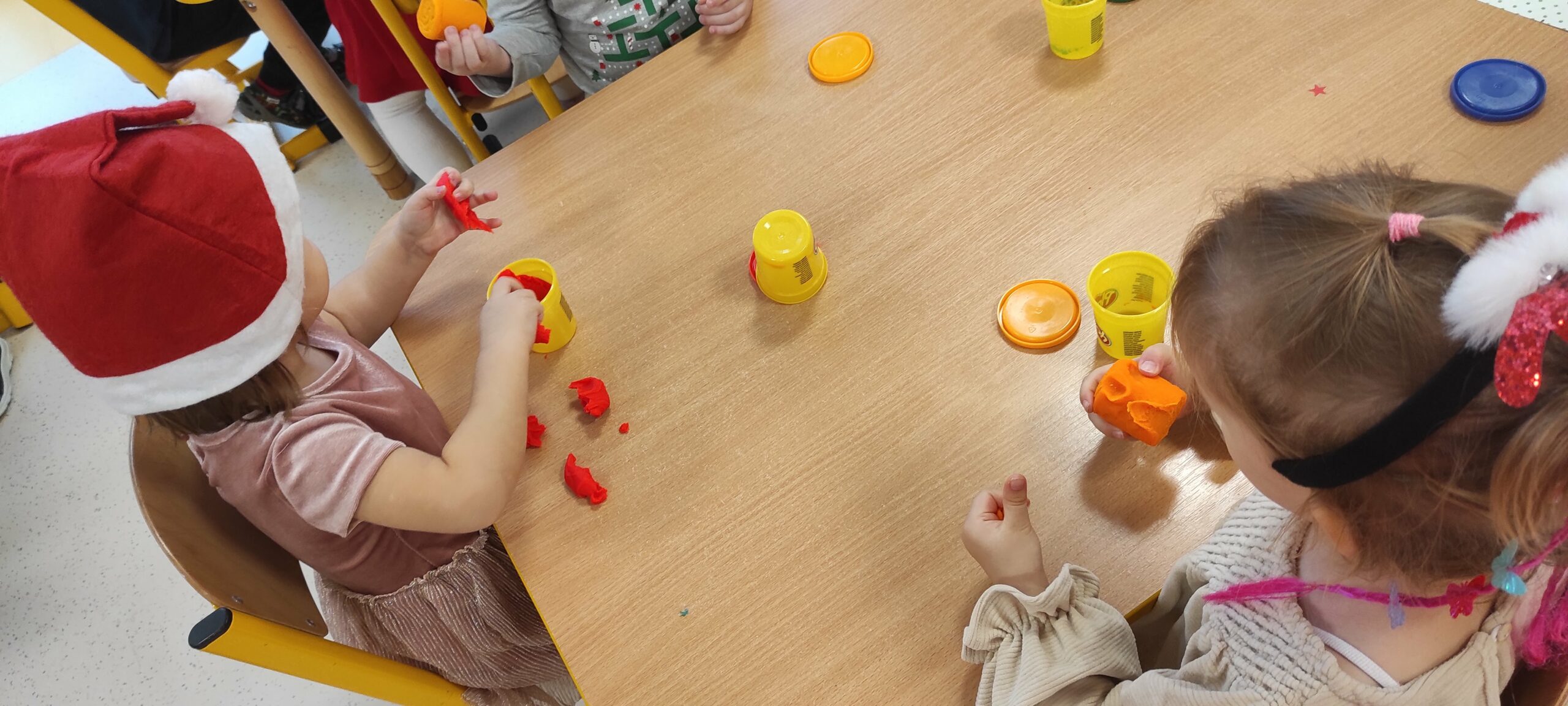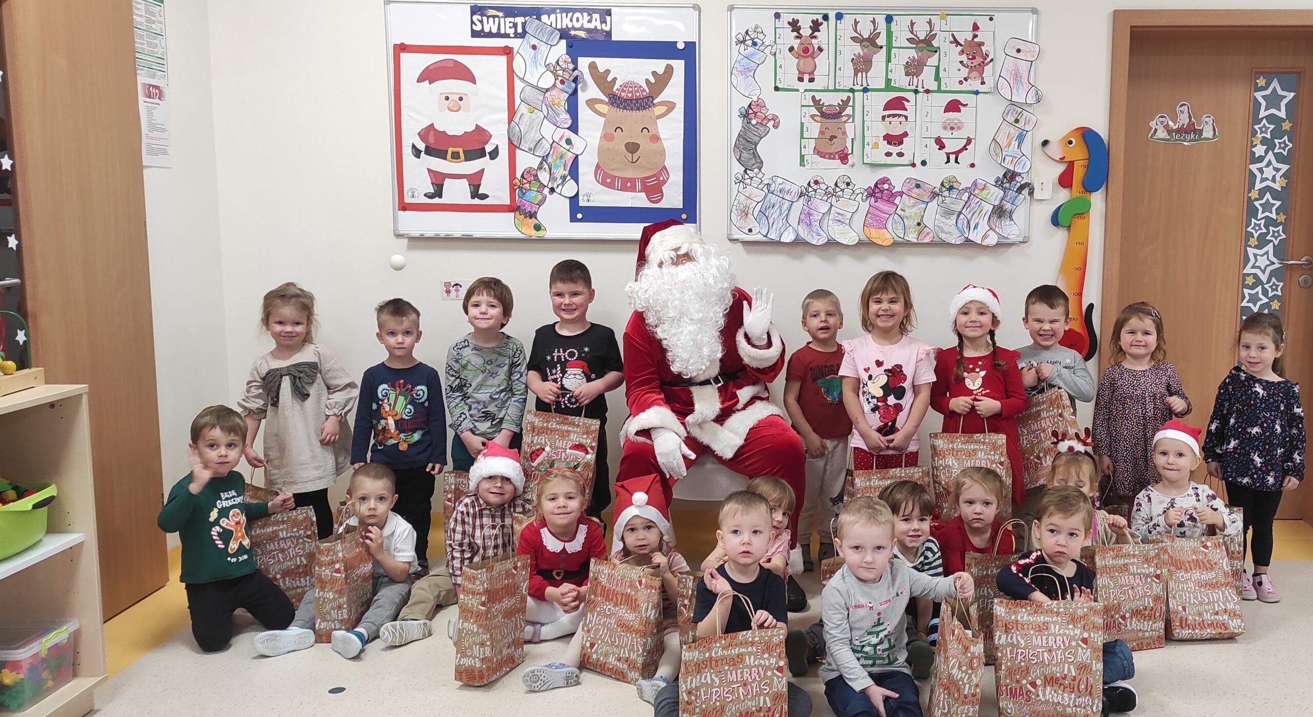 Tak , tak, to 6 grudnia, we własnej osobie, ten zacny gość odwiedził dzieci z grupy II. Mikołaj przybył z dwoma workami pełnymi prezentów. Mimo obaw i lęków niektórych dzieci, dał się poznać jako ciepła, pełna sympatii i uśmiechu osoba. Mało tego przyniósł podarunki dla każdego dziecka. To przełamało wszelkie lody i na twarzach dzieci zagościły szerokie uśmiechy. Gdy Mikołaj popędził do następnych oczekujących, Jeżyki rozpakowały prezenty i miały okazję poćwiczyć swoje rączki ugniatając, wałkując, tocząc przyniesioną im ciastolinę. To był niesamowity, pełen emocji i oczekiwania dzień.