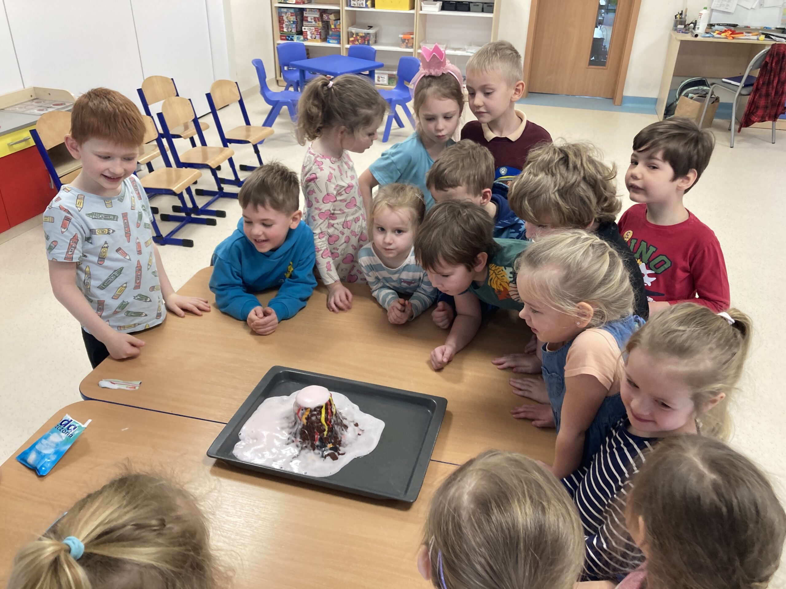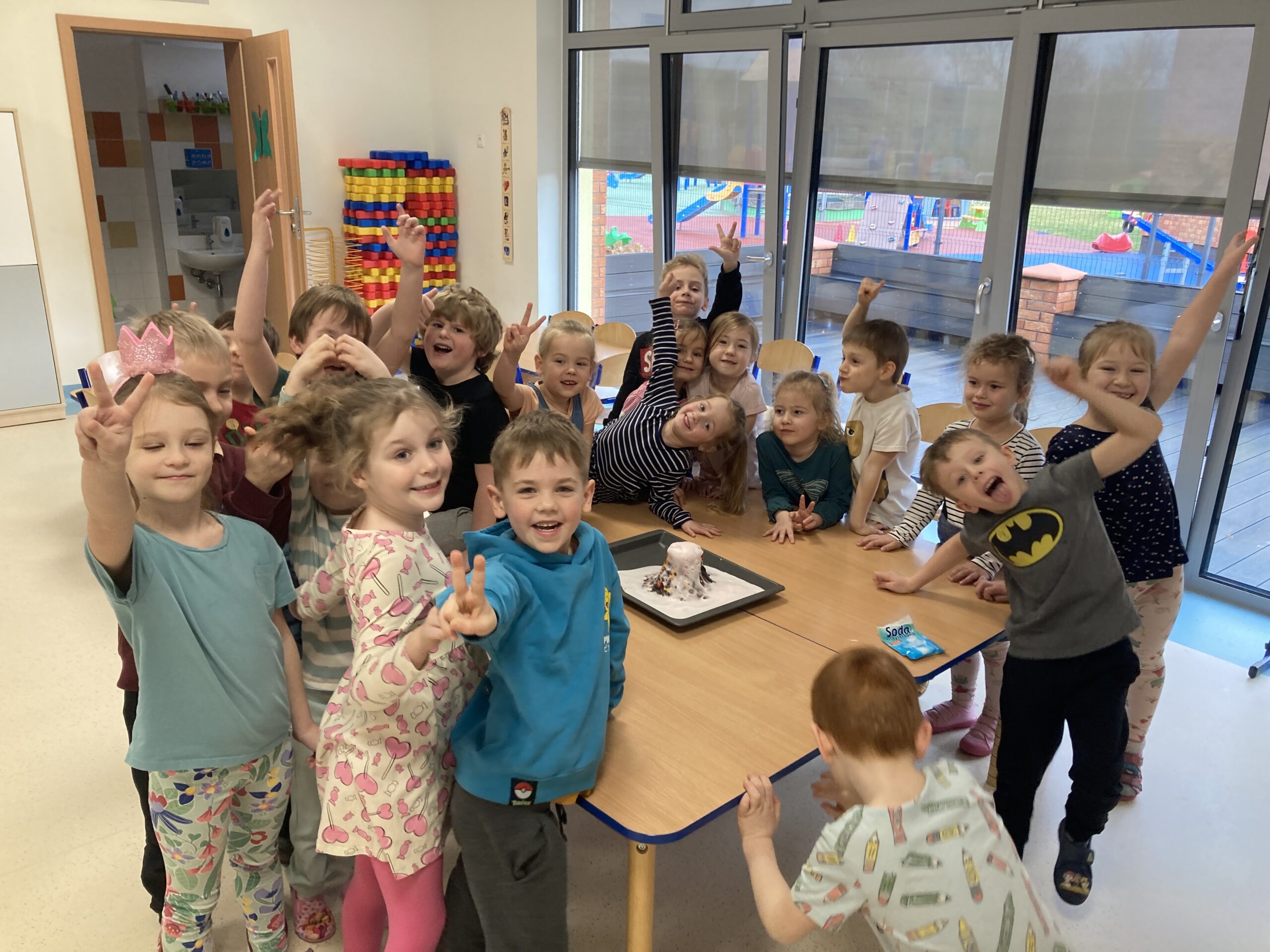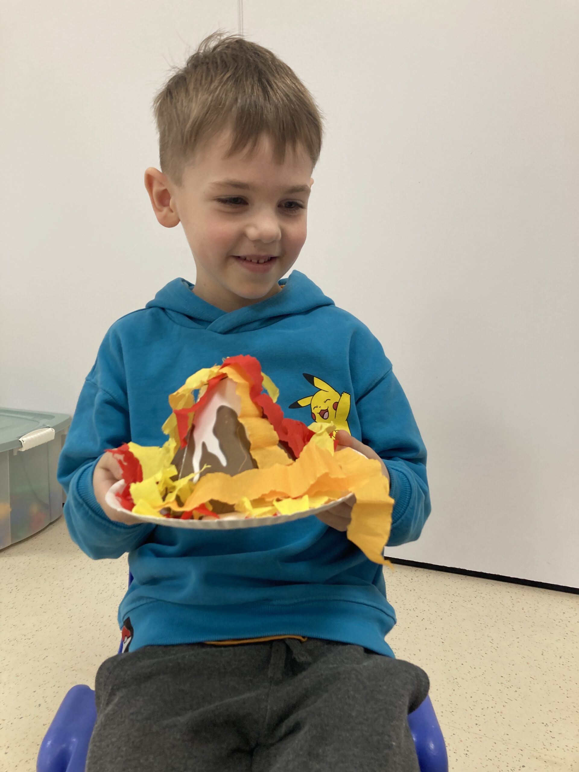W tym tygodniu Motylki dowiedziały się ciekawych informacji na temat wulkanów. Poznały ich rodzaje, dowiedziały się kiedy i dlaczego wybuchają i co się z nich wydobywa. Zainspirowani zajęciami, postanowiliśmy zrobić nasz własny „wulkan”. Zbudowaliśmy makietę wulkanu i wykonaliśmy doświadczenie, w którym za pomocą sody, octu i barwnika uzyskaliśmy „wybuch wulkanu”. Tego typu zabawa jest najlepszym sposobem rozwijania aktywności własnej dziecka, zdobywania wiedzy i rozbudzenia ciekawości otaczającym światem. Uczy prowadzenia obserwacji i wyciągania wniosków z doświadczeń i eksperymentów. Następnie dzieci wykonały własne modele wulkanów.