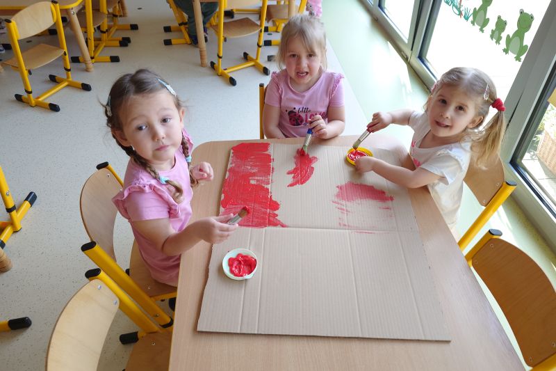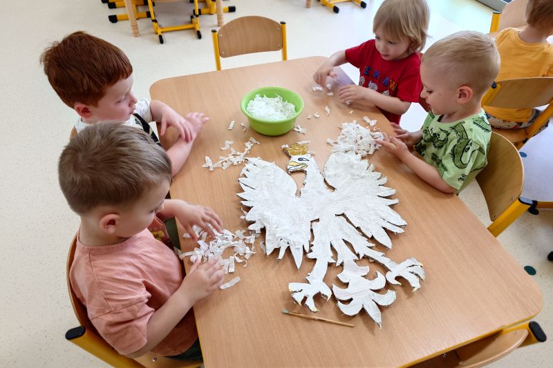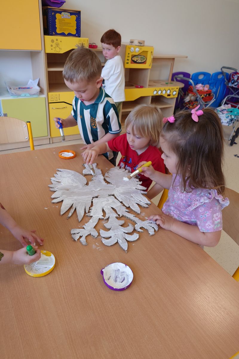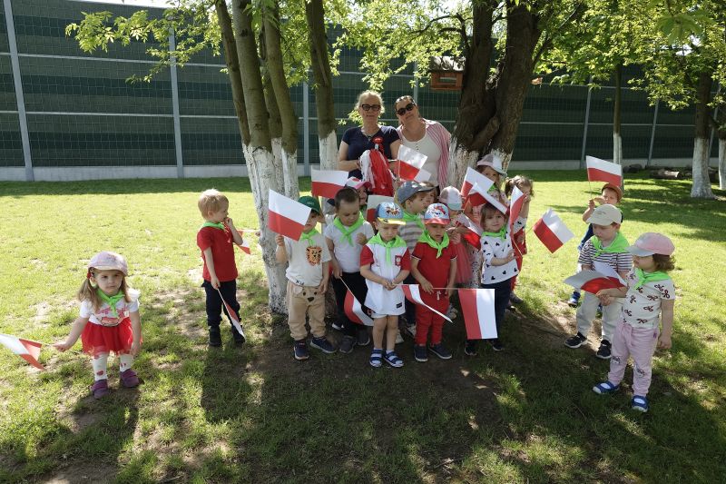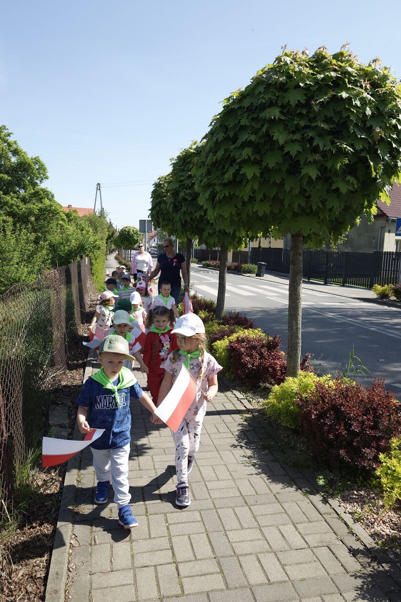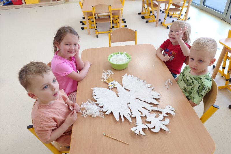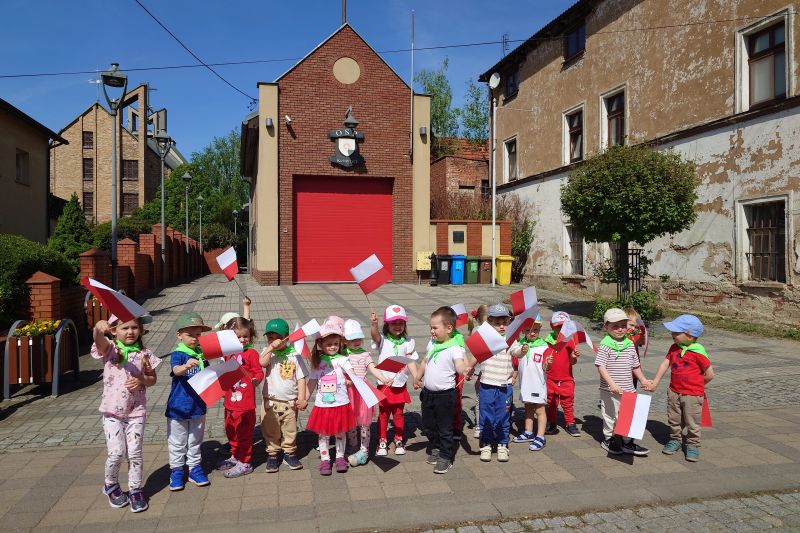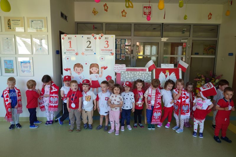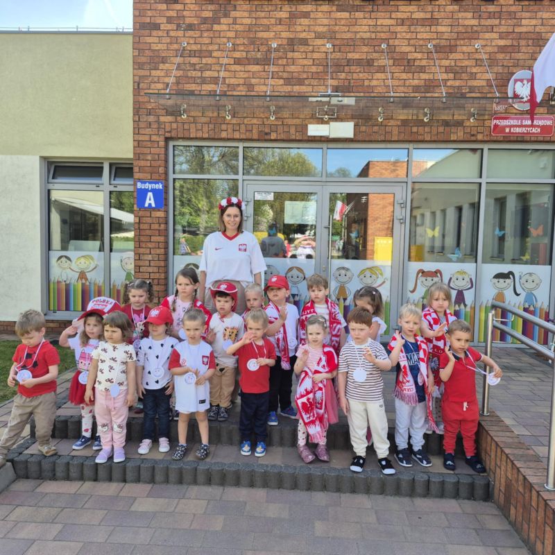 Przedszkolaki z grupy I ,,Pszczółki’’ przygotowywały się do powitania nowego miesiąca  i świętowania świąt z nim związanych. Przypomnieli wspólnie, że 1 maja obchodzimy Święto Pracy, 2 maja – Dzień Flagi a 3 maja – święto uchwalenia Konstytucji 3 Maja. Zajęcia  w przedszkolu poświęcone były właśnie narodowym świętom majowym. Przedszkolaki poznały symbole narodowe: godło, flagę oraz hymn Polski. Dzieci wykonały wspólną pracę plastyczną – godło a z najbliższymi w domu wykonały pracę plastyczną – Herb Kobierzyc różnymi technikami. 30.04.2025r. dzieci z grupy I ,,Pszczółki przemaszerowały z flagami ulicami Kobierzyc. Pamiętajmy, że wzbudzanie u dzieci zainteresowań historią od najmłodszych lat jest niezbędne dla kształcenia pozytywnych postaw patriotycznych.