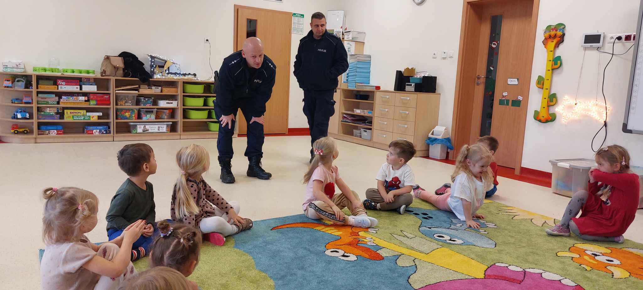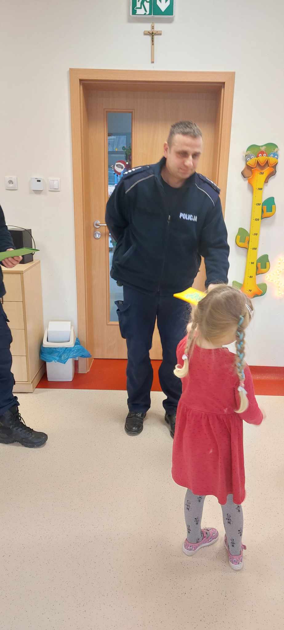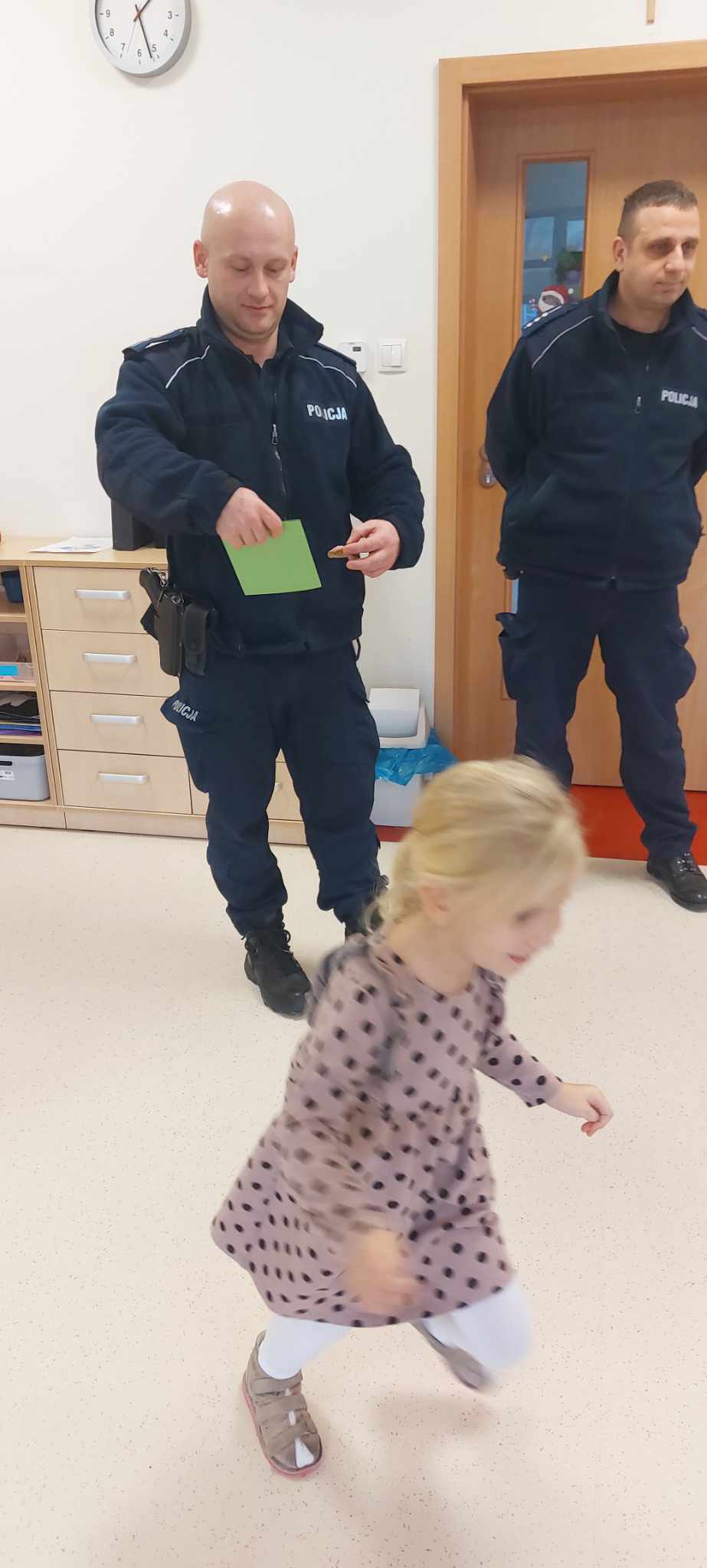 Panowie opowiedzieli o zasadach bezpieczeństwa w okresie zimy oraz sprawdzili naszą wiedzę na temat bezpieczeństwa podczas spaceru i zachowania się na drodze. My podziękowaliśmy Panom za odwiedziny naszymi własnoręcznie zrobionymi kartkami świątecznymi. Teraz nasze święta będą na pewno bezpieczne, a my do przedszkola wrócimy cali i zdrowi;)..