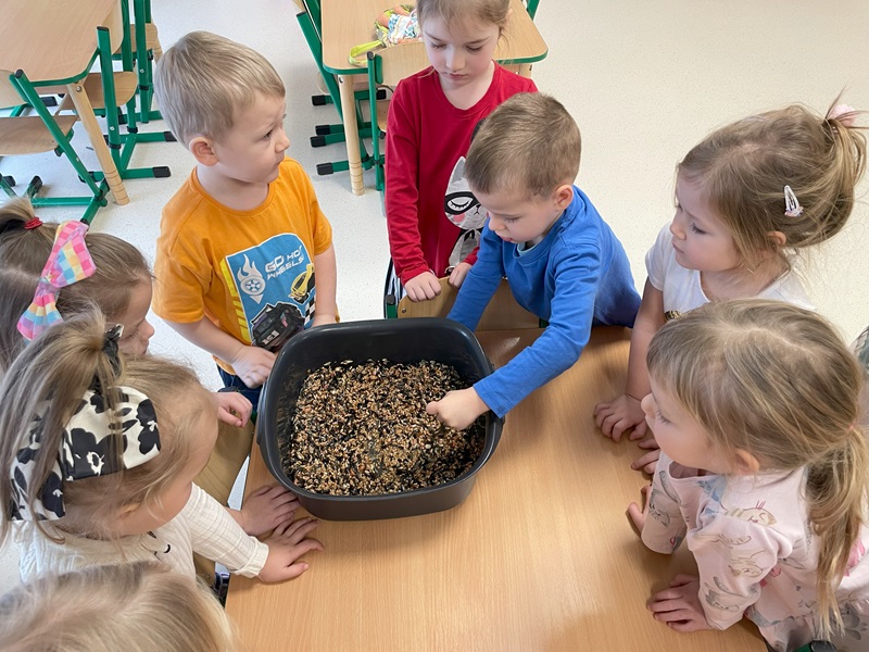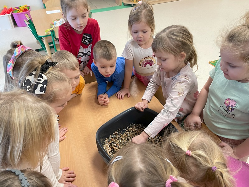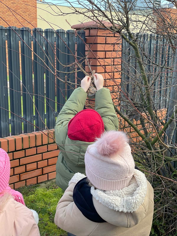 Przedszkolaki wiedzą, że zima to trudny czas dla ptaków, ze względu na niską temperaturę i trudne warunki pogodowe. W związku z tym ptaki mogą mieć problemy ze znalezieniem odpowiedniej ilości pokarmu. Dlatego dzieci z grupy „Żabek” przygotowały kule z ziaren, które porozwieszały na różnych gałązkach i krzaczkach w okolicy przedszkola. Nasi skrzydlaci przyjaciele na pewno są wdzięczni za taką pomoc.