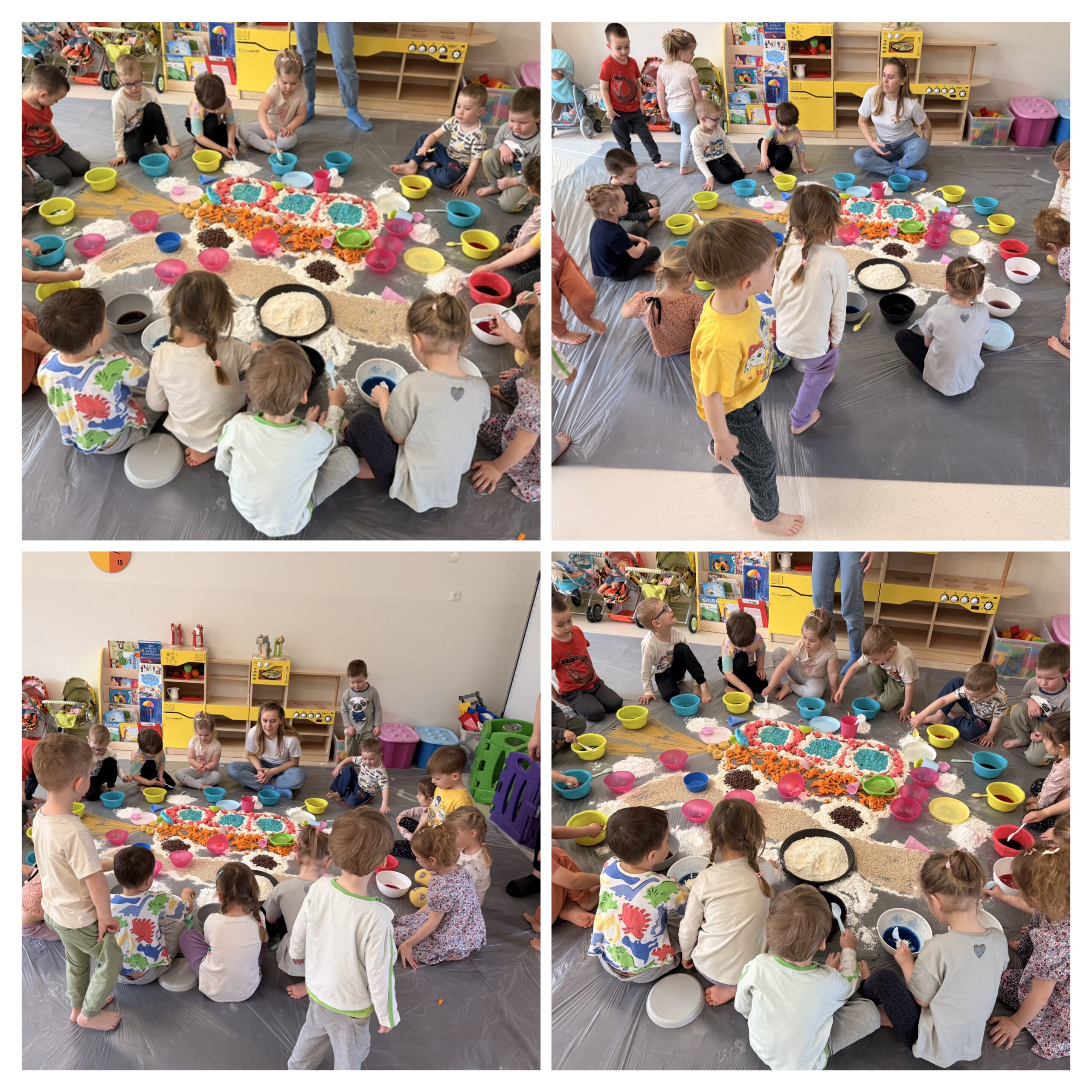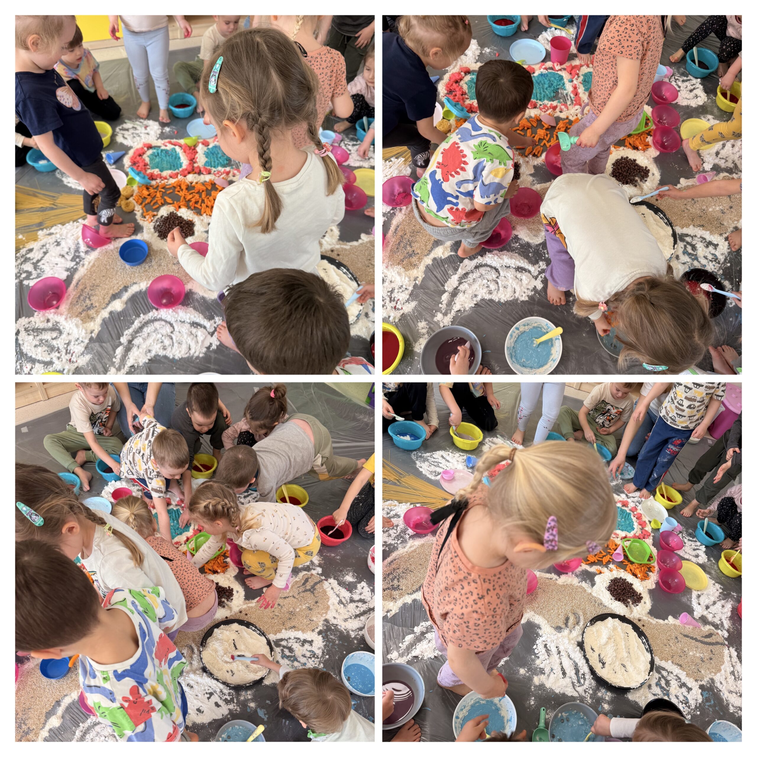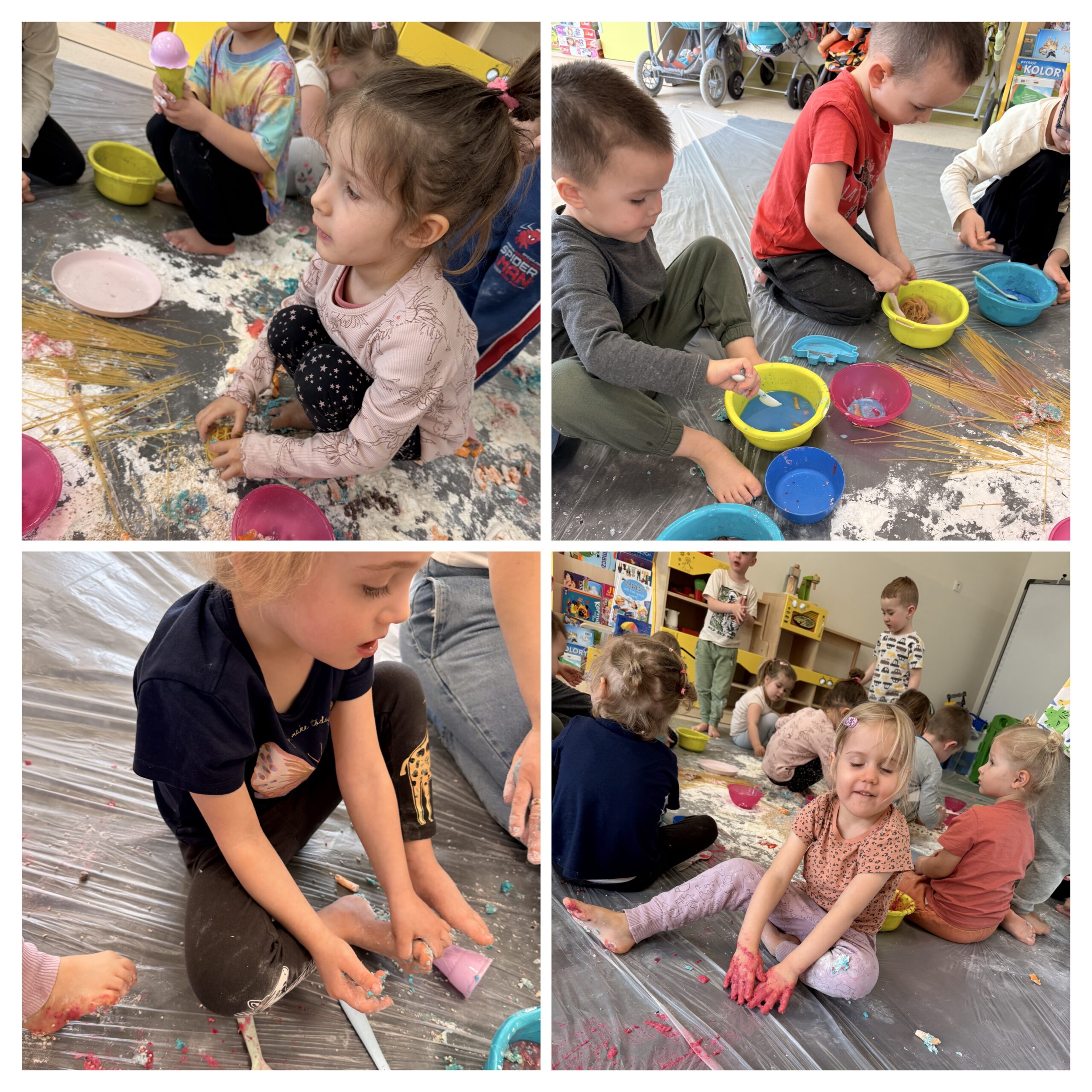 Dzieci z grupy „Gruszki” wzięły udział w wyjątkowych zajęciach sensoplastycznych, które dostarczyły im mnóstwo radości i niezapomnianych wrażeń! Podczas wspólnej zabawy przedszkolaki miały okazję poznawać różnorodne faktury, kolory i materiały. Na specjalnie przygotowanej przestrzeni pojawiły się m.in. kasze, ryż, makaron oraz barwione produkty, które dzieci mogły swobodnie przesypywać, mieszać i układać.