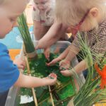 Dzieci mają naturalną, wrodzoną ciekawość świata, którą warto wykorzystać do rozwijania ich umiejętności i zdolności. Doskonałym sposobem na rozwijanie percepcji dziecka i jego zmysłów są zabawy sensoryczne. Żabki miały możliwość stworzenia stawu sensorycznego przy pomocy wody, kulek żelowych, patyków, kamyków itp. W stawie zamieszkało sześć żabek, ważka oraz dwa wodne pająki.