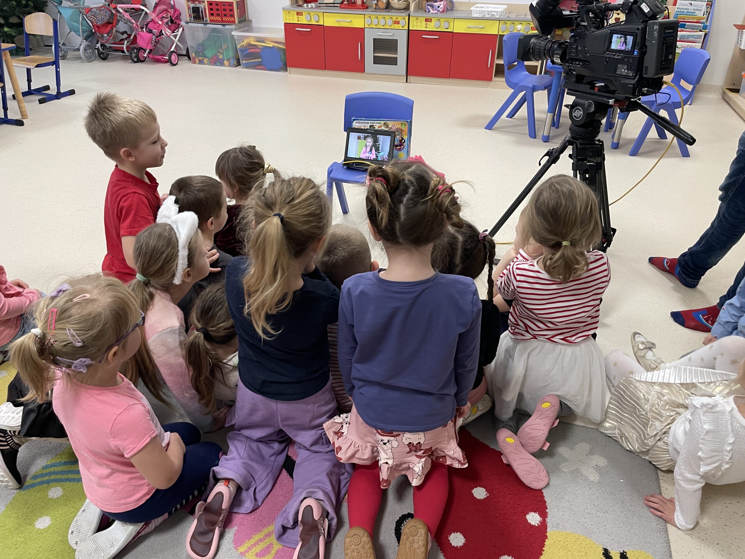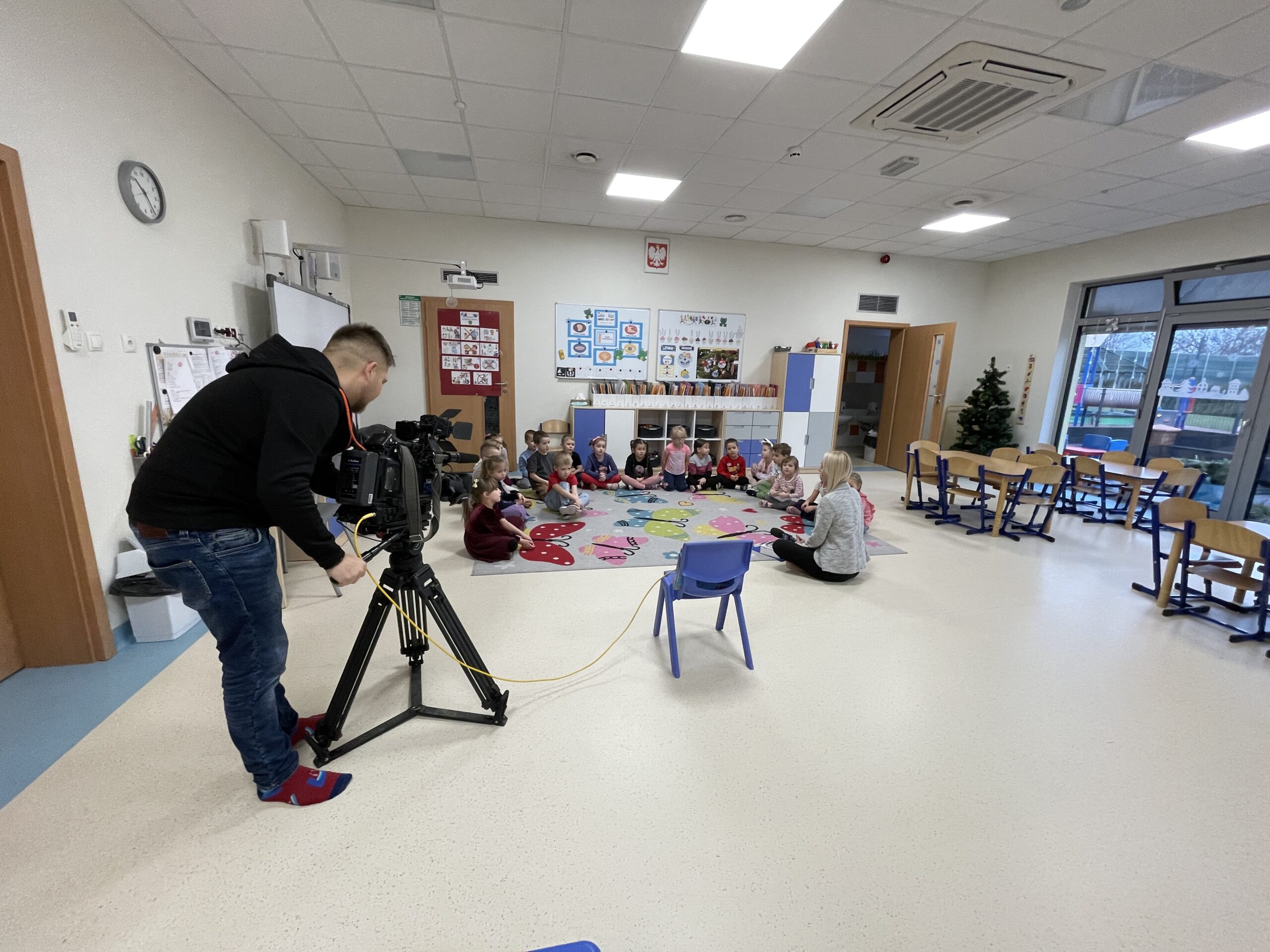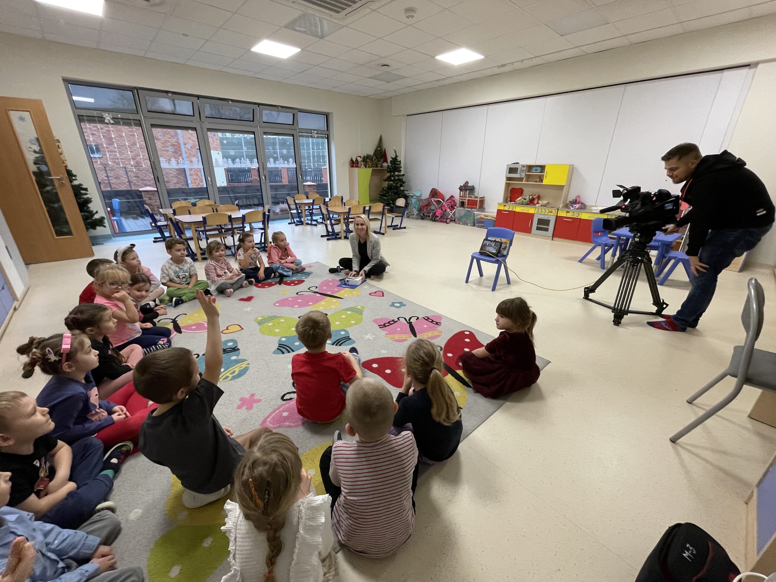 W ramach realizacji preorientacji zawodowej, 22 grudnia, gościliśmy mamę Radzika z grupy „Żabki”. Dzieci miały okazję poznać zawód dziennikarza, co okazało się świetną przygodą pełną pozytywnych emocji. Przedszkolaki zobaczyły profesjonalną kamerę oraz mikrofon, a także mogły wcielić się w rolę dziennikarzy, udzielając wywiadów. Następnie z dużym zainteresowaniem oglądały nagrany materiał. Dzięki temu miały możliwość zobaczyć świat medialny „od kuchni” oraz dowiedzieć się, jak powstaje materiał, który później można oglądać w telewizji. Był to ciekawie i wartościowo spędzony czas, rozwijający ciekawość świata oraz zainteresowanie tym, co dzieje się wokół nas.