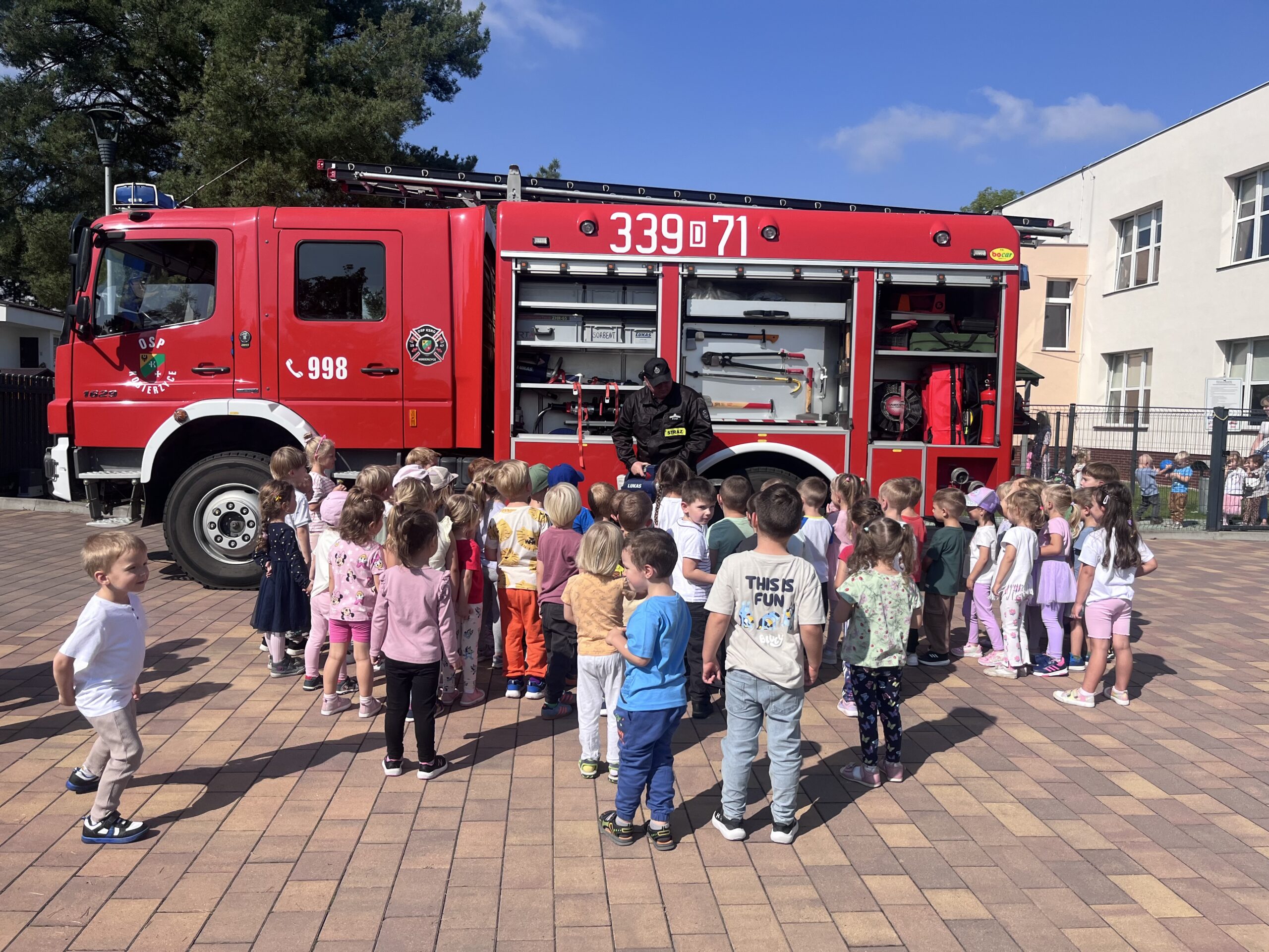 W naszym przedszkolu odbyło się wyjątkowe wydarzenie – grupy 3, 4, 5, 6 i 8 miały okazję spotkać się ze strażakami oraz z bliska obejrzeć prawdziwy wóz strażacki! Dzieci z ogromnym zainteresowaniem zwiedzały wóz, podziwiały jego wyposażenie i słuchały opowieści o pracy strażaka. Strażacy w ciekawy i przystępny sposób opowiadali o sprzętach, które na co dzień ratują ludzkie życie i mienie. Największą atrakcją był mini kurs pierwszej pomocy, podczas którego przedszkolaki uczyły się, jak reagować w sytuacjach zagrożenia i jak pomóc osobie potrzebującej zanim przyjedzie pomoc. To spotkanie było nie tylko fascynującą przygodą, ale także cenną lekcją bezpieczeństwa. Dziękujemy strażakom za poświęcony czas i ciepłe podejście do naszych przedszkolaków. Mamy nadzieję, że to spotkanie pozostanie w pamięci dzieci na długo i będzie inspiracją.”