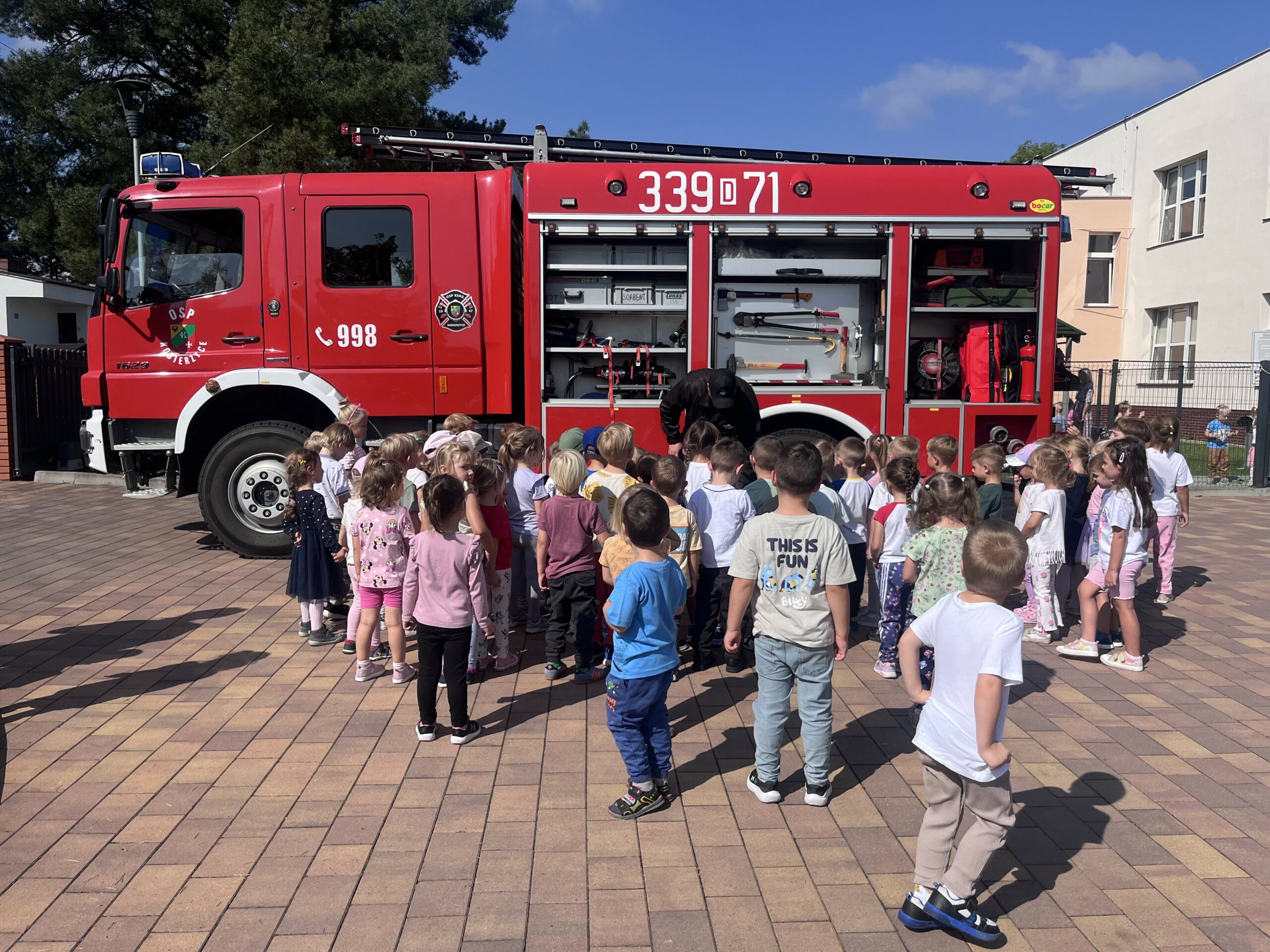 Dziś w naszym przedszkolu odbyło się wyjątkowe wydarzenie – grupy 3, 4, 5, 6 i 8 miały okazję spotkać się ze strażakami oraz z bliska obejrzeć prawdziwy wóz strażacki! Dzieci z ogromnym zainteresowaniem zwiedzały wóz, podziwiały jego wyposażenie i słuchały opowieści o pracy strażaka. Strażacy w ciekawy i przystępny sposób opowiadali o sprzętach, które na co dzień ratują ludzkie życie i mienie. Największą atrakcją był mini kurs pierwszej pomocy, podczas którego przedszkolaki uczyły się, jak reagować w sytuacjach zagrożenia i jak pomóc osobie potrzebującej zanim przyjedzie pomoc.