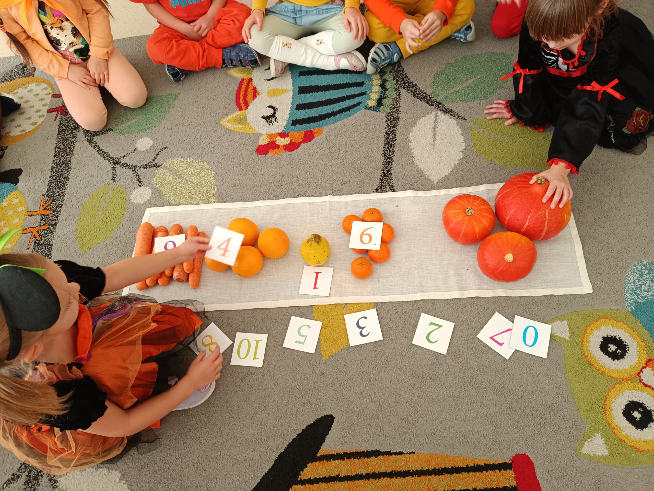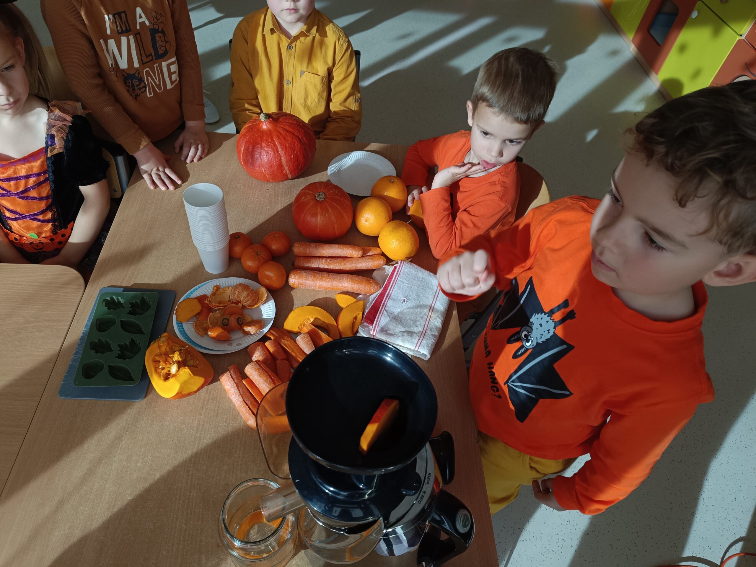 Święto dyni Post published:12 listopada, 2025 Post category:Wydarzenia Grupa VI - Biedronki 31 października dzieci z grupy Biedronki świętowały Dzień Dyni. Poznały ciekawostki i smaki różnych dyń, robiły soki, żelki i pieczątki dyniowe. Utrwaliły kolor pomarańczowy.