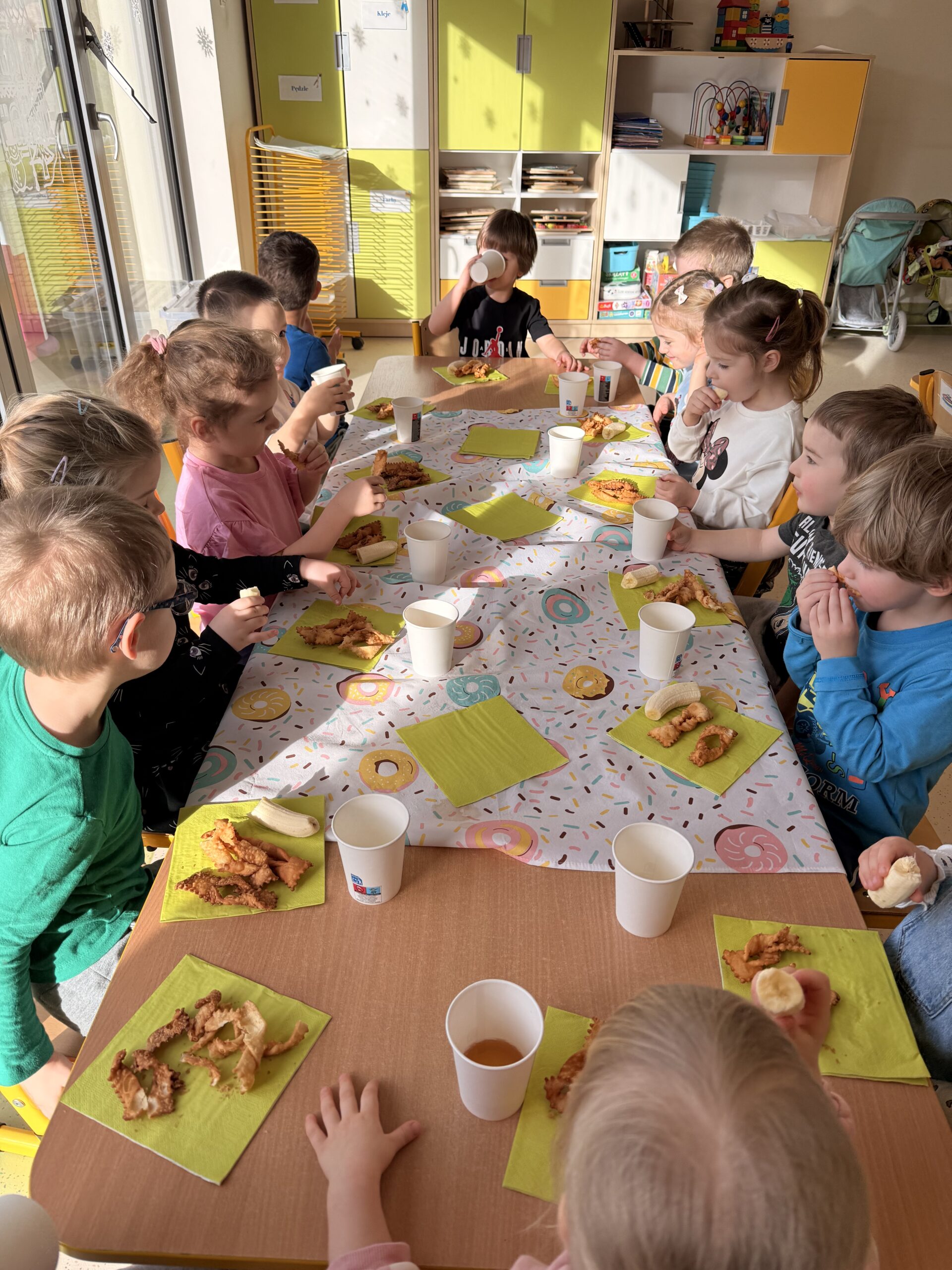 Dziś w naszym przedszkolu unosił się zapach słodkości, a na buziach dzieci gościły szerokie uśmiechy! 😍 Tłusty Czwartek to wyjątkowy dzień w polskiej tradycji – pełen radości, rozmów o dawnych zwyczajach i… oczywiście pączków! 🍩 Przedszkolaki dowiedziały się, skąd wzięła się ta tradycja, jakie inne słodkości jada się tego dnia oraz dlaczego mówi się, że kto nie zje pączka – temu szczęście nie sprzyja 😉