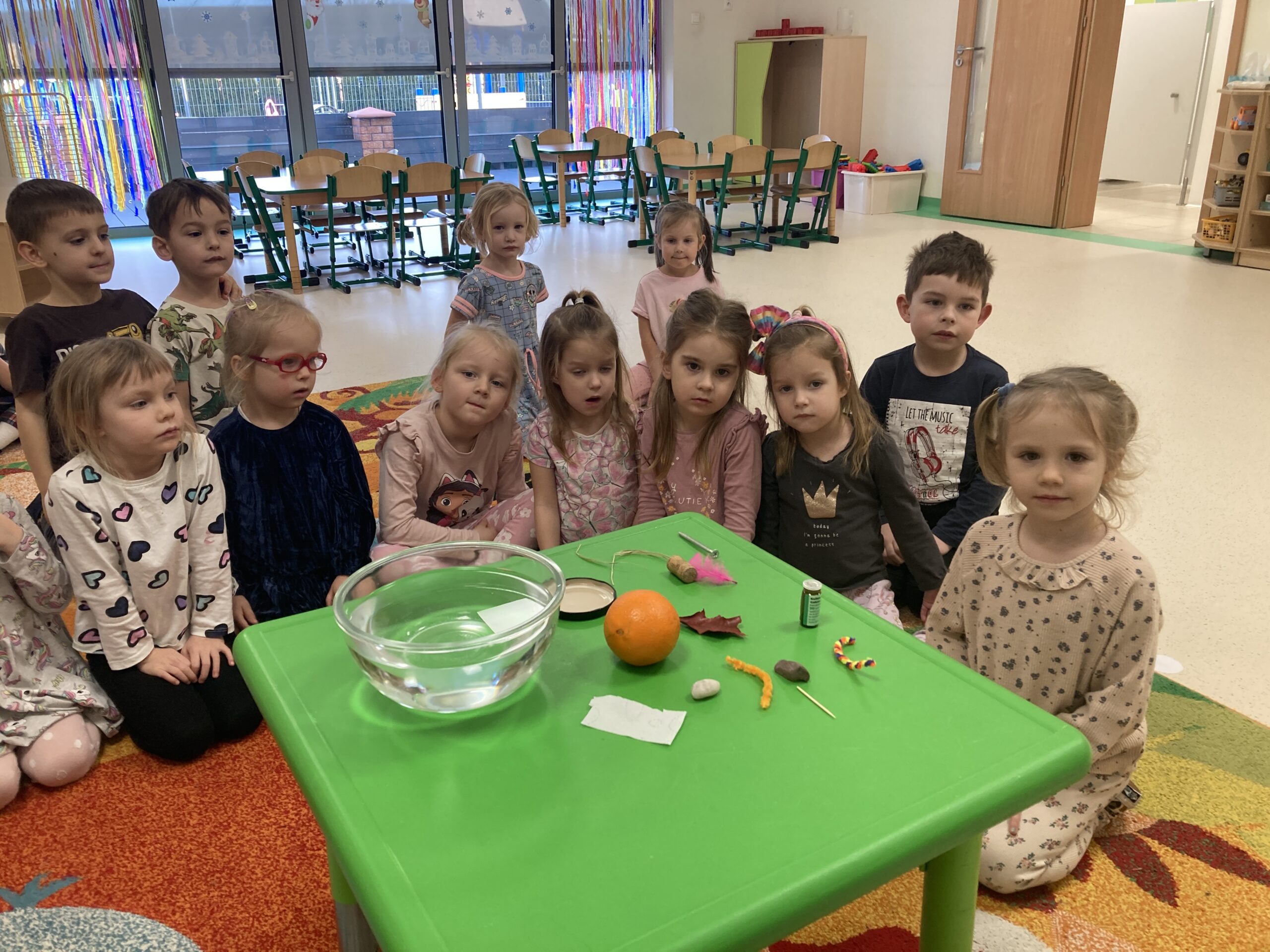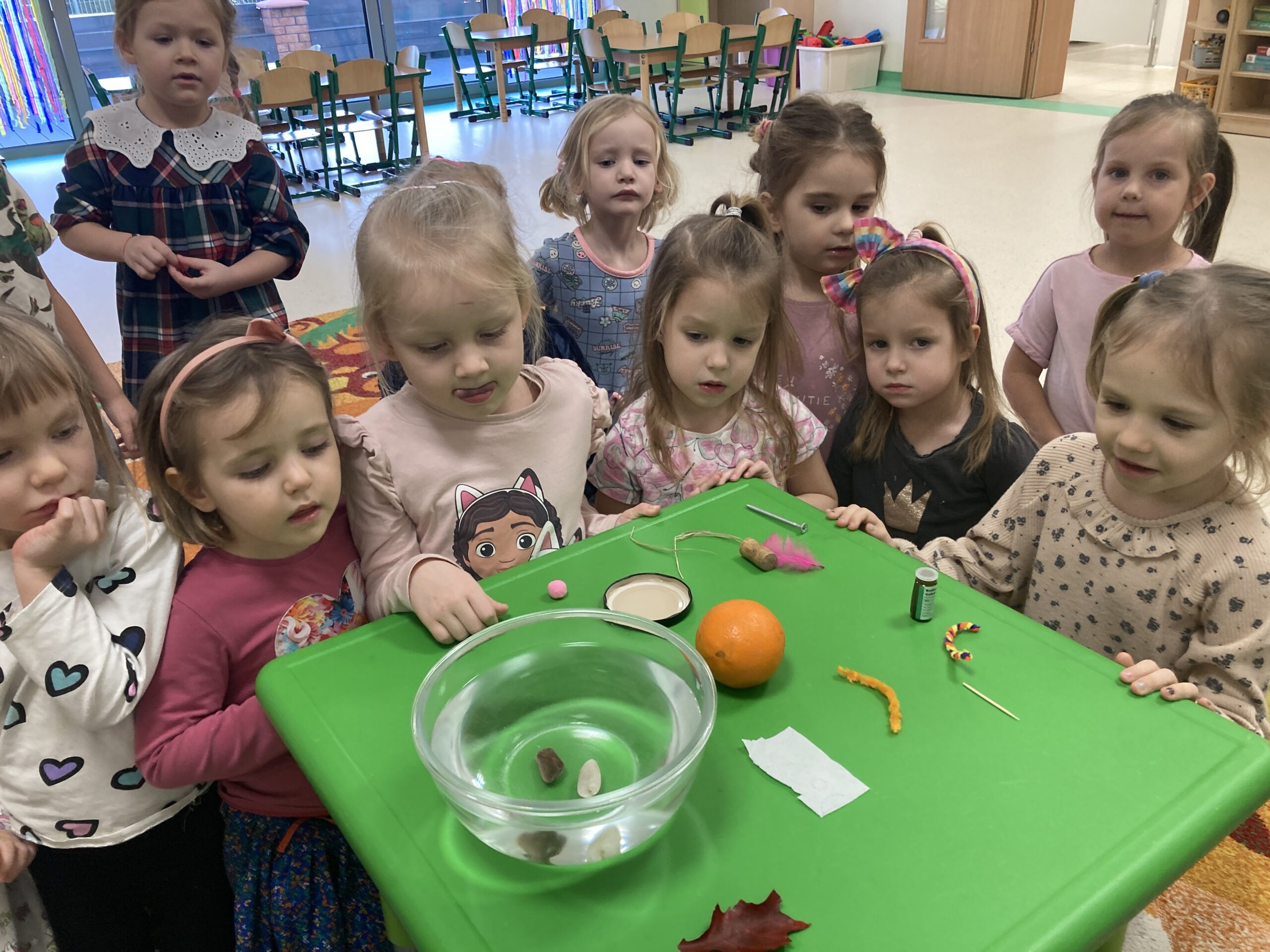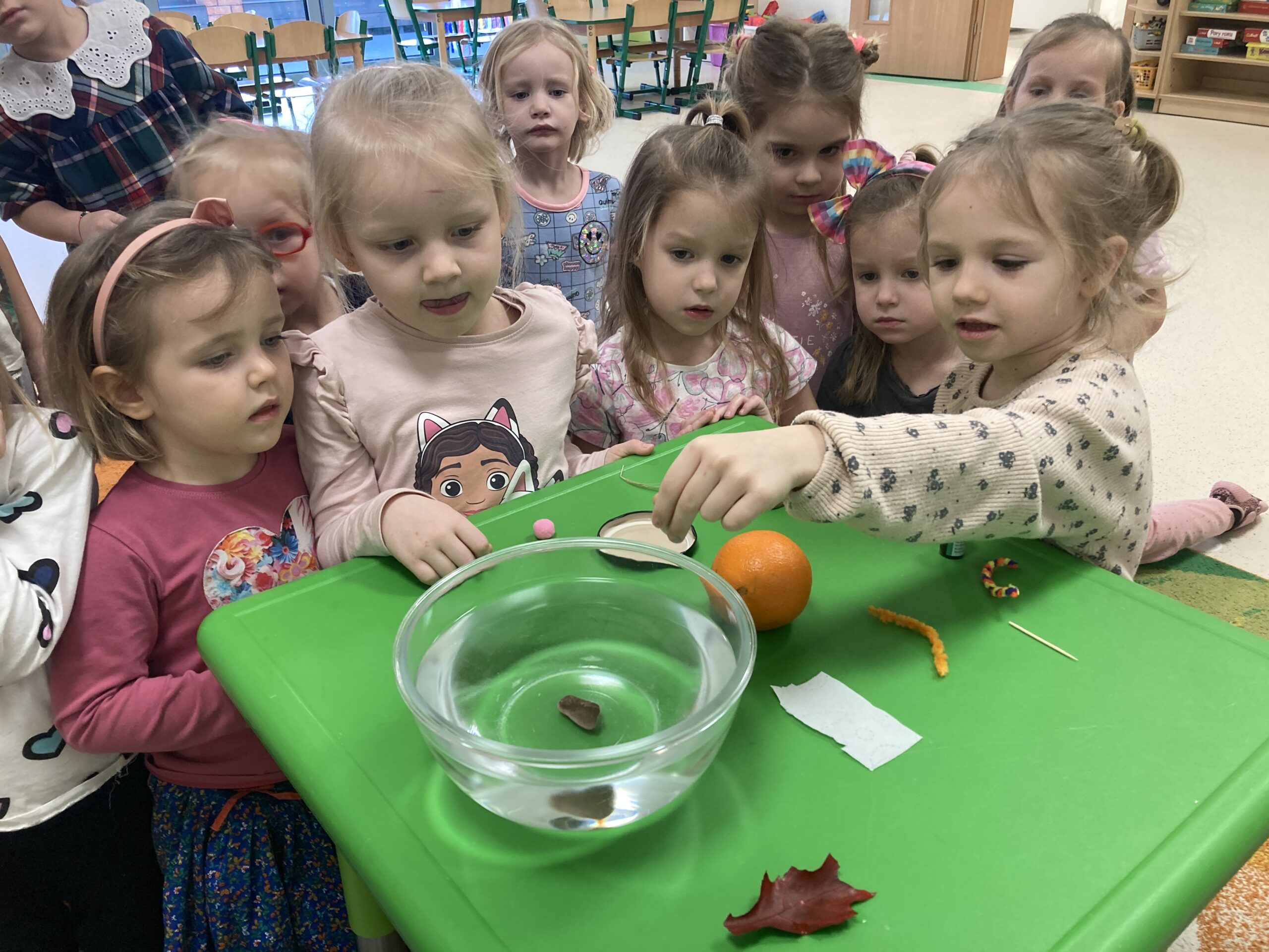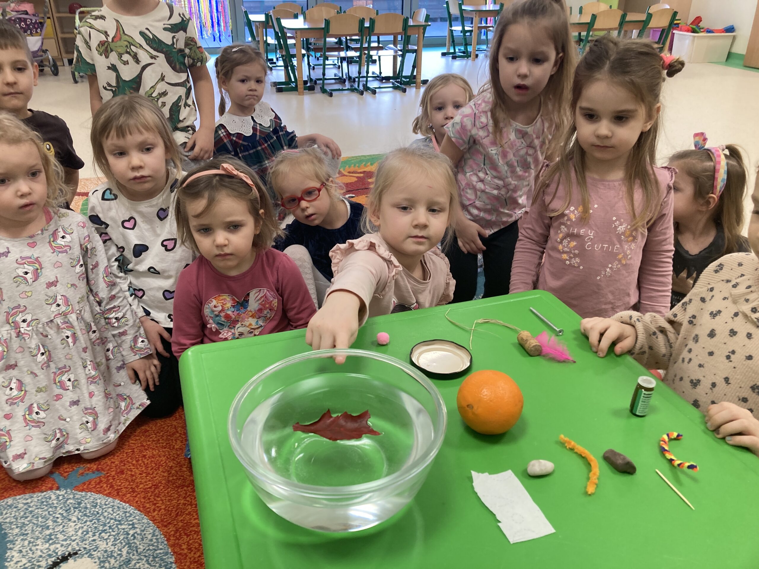 Dziś Tygryski eksperymentowały. Dowiedziały się dlaczego jedne przedmioty unoszą się na powierzchni wody, a inne toną oraz co to znaczy, że coś jest lekkie lub ciężkie. Do miski z wodą wrzucały różne przedmioty: piórko, gumkę, kamień, monetę, gwóźdź, klucz, korek, liść, pomarańczę itp. Następnie dzieci próbowały zgadnąć co zatonie a co nie i dlaczego, obserwowały i omawiały co się działo przedmiotami. Dzieci mają w sobie wrodzoną aktywność poznawczą i podczas eksperymentu były bardzo zaangażowane i świetnie się bawiły.