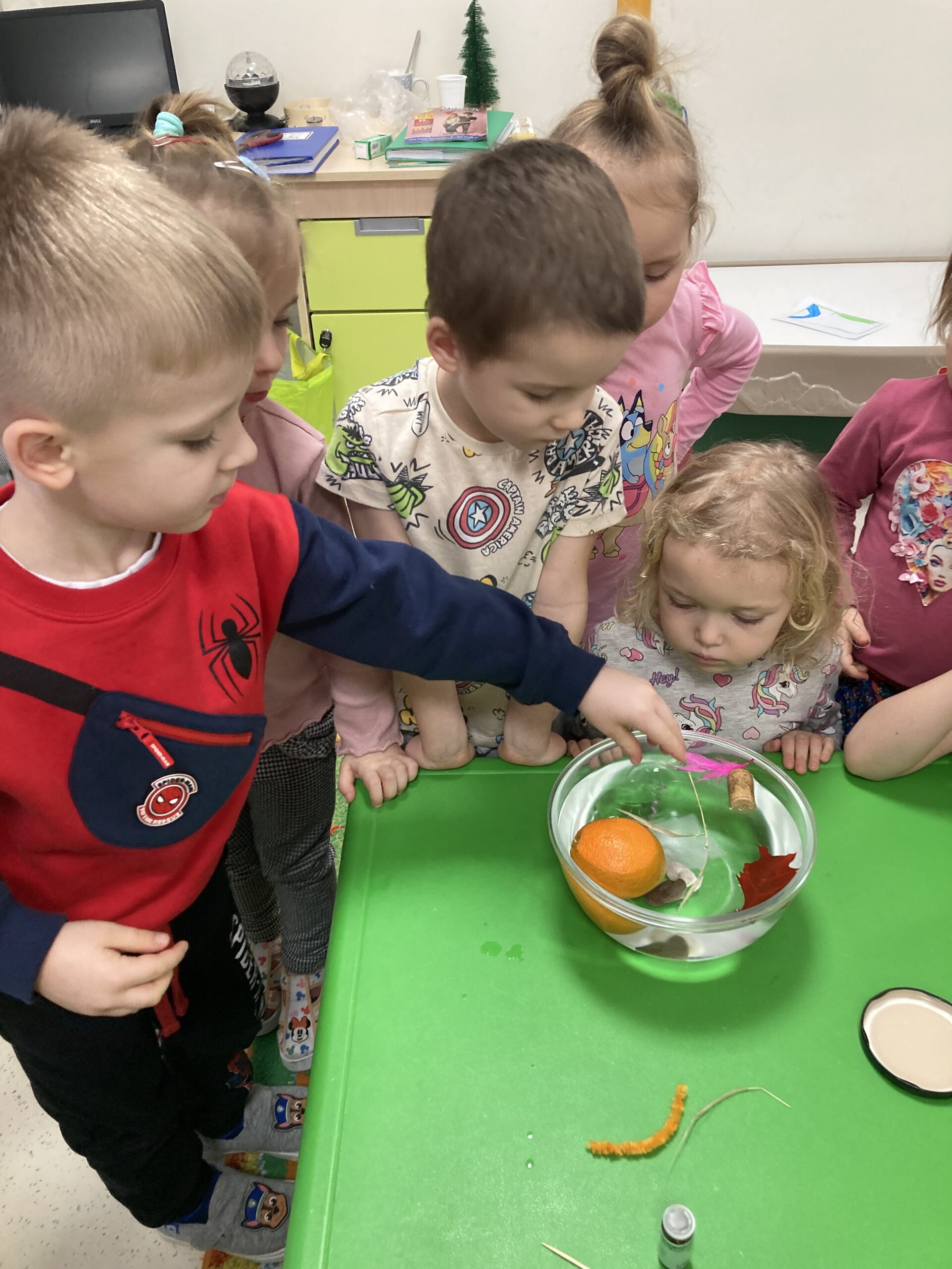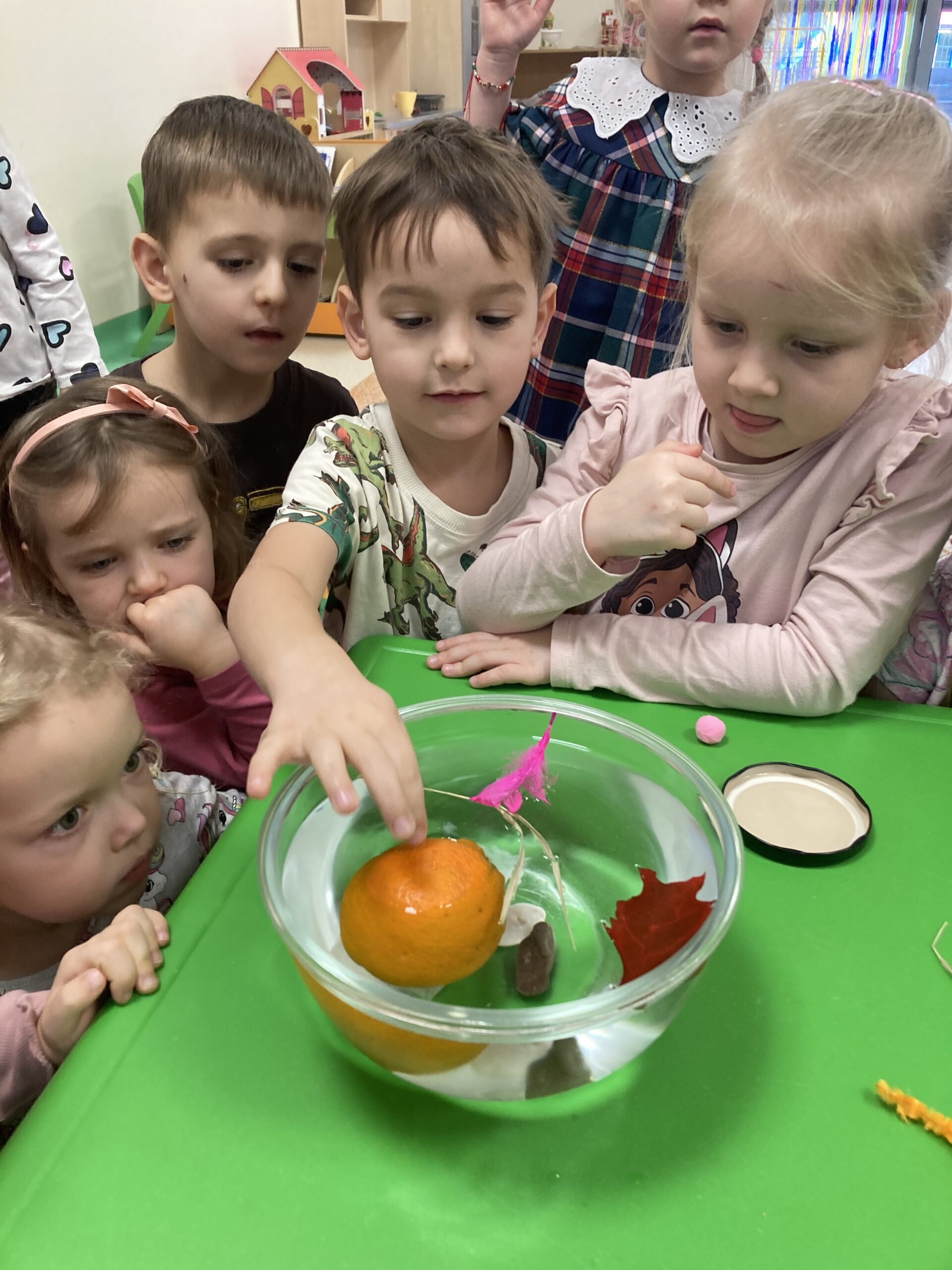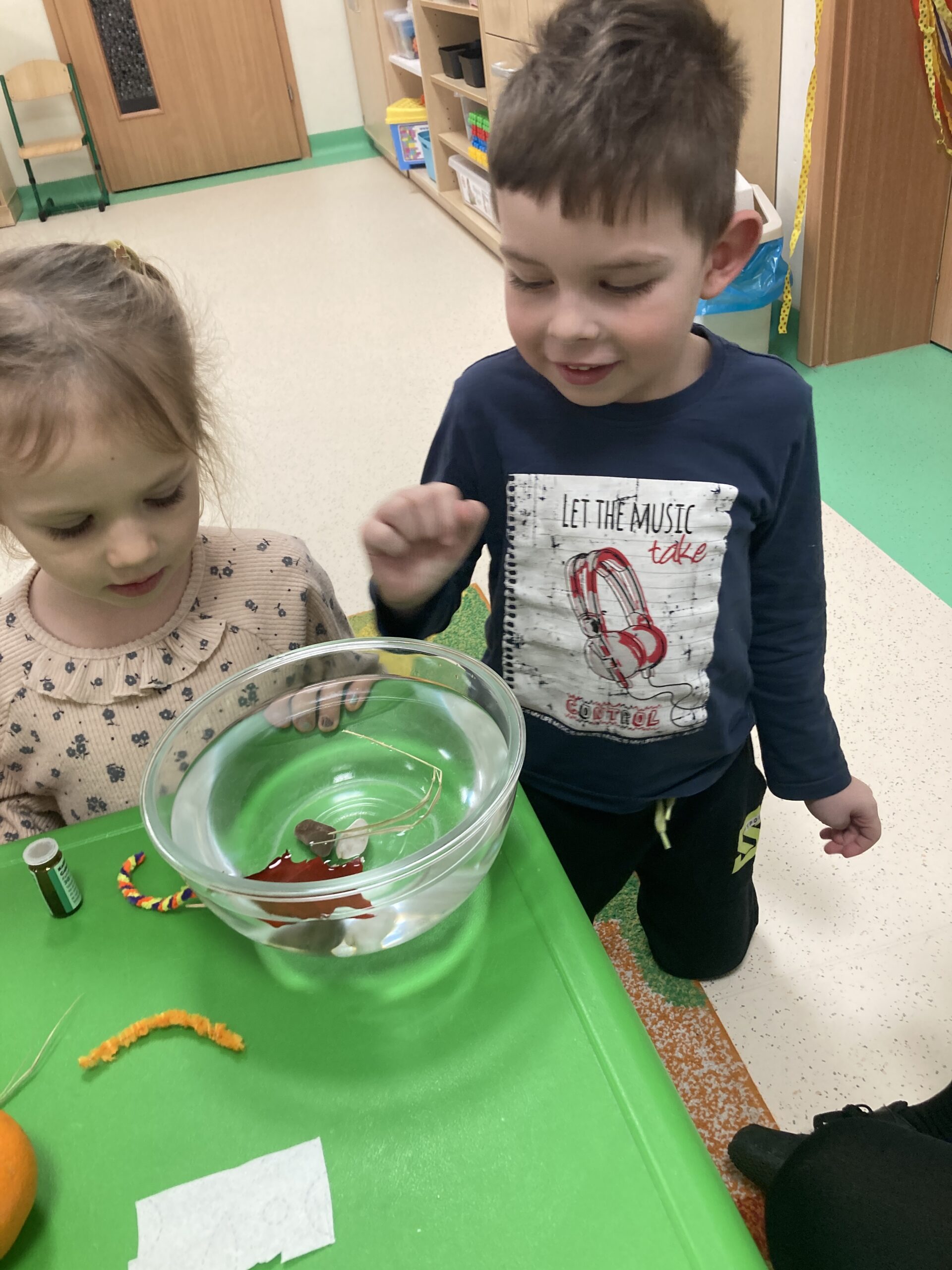 Dziś Tygryski eksperymentowały. Dowiedziały się dlaczego jedne przedmioty unoszą się na powierzchni wody, a inne toną oraz co to znaczy, że coś jest lekkie lub ciężkie. Do miski z wodą wrzucały różne przedmioty: piórko, gumkę, kamień, monetę, gwóźdź, klucz, korek, liść, pomarańczę itp. Następnie dzieci próbowały zgadnąć co zatonie a co nie i dlaczego, obserwowały i omawiały co się działo przedmiotami. Dzieci mają w sobie wrodzoną aktywność poznawczą i podczas eksperymentu były bardzo zaangażowane i świetnie się bawiły.