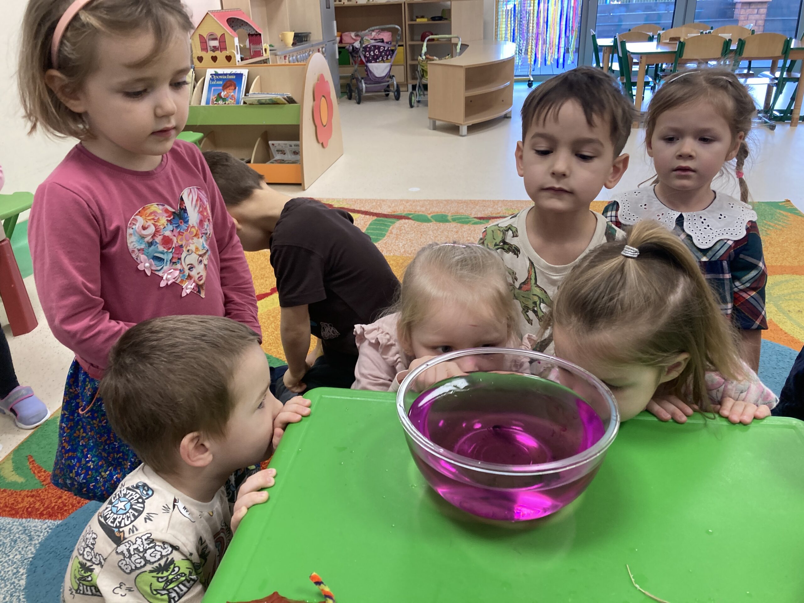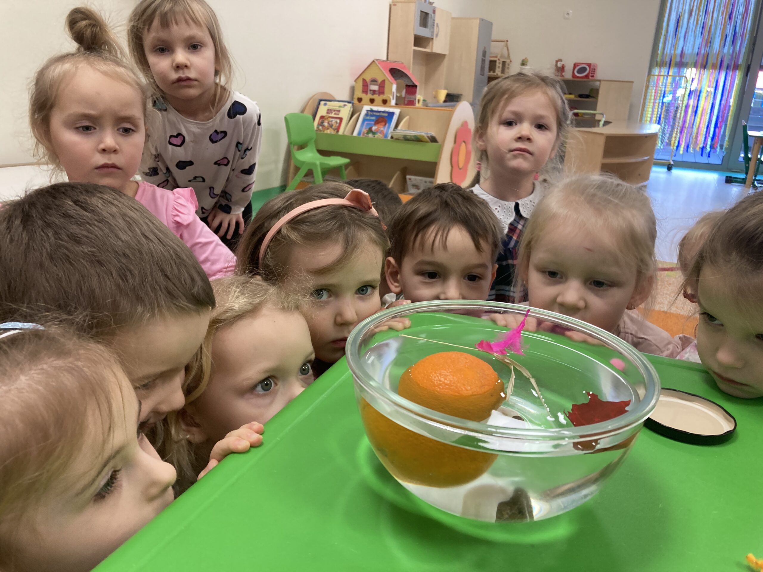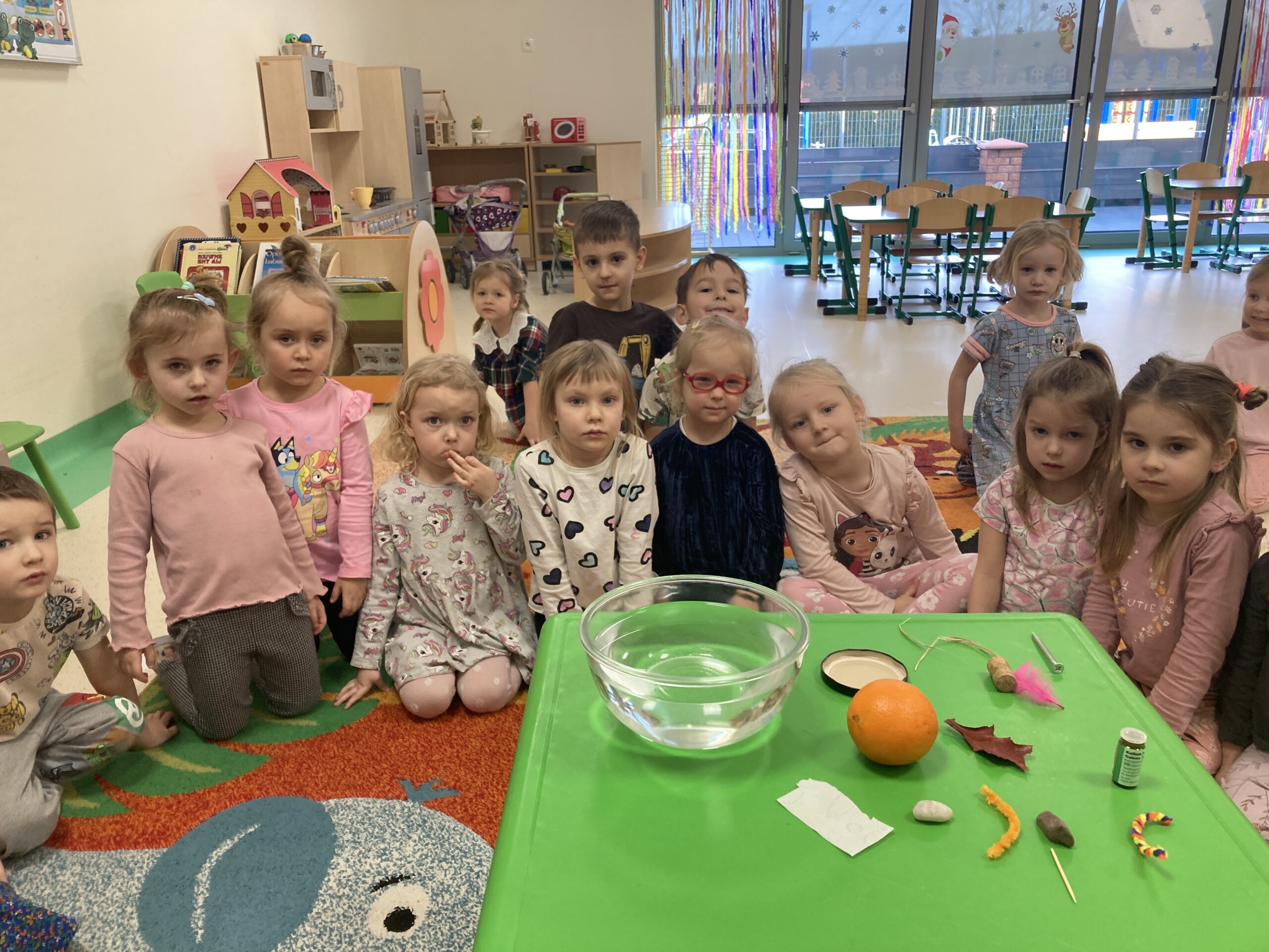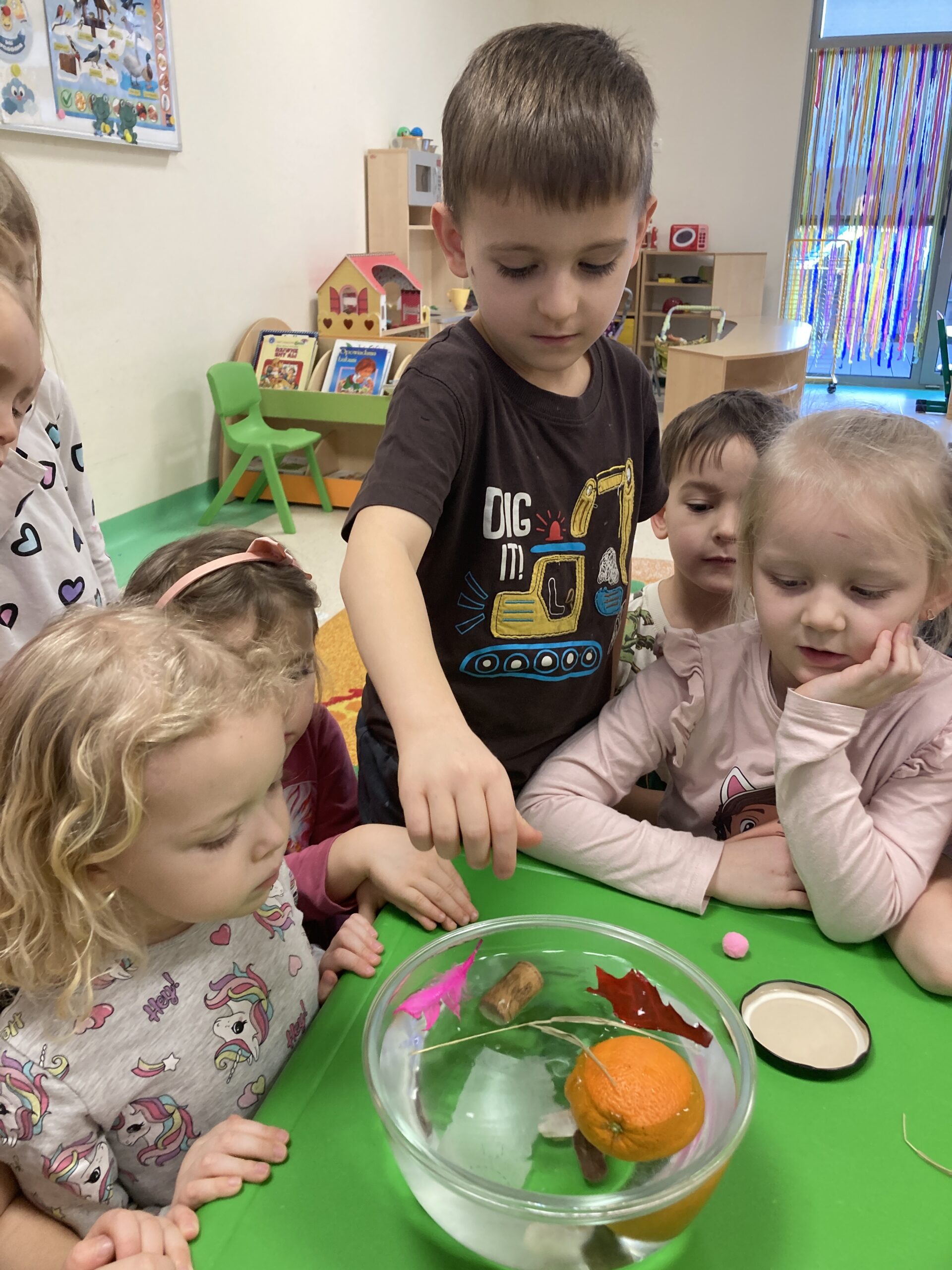Dziś Tygryski eksperymentowały. Dowiedziały się dlaczego jedne przedmioty unoszą się na powierzchni wody, a inne toną oraz co to znaczy, że coś jest lekkie lub ciężkie. Do miski z wodą wrzucały różne przedmioty: piórko, gumkę, kamień, monetę, gwóźdź, klucz, korek, liść, pomarańczę itp. Następnie dzieci próbowały zgadnąć co zatonie a co nie i dlaczego, obserwowały i omawiały co się działo przedmiotami. Dzieci mają w sobie wrodzoną aktywność poznawczą i podczas eksperymentu były bardzo zaangażowane i świetnie się bawiły.