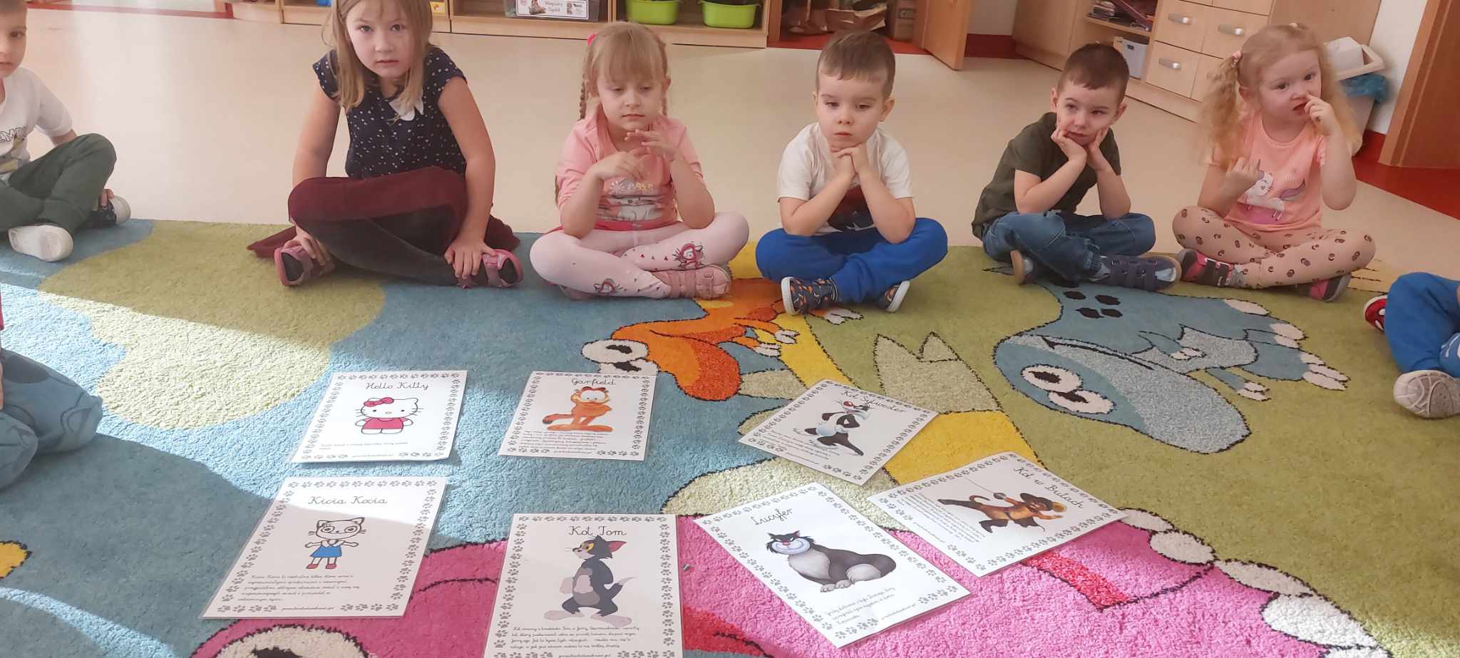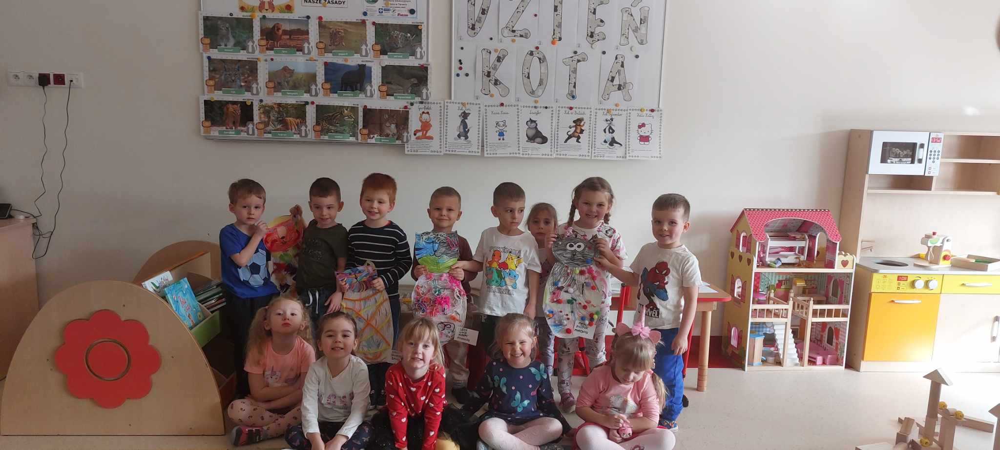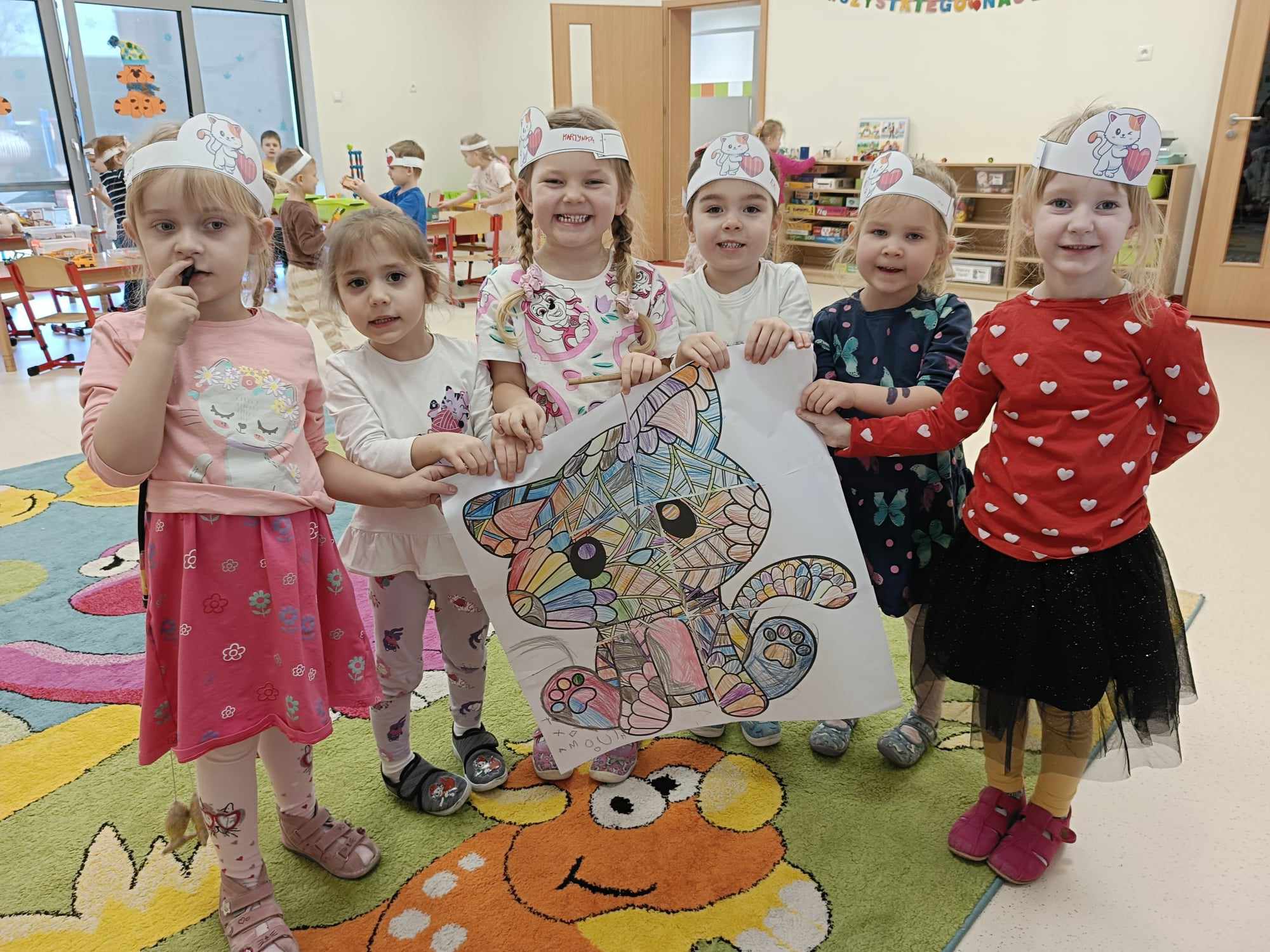 Z związku z obchodami „Dnia Kota” -Tygryski obchodziły swoje święto bardzo intensywnie. Dzieci odgadywały znane podobizny kotów z bajek i książek oraz poznawały gatunki dzikich kotów. Dzieci w grupach stworzyły ogromne podobizny kotów, a dziewczynki wspólnie pokolorowały olbrzymią kocią kolorowankę. Dzięki ,, Wielkiej Księdze Kotów” Tygryski dowiedziały się wszystkiego o futrzakach- poznały rasy kotów domowych oraz dowiedziały się co lubią robić najbardziej.