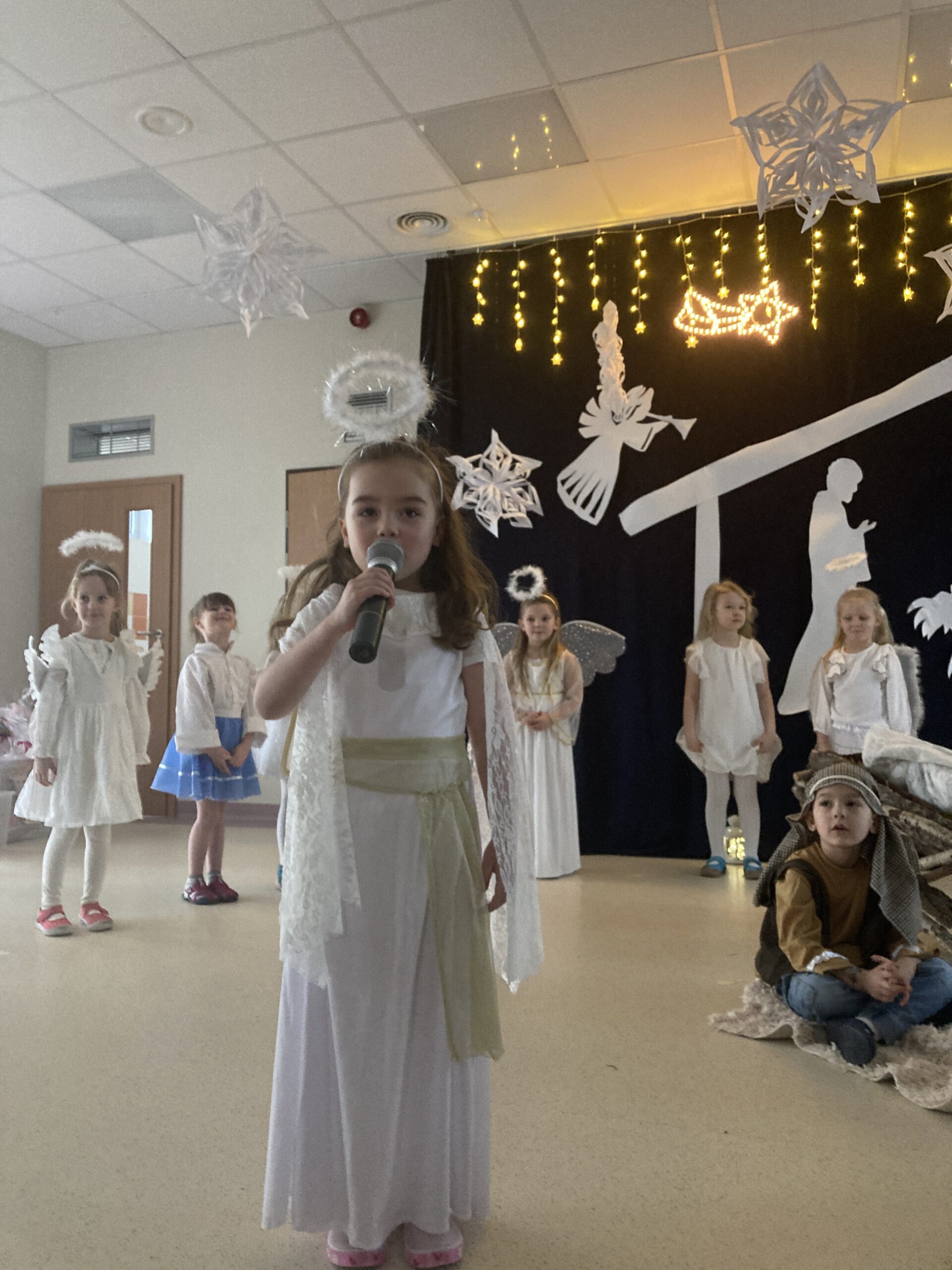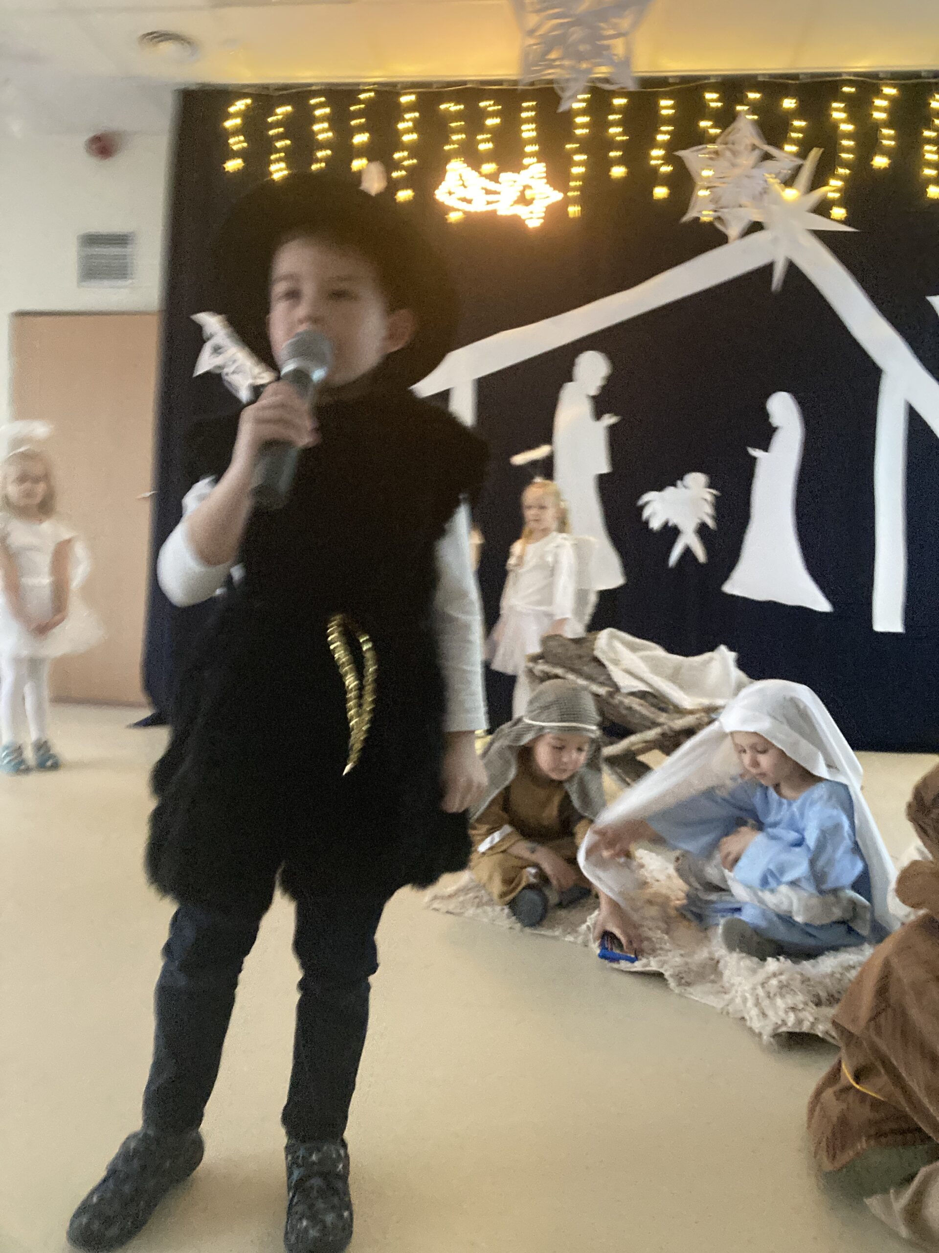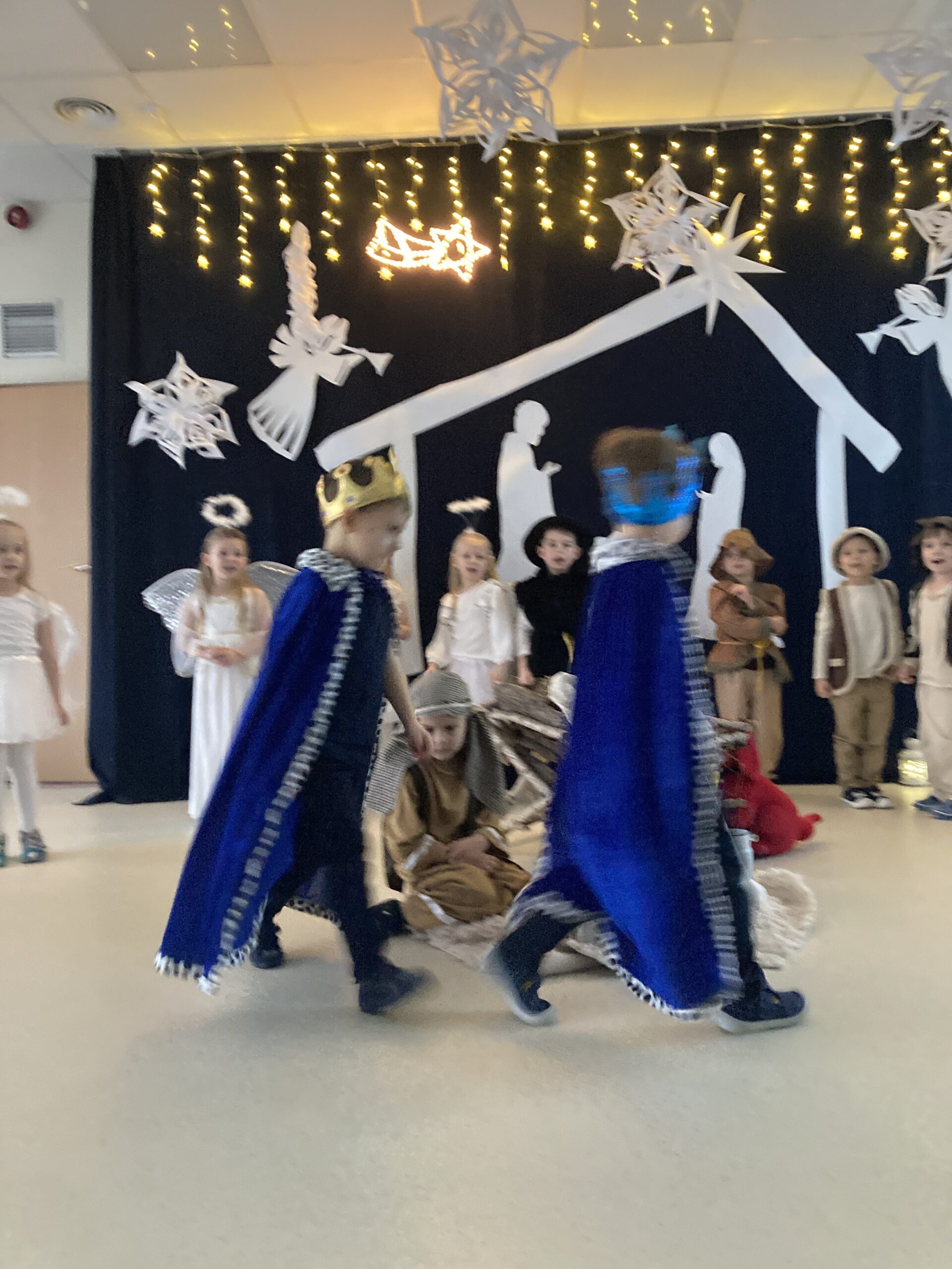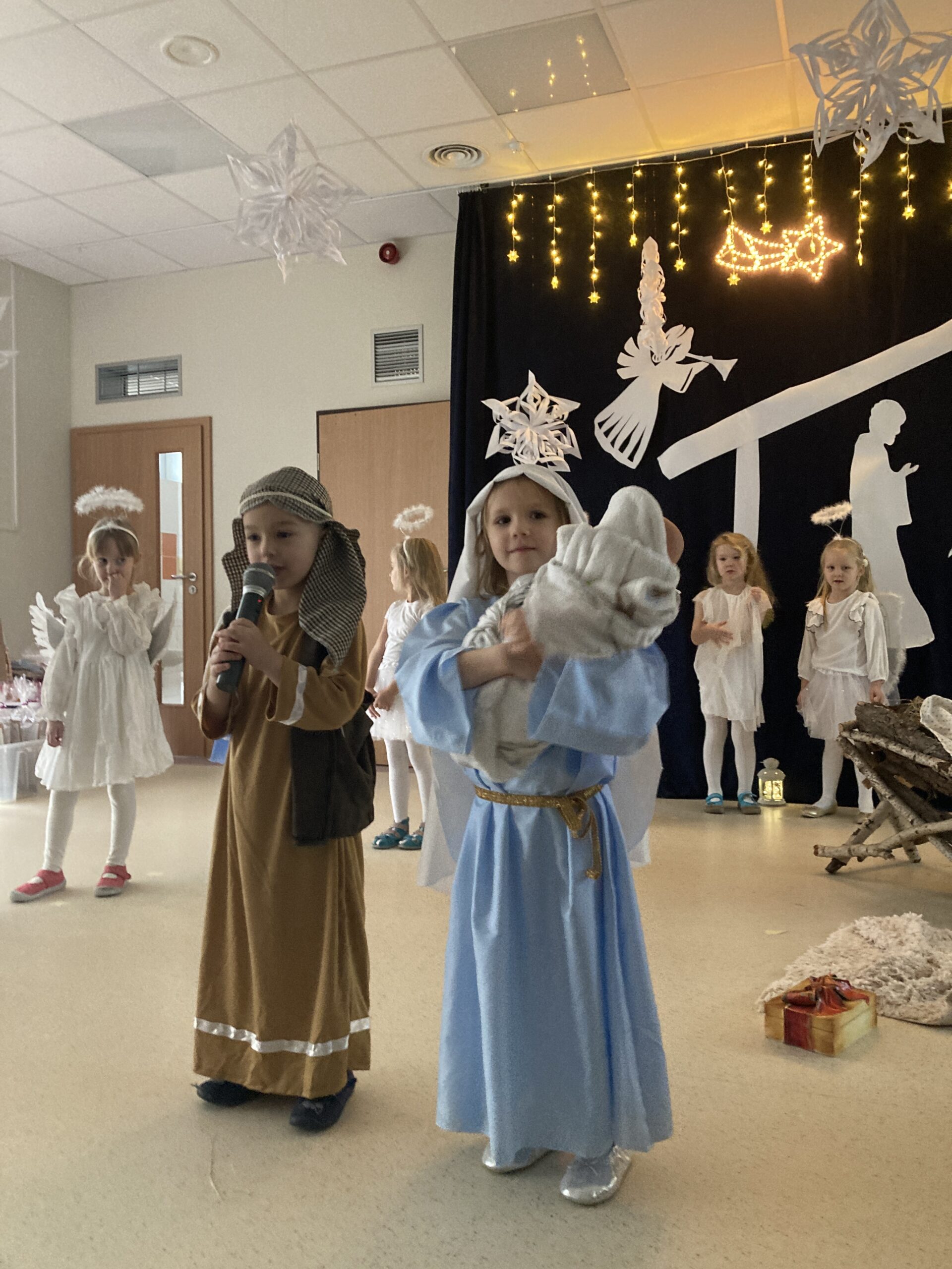 Przedszkolaki z grupy VI przedstawiły Jasełka, czyli widowisko o Bożym Narodzeniu. Tygryski wcieliły się w role Maryi i Józefa, pasterzy, aniołów, Trzech Króli, przybywających do Betlejem, aby złożyć pokłon Jezusowi narodzonemu w ubogiej stajence. Mali aktorzy, we wspaniałych strojach prezentowali się doskonale na tle bożonarodzeniowej dekoracji – stajenki z Józefem, Maryją i Dzieciątkiem. Mali artyści z ogromnym zaangażowaniem odtwarzali swoje role, prezentowali umiejętności recytatorskie i wokalne. Przedstawione Jasełka na pewno na długo pozostaną w pamięci dzieci, ich bliskich i wszystkich.