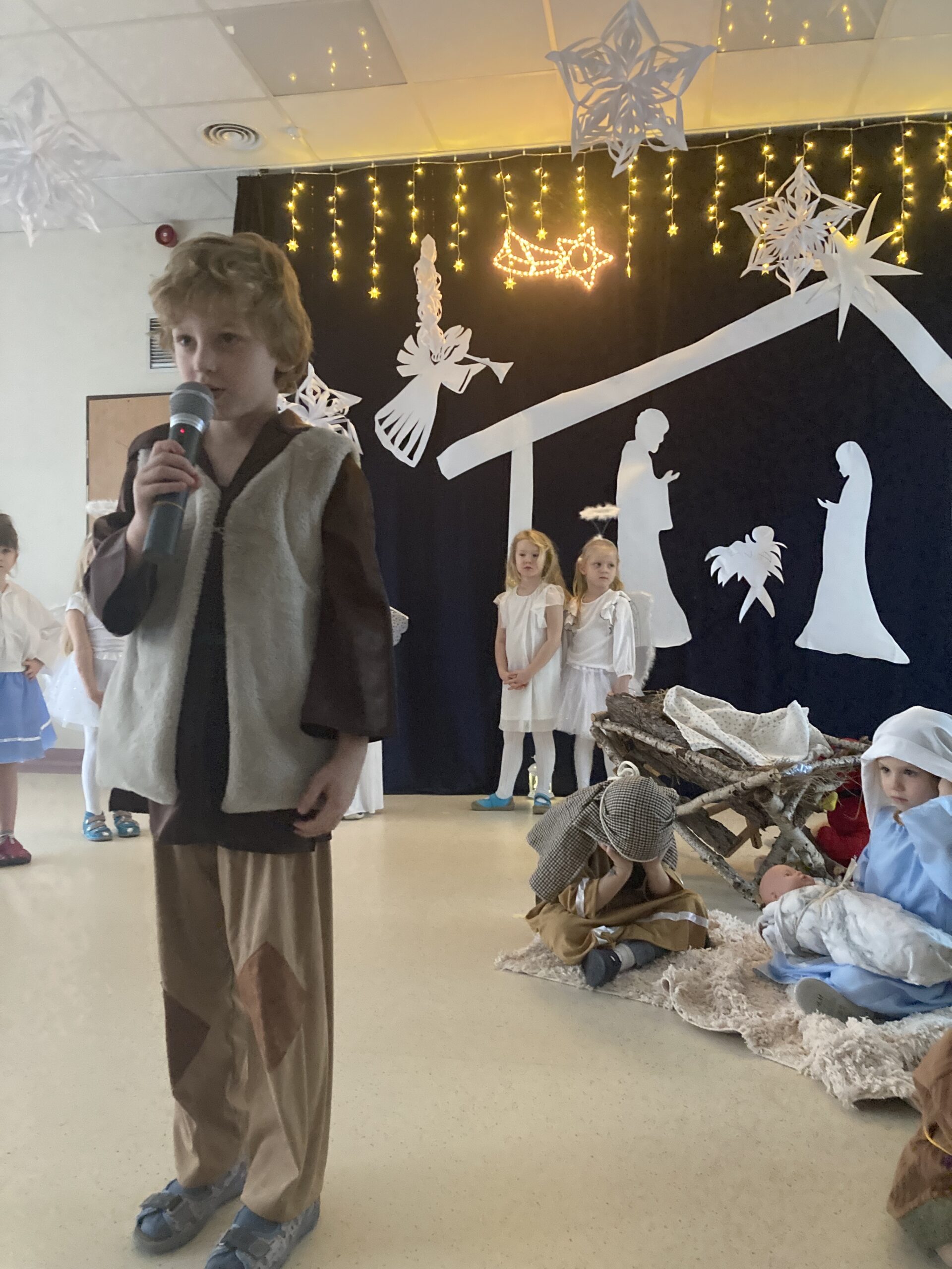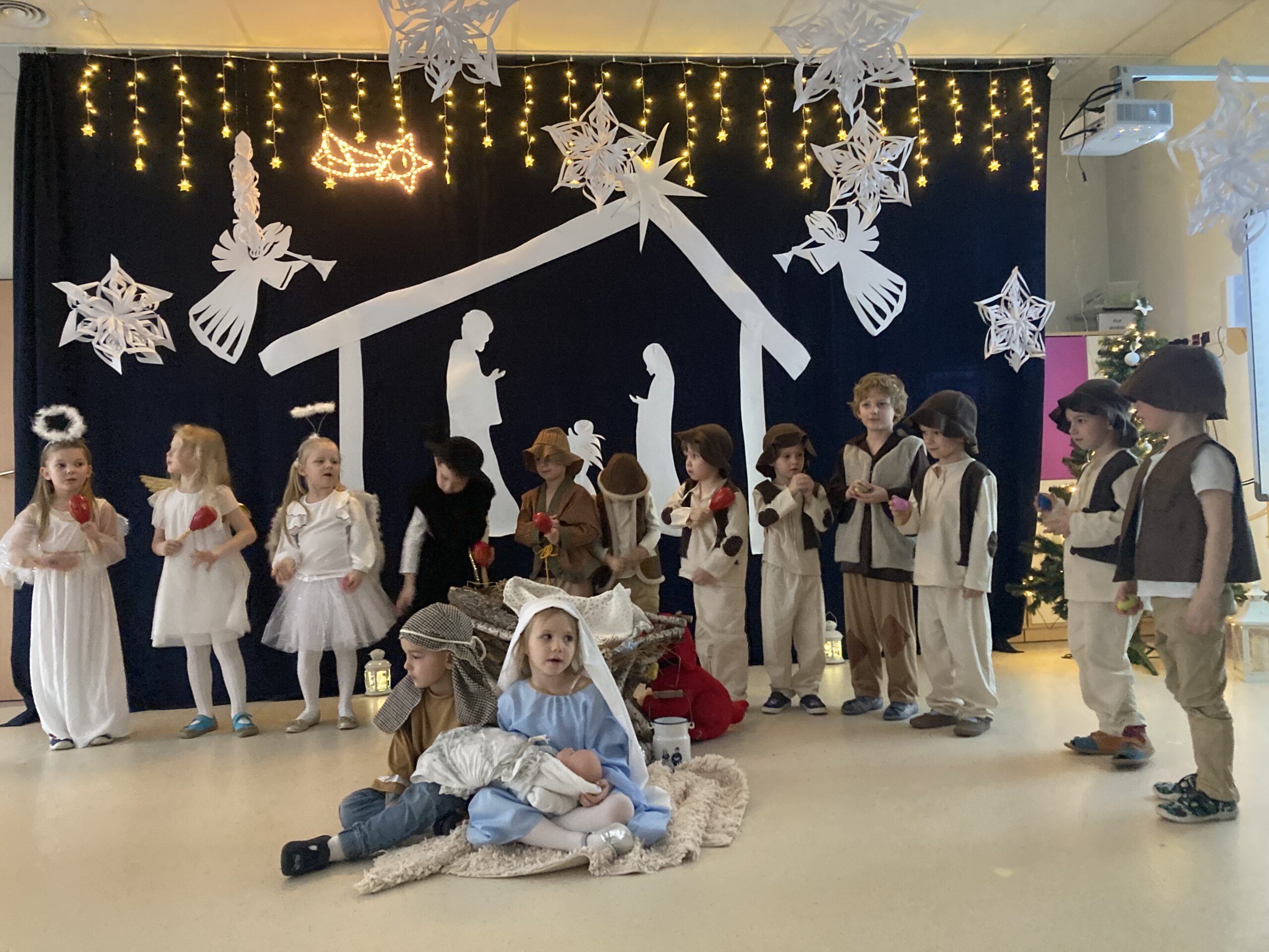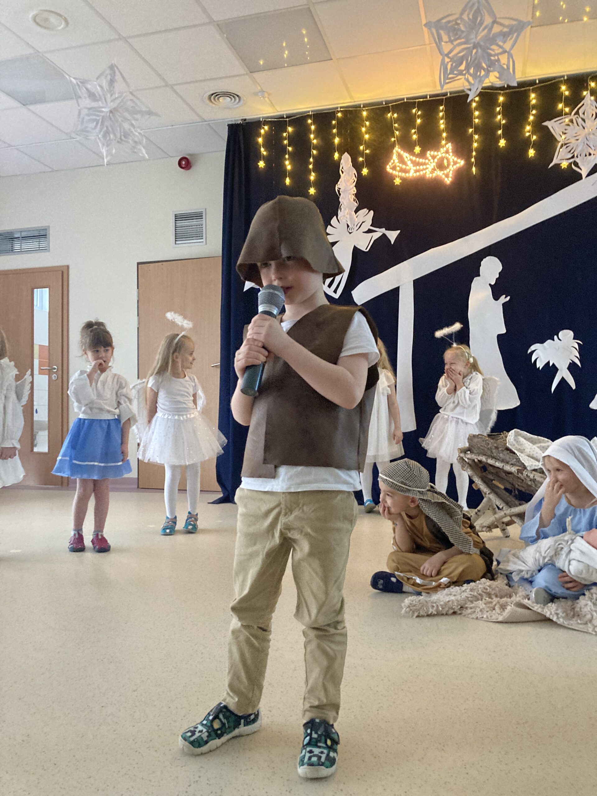 Przedszkolaki z grupy VI przedstawiły Jasełka, czyli widowisko o Bożym Narodzeniu. Tygryski wcieliły się w role Maryi i Józefa, pasterzy, aniołów, Trzech Króli, przybywających do Betlejem, aby złożyć pokłon Jezusowi narodzonemu w ubogiej stajence. Mali aktorzy, we wspaniałych strojach prezentowali się doskonale na tle bożonarodzeniowej dekoracji – stajenki z Józefem, Maryją i Dzieciątkiem. Mali artyści z ogromnym zaangażowaniem odtwarzali swoje role, prezentowali umiejętności recytatorskie i wokalne. Przedstawione Jasełka na pewno na długo pozostaną w pamięci dzieci, ich bliskich i wszystkich.