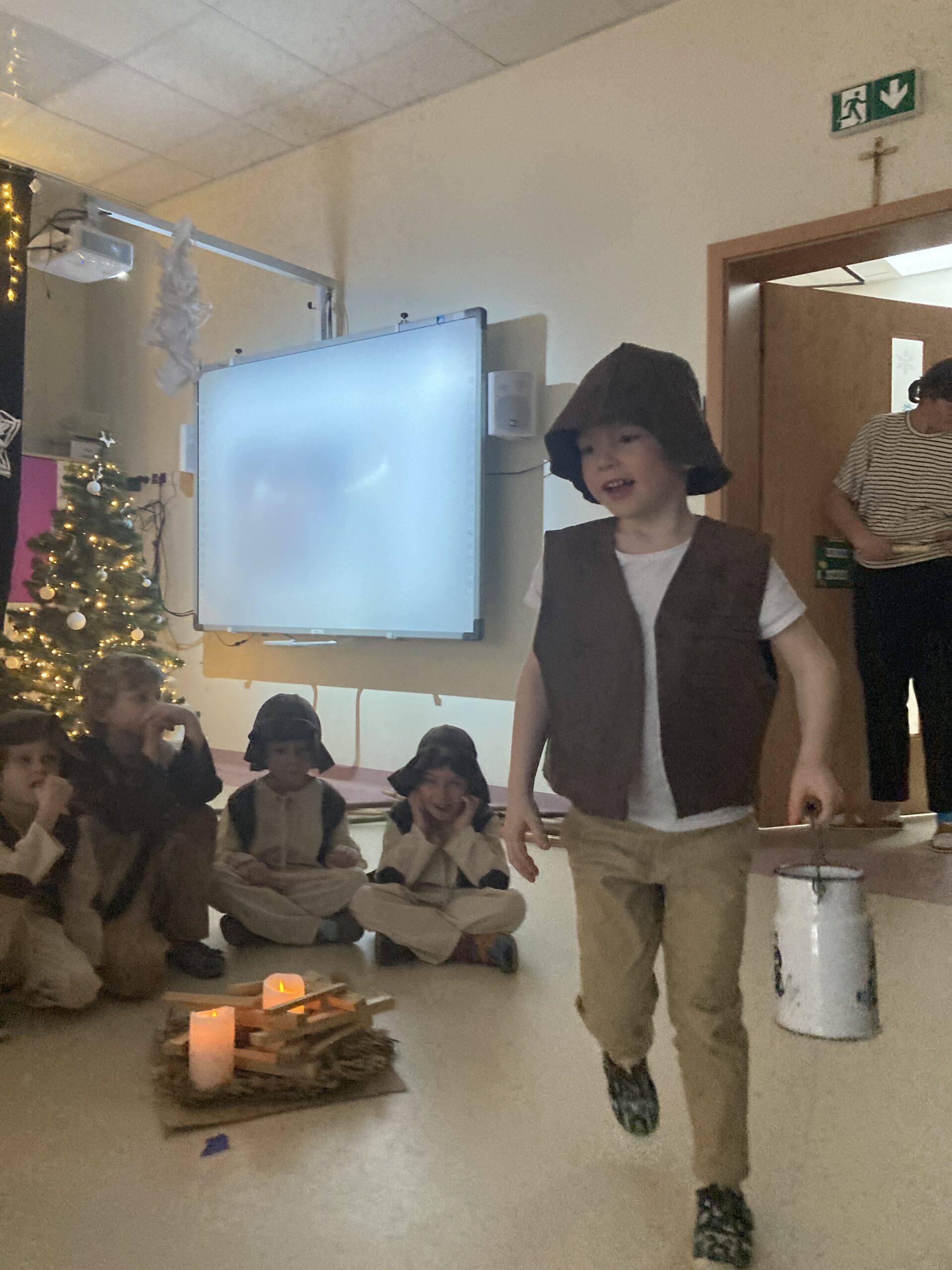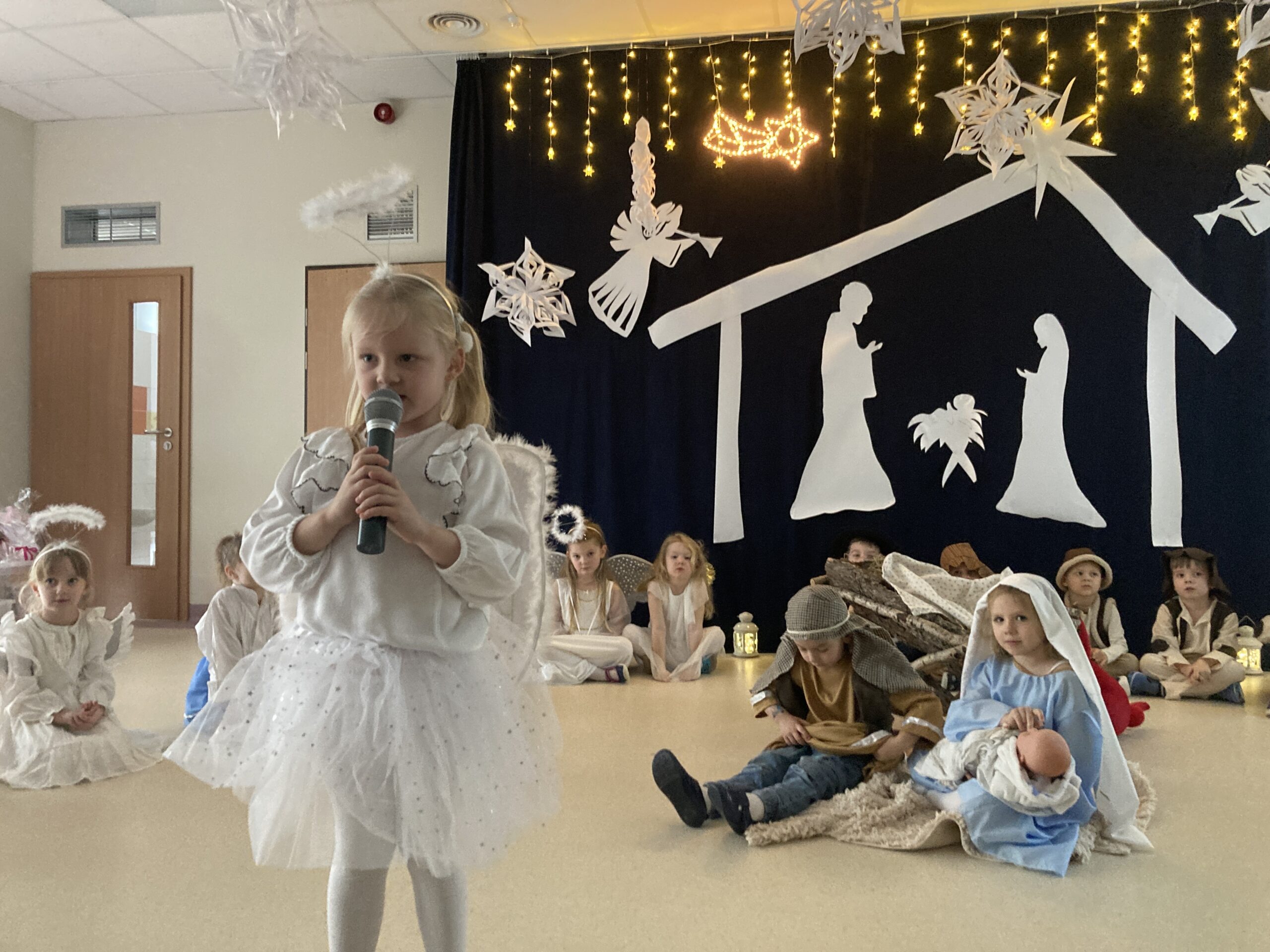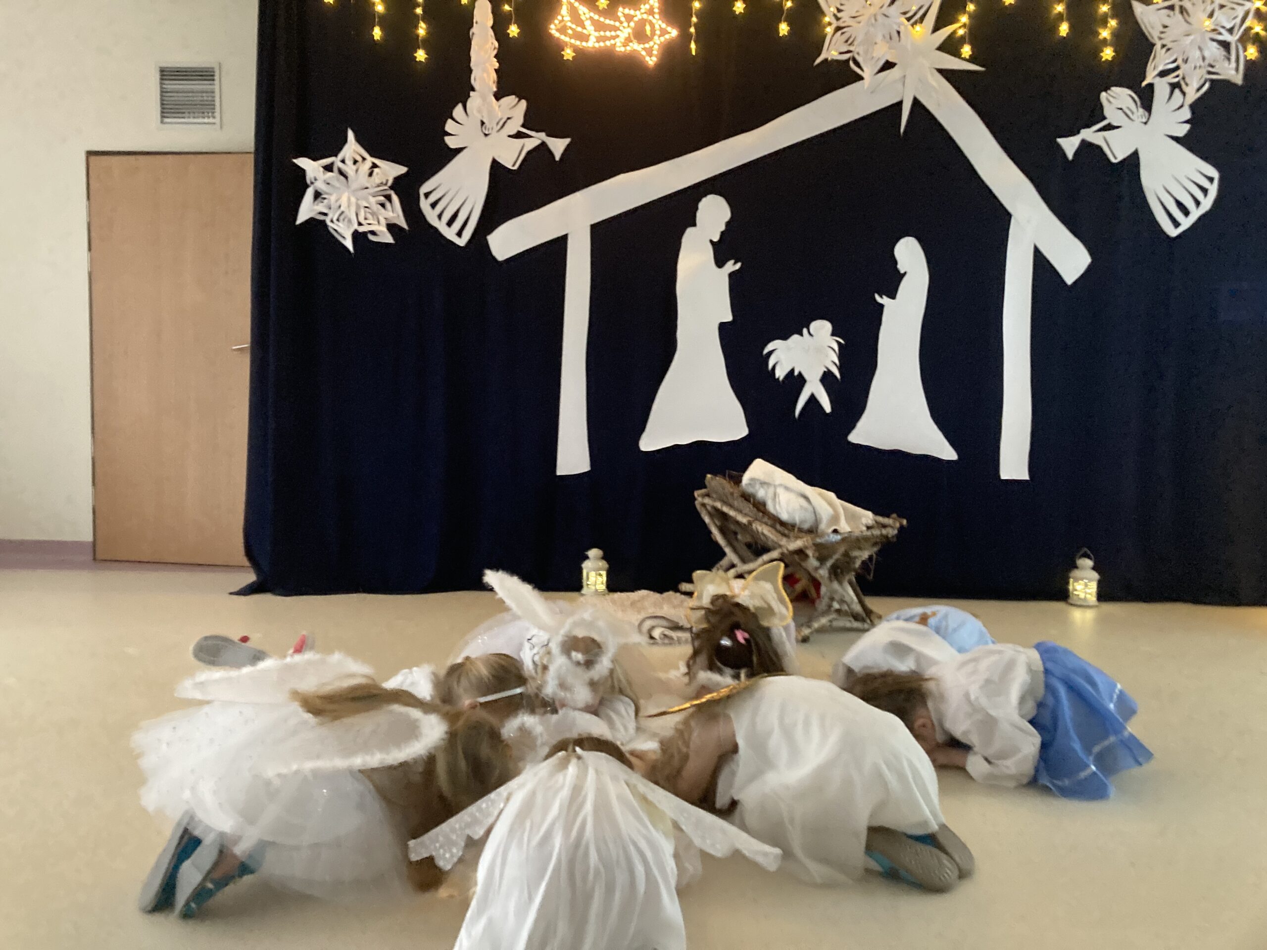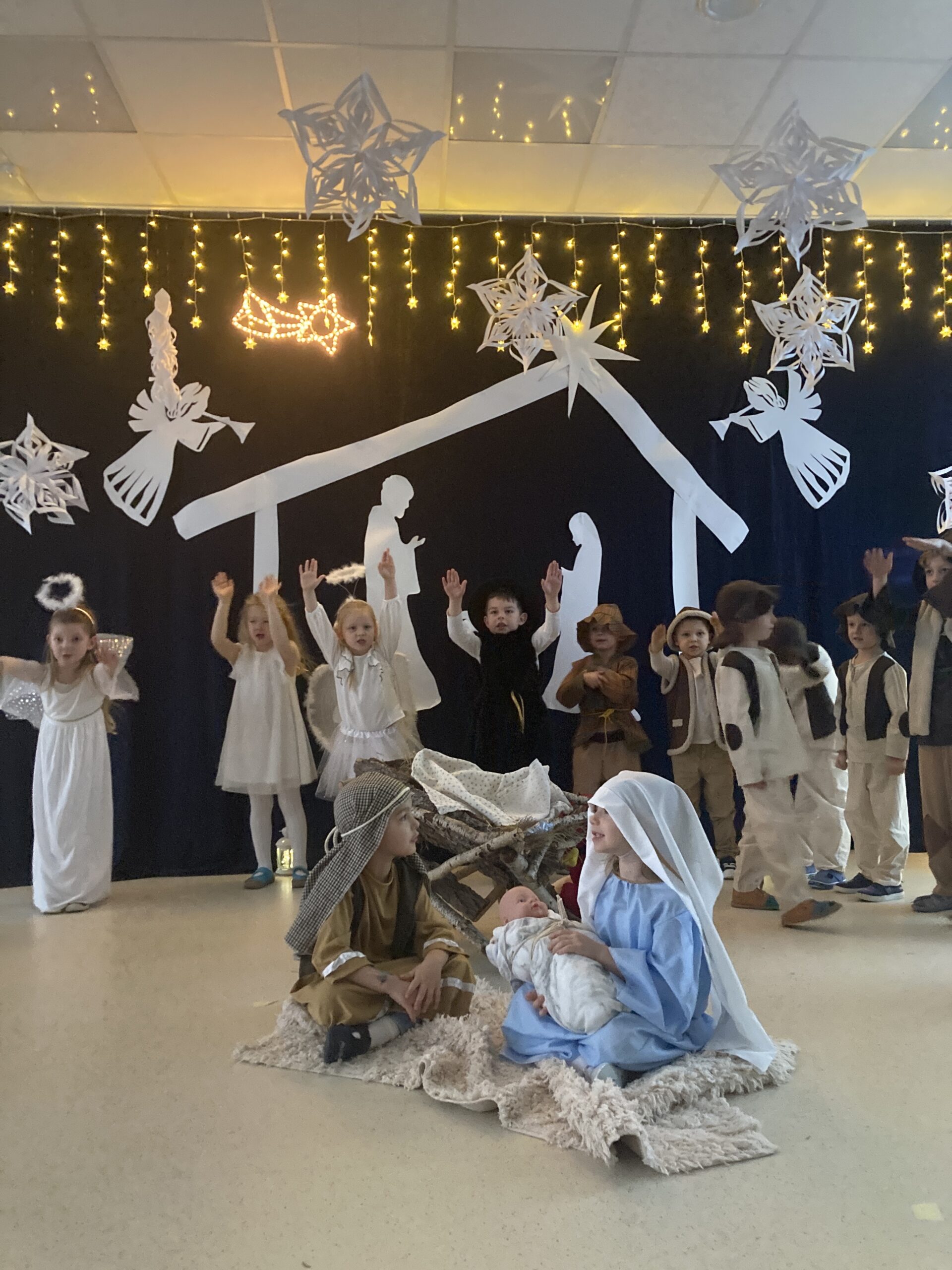 Przedszkolaki z grupy VI przedstawiły Jasełka, czyli widowisko o Bożym Narodzeniu. Tygryski wcieliły się w role Maryi i Józefa, pasterzy, aniołów, Trzech Króli, przybywających do Betlejem, aby złożyć pokłon Jezusowi narodzonemu w ubogiej stajence. Mali aktorzy, we wspaniałych strojach prezentowali się doskonale na tle bożonarodzeniowej dekoracji – stajenki z Józefem, Maryją i Dzieciątkiem. Mali artyści z ogromnym zaangażowaniem odtwarzali swoje role, prezentowali umiejętności recytatorskie i wokalne. Przedstawione Jasełka na pewno na długo pozostaną w pamięci dzieci, ich bliskich i wszystkich.