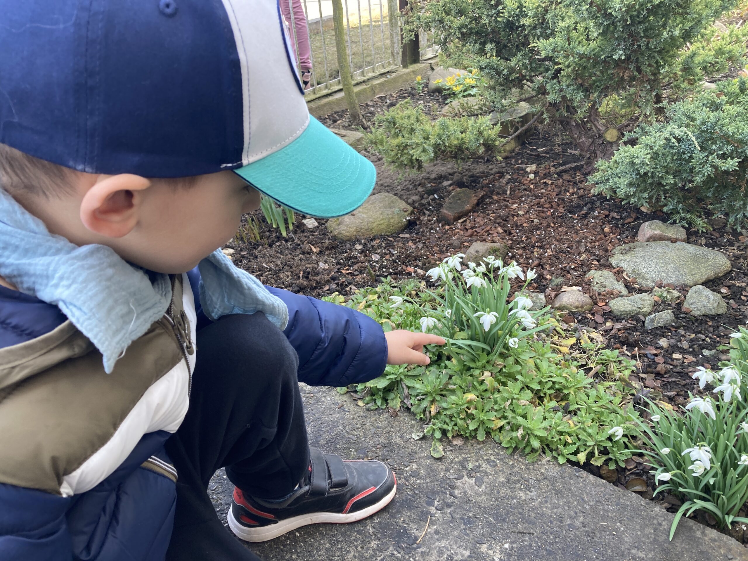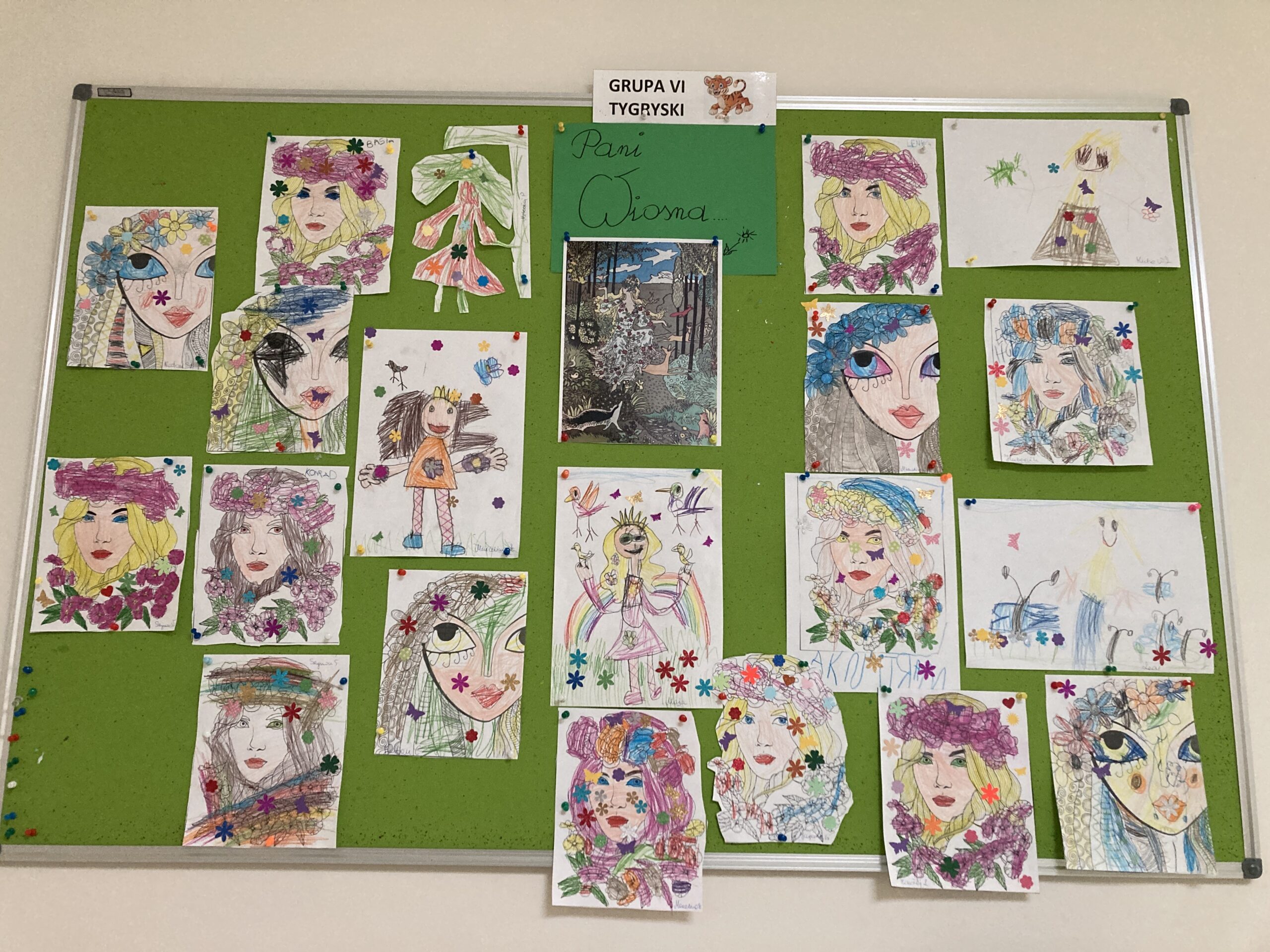 Tygryski wypatrywały dziś pierwszych oznak nadchodzącej wiosny. Odnalazły pierwsze wiosenne kwiaty: przebiśniegi, fiołki, leszczynę, krokusy, stokrotki i tulipany. Przedszkolaki dowiedziały się jakie prace wykonuje się w ogrodzie wczesną wiosną oraz jakich narzędzi używa się do prac w ogrodzie. Przypomniały sobie również jakie ptaki wracają do nas wiosną. Następnie stworzyły wizerunek Pani Wiosny.