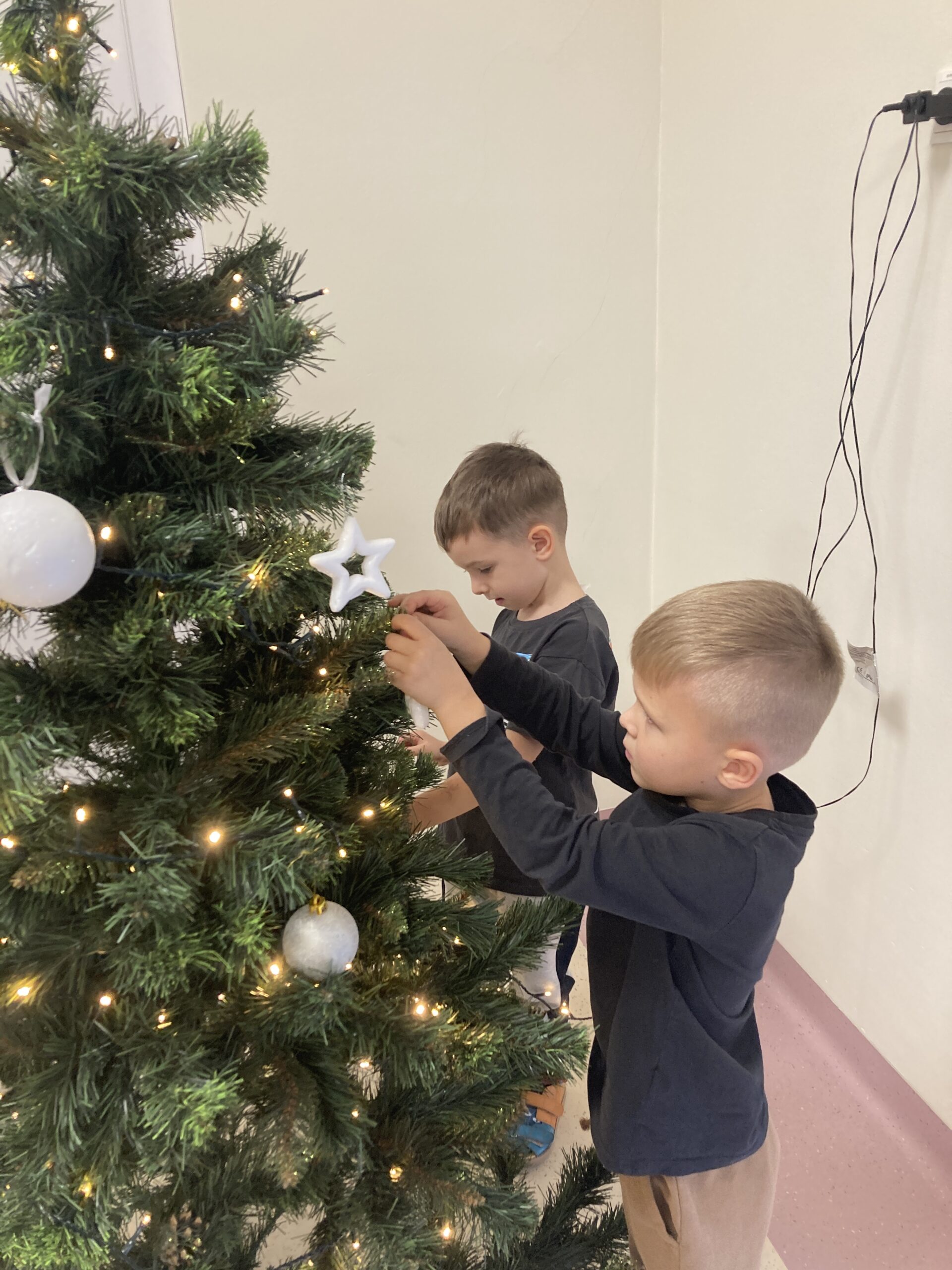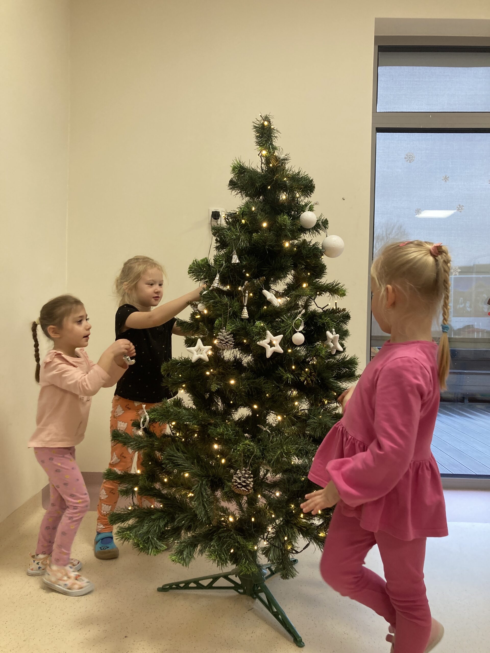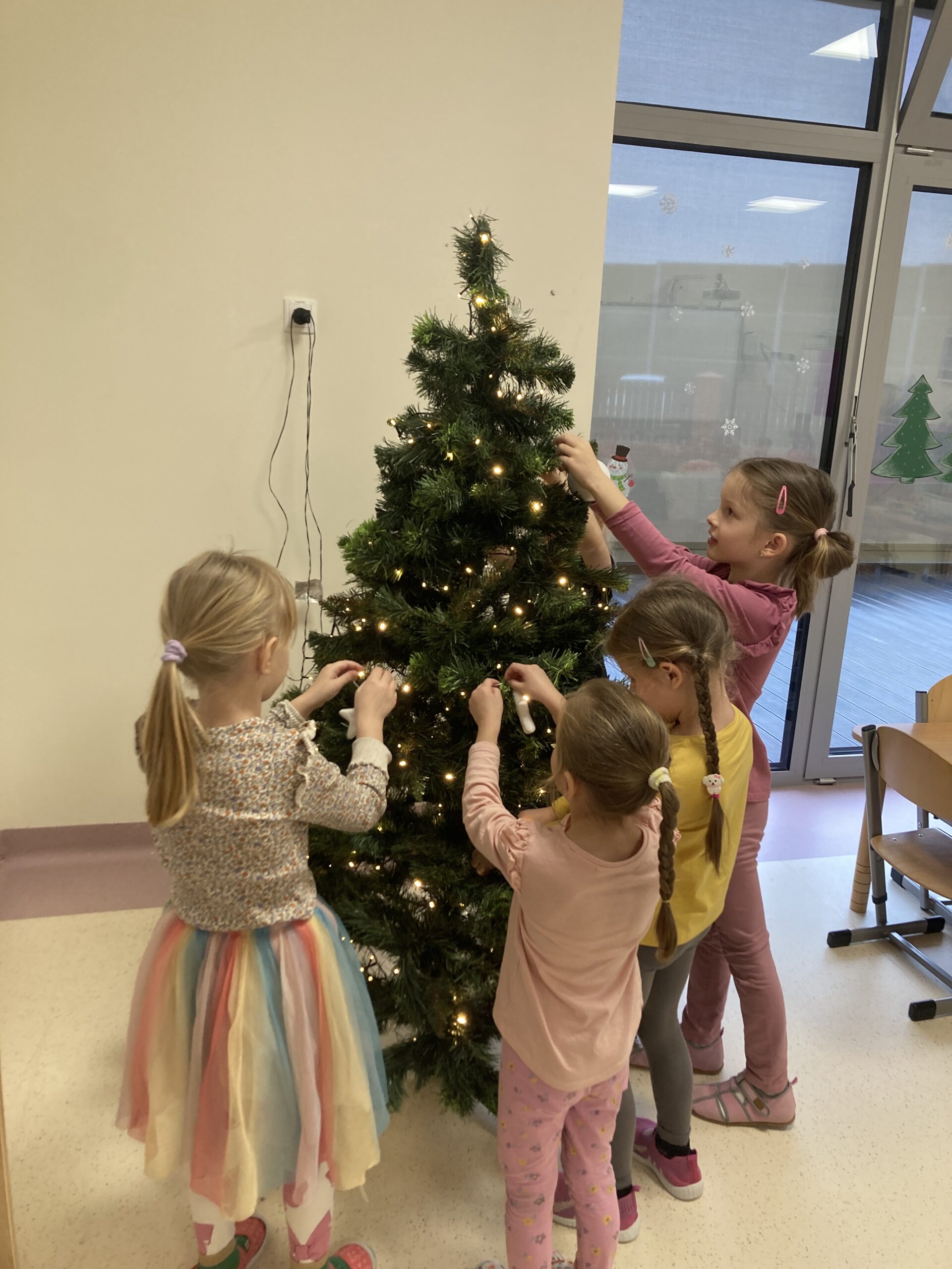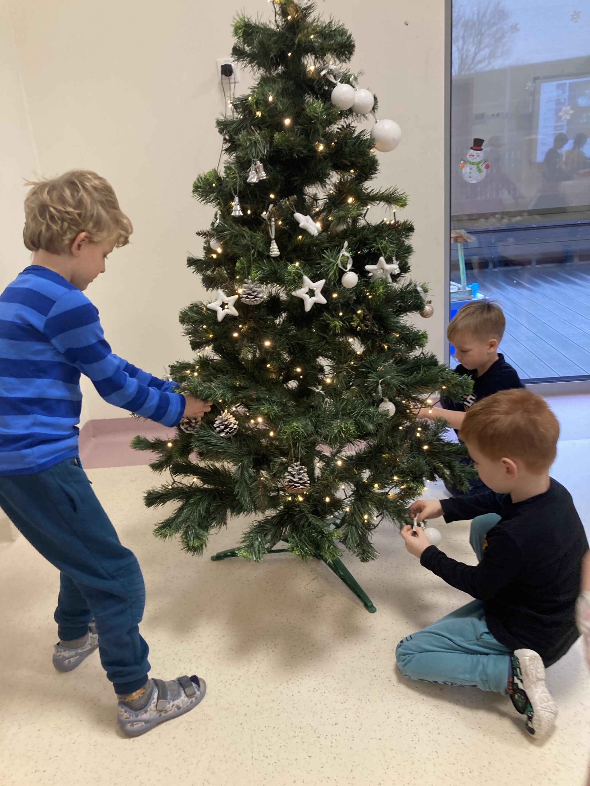 Święta Bożego Narodzenia wiążą się z tradycją ubierania choinki. Dlatego dzieci z grupy Tygryski udekorowały dziś świąteczne drzewko. Przedszkolaki z wielkim zaangażowaniem zawieszały choinkowe ozdoby: bombki, gwiazdki i łańcuchy, oraz własnoręcznie robione ozdoby. Było mnóstwo radości a w sali od razu zrobiło się świątecznie. Choinka przypomina nam, że Święta Bożego Narodzenia już tuż, tuż… Nie mogło zabraknąć również grupowego zdjęcia pod świątecznym drzewkiem.