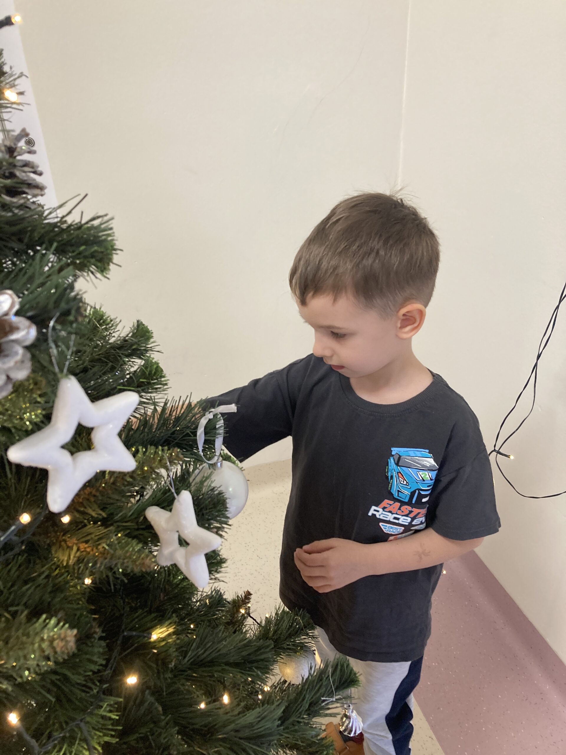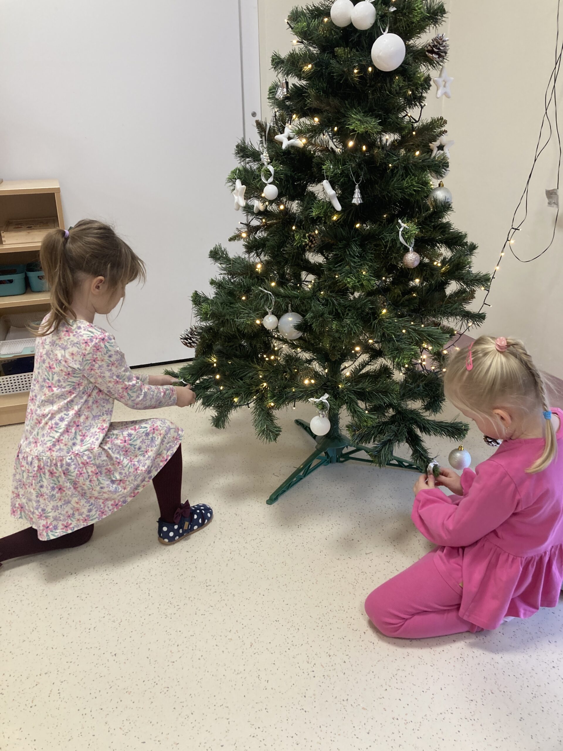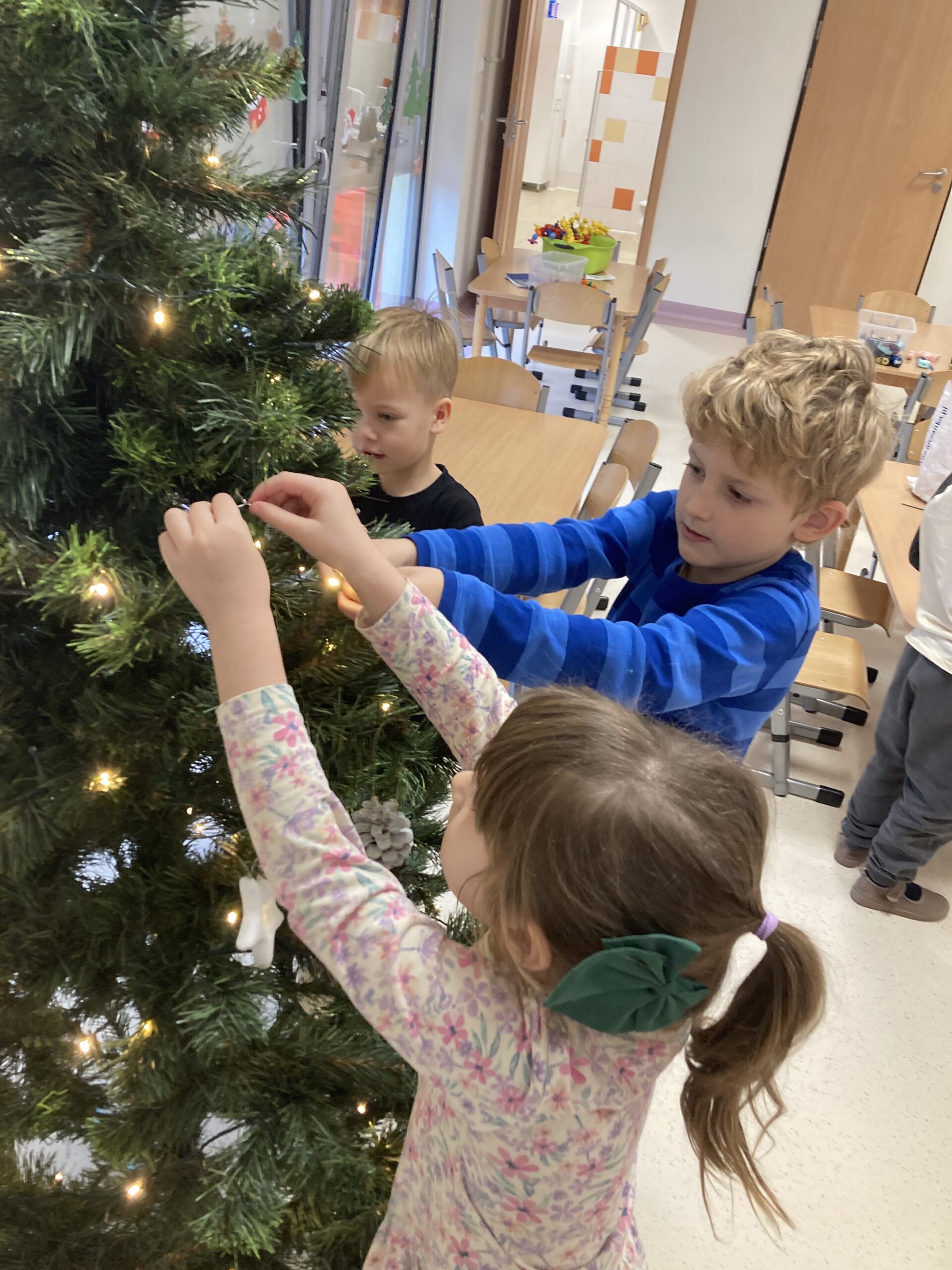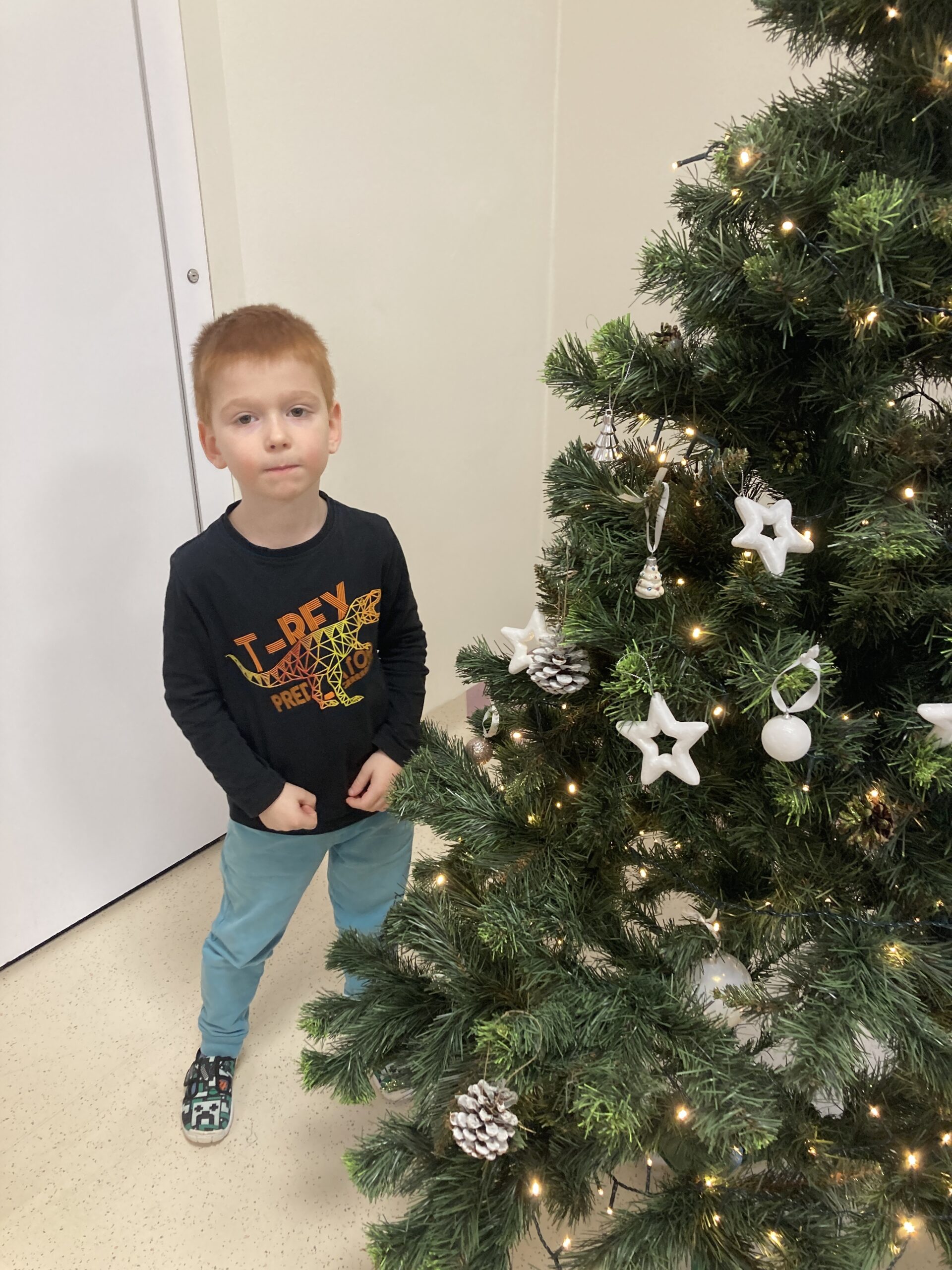 Święta Bożego Narodzenia wiążą się z tradycją ubierania choinki. Dlatego dzieci z grupy Tygryski udekorowały dziś świąteczne drzewko. Przedszkolaki z wielkim zaangażowaniem zawieszały choinkowe ozdoby: bombki, gwiazdki i łańcuchy, oraz własnoręcznie robione ozdoby. Było mnóstwo radości a w sali od razu zrobiło się świątecznie. Choinka przypomina nam, że Święta Bożego Narodzenia już tuż, tuż… Nie mogło zabraknąć również grupowego zdjęcia pod świątecznym drzewkiem.