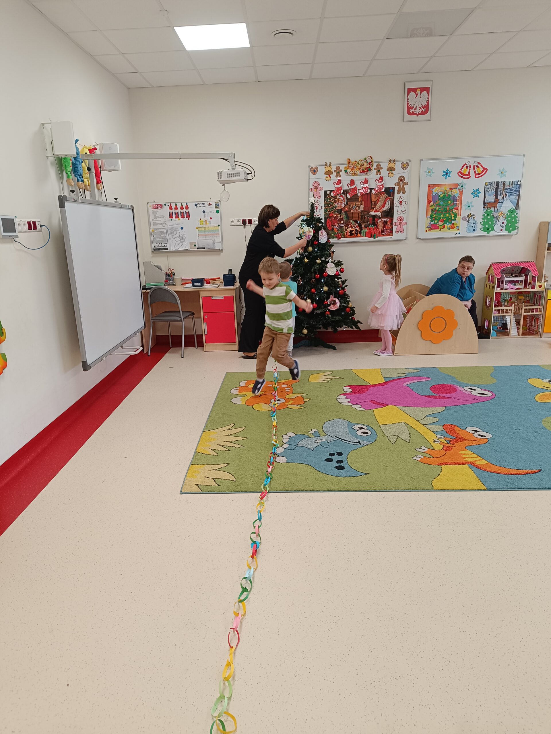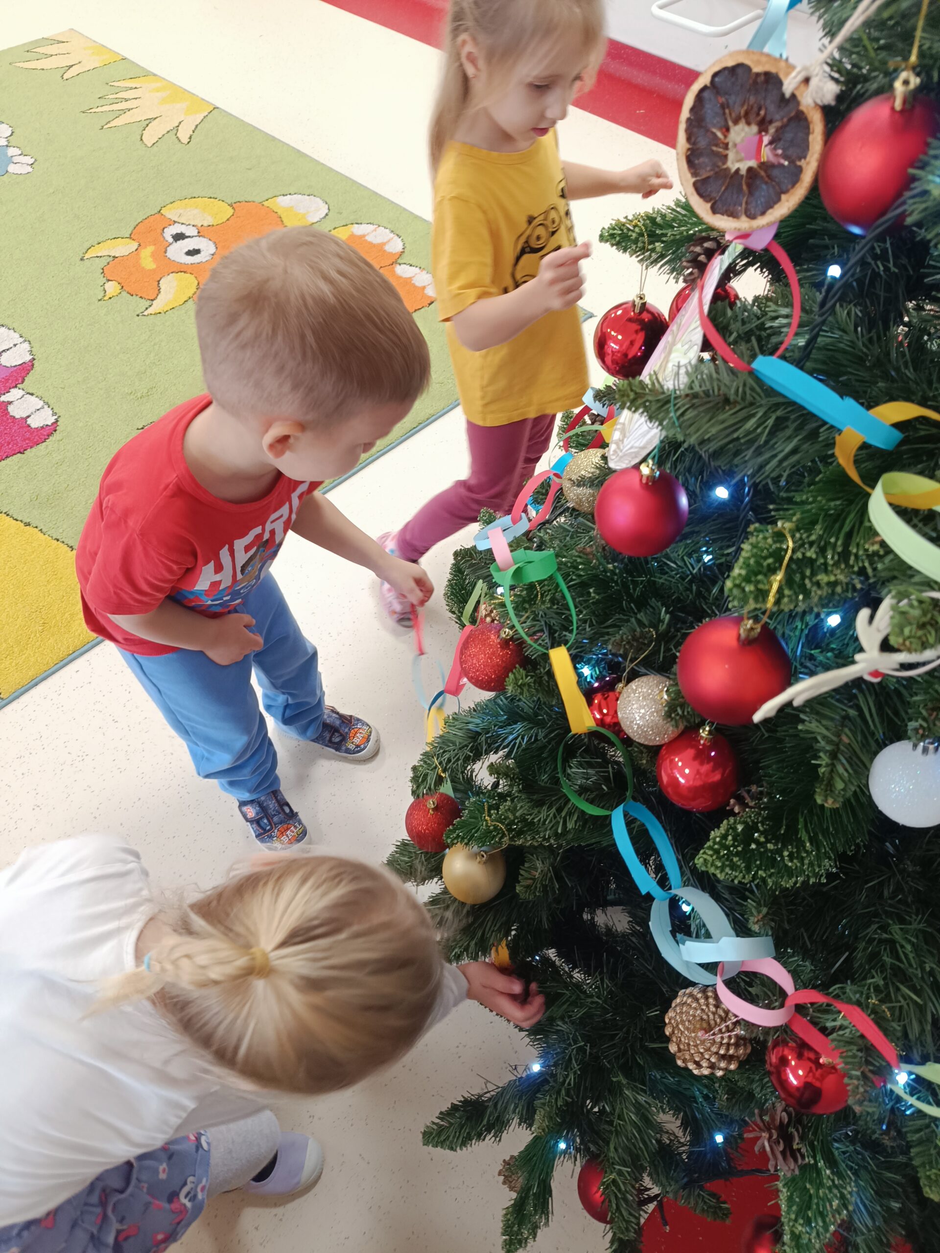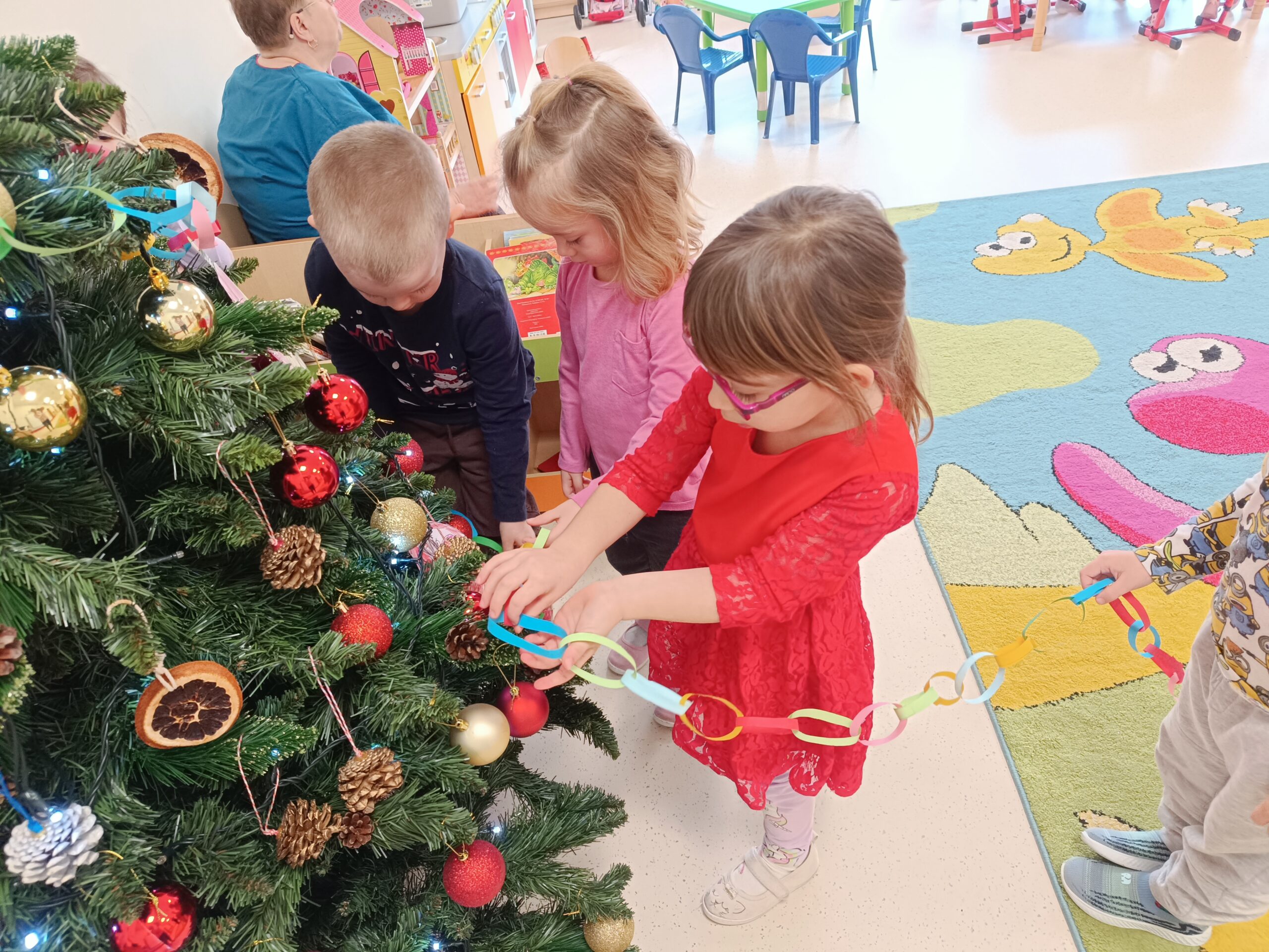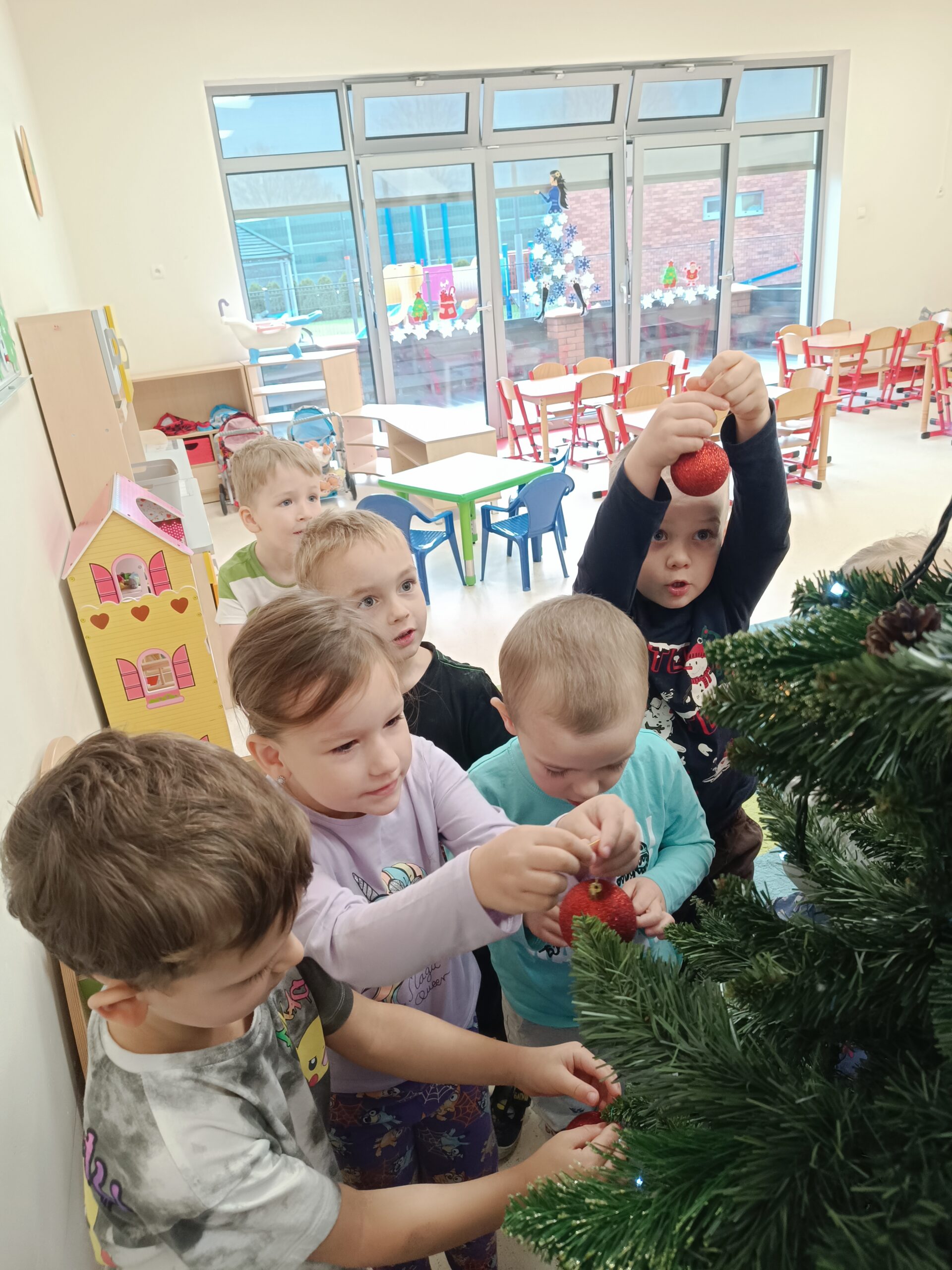 Święta tuż, tuż, więc grupa Biedronek postanowiła ubrać choinkę. Celem zajęć było poznanie tradycji ubierania choinki oraz wykonanie łańcucha z kolorowych pasków papieru. Dzieci starannie wycinały i łączyły ogniwa łańcucha. Każde dziecko wykonało swoją część, następnie wszystkie zostały złączone w jeden wielki łańcuch choinkowy. Zawieszenie własnoręcznie wykonanej ozdoby na choinkę okazało się bardzo ekscytującym przeżyciem.