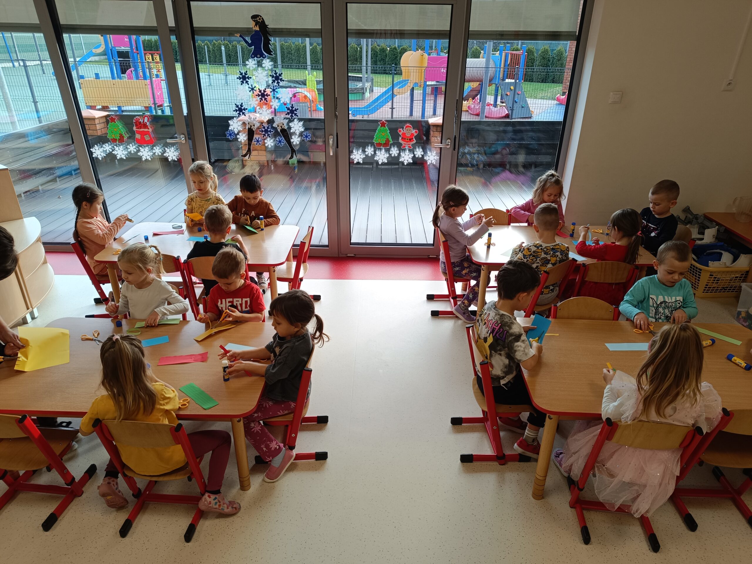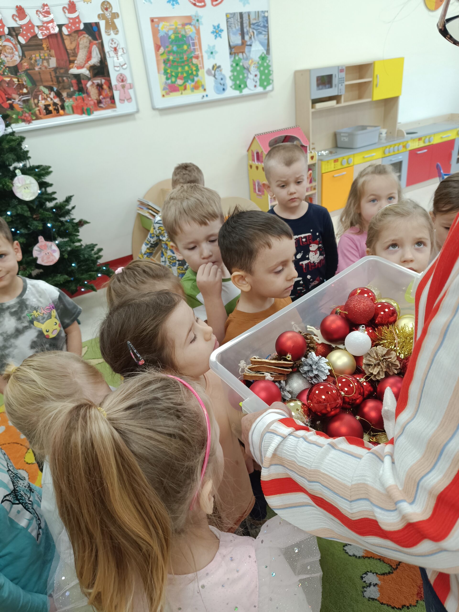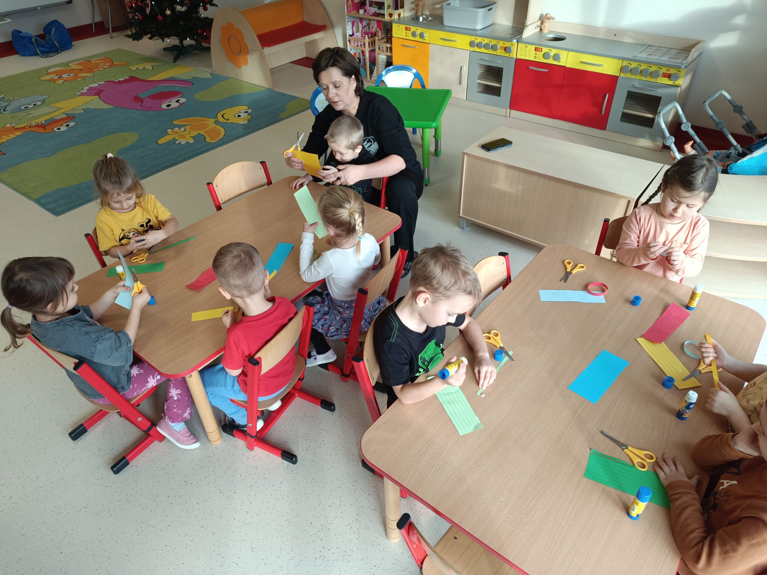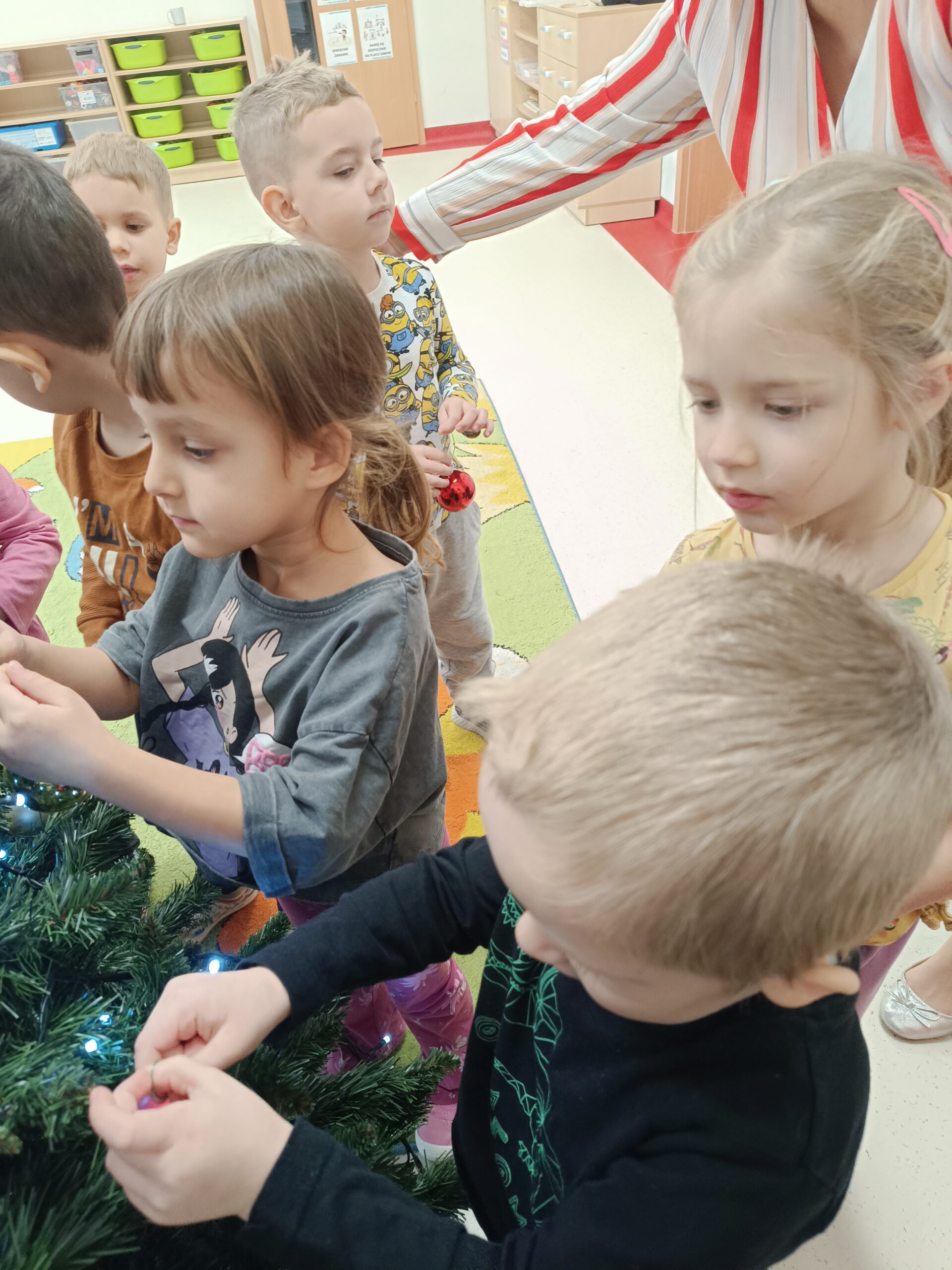 Święta tuż, tuż, więc grupa Biedronek postanowiła ubrać choinkę. Celem zajęć było poznanie tradycji ubierania choinki oraz wykonanie łańcucha z kolorowych pasków papieru. Dzieci starannie wycinały i łączyły ogniwa łańcucha. Każde dziecko wykonało swoją część, następnie wszystkie zostały złączone w jeden wielki łańcuch choinkowy. Zawieszenie własnoręcznie wykonanej ozdoby na choinkę okazało się bardzo ekscytującym przeżyciem.