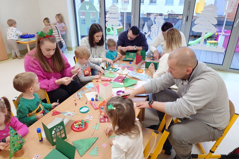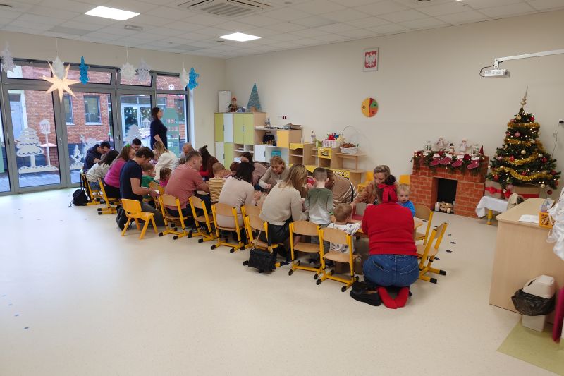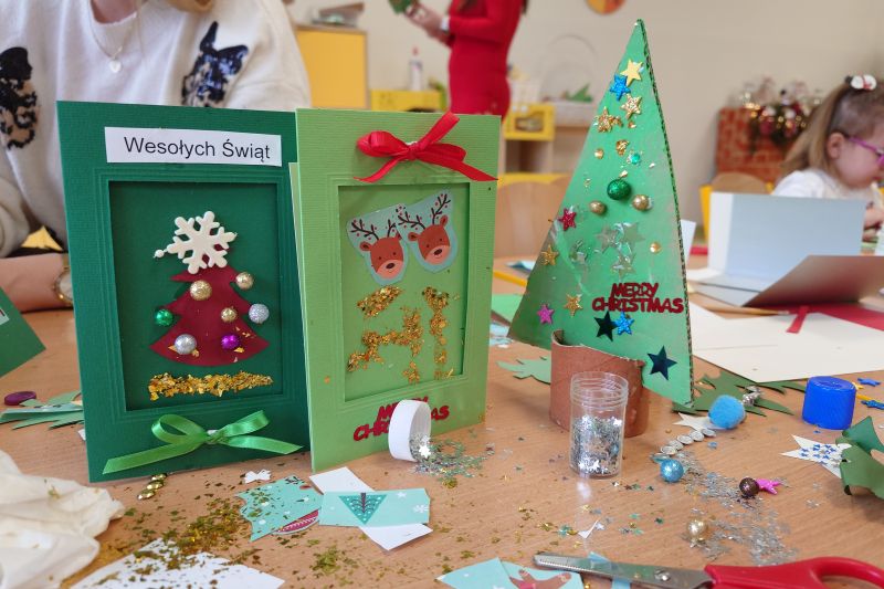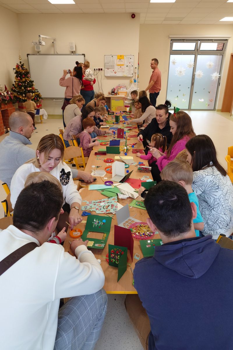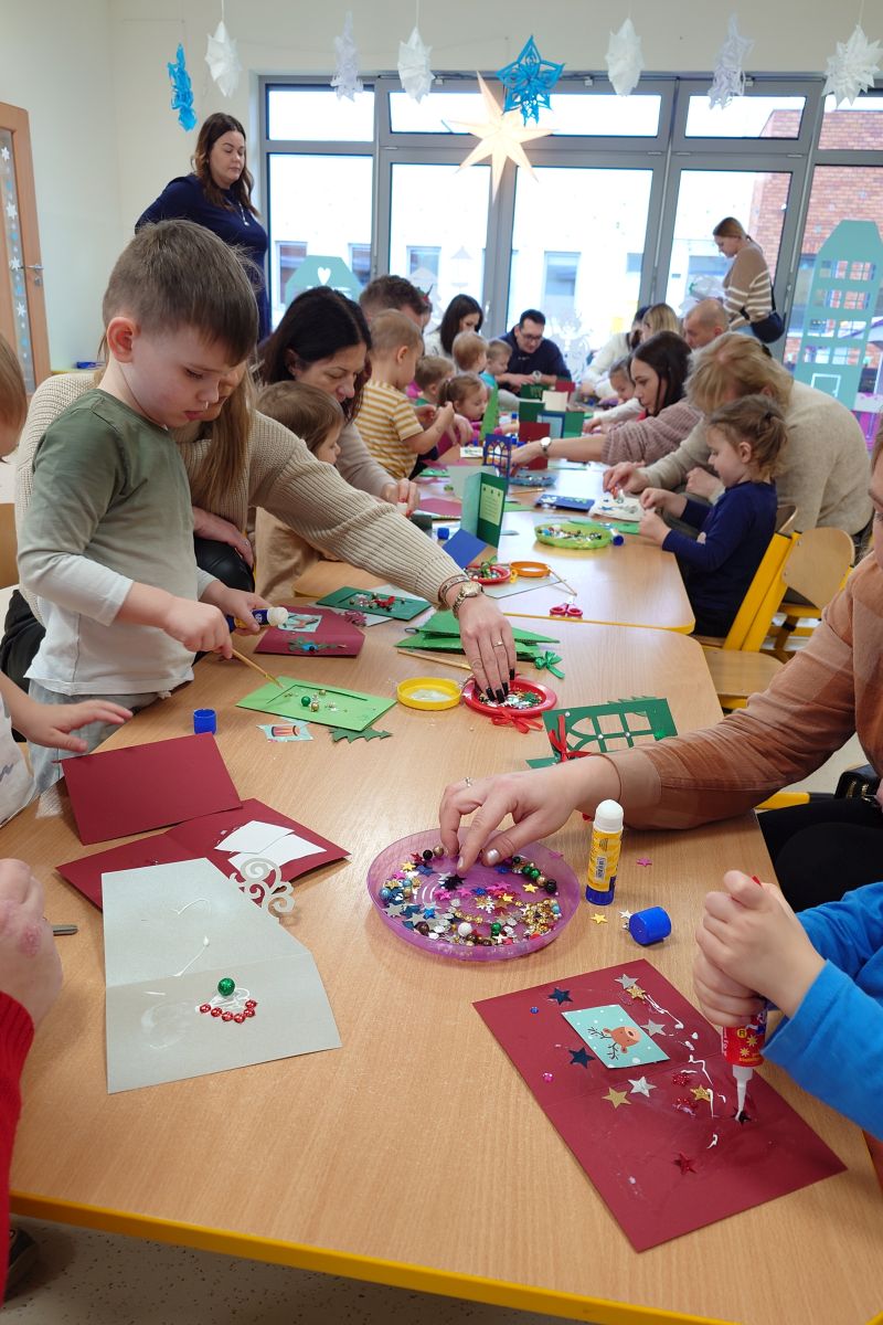 Święta Bożego Narodzenia to szczególny czas. Zapach pomarańczy, piernika i przystrojona choinka – to buduje magiczny świąteczny klimat. I właśnie po to, aby i w naszym przedszkolu zagościła świąteczna atmosfera. 11 grudnia zorganizowałyśmy w grupie 3 latków warsztaty Świąteczne z udziałem rodziców. Celem było wykonanie kartek świątecznych oraz choineczek z papieru. Rodzice i dzieci z zapałem wykonywali piękne ozdoby, wykazując przy tym wiele pomysłowości i kreatywności. Wspólna twórczość w atmosferze zabawy, zaangażowanie, przeżyte emocje, a co najważniejsze czas, który dzieci spędziły z rodzicami to bardzo cenne doświadczenie dla obu stron. Zachęcamy do jak najczęstszych zabaw plastycznych w domu. Budują one wzajemną więź, rozbudzają wyobraźnię i są okazją do wzajemnego, głębszego poznania. Serdecznie dziękujemy rodzicom za przybycie i wspólnie spędzony czas.