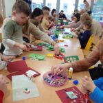 Święta Bożego Narodzenia to szczególny czas. Zapach pomarańczy, piernika i przystrojona choinka – to buduje magiczny świąteczny klimat. I właśnie po to, aby i w naszym przedszkolu zagościła świąteczna atmosfera. 11 grudnia zorganizowałyśmy w grupie 3 latków warsztaty Świąteczne z udziałem rodziców. Celem było wykonanie kartek świątecznych oraz choineczek z papieru. Rodzice i dzieci z zapałem wykonywali piękne ozdoby, wykazując przy tym wiele pomysłowości i kreatywności. Wspólna twórczość w atmosferze zabawy, zaangażowanie, przeżyte emocje, a co najważniejsze czas, który dzieci spędziły z rodzicami to bardzo cenne doświadczenie dla obu stron. Zachęcamy do jak najczęstszych zabaw plastycznych w domu. Budują one wzajemną więź, rozbudzają wyobraźnię i są okazją do wzajemnego, głębszego poznania. Serdecznie dziękujemy rodzicom za przybycie i wspólnie spędzony czas.