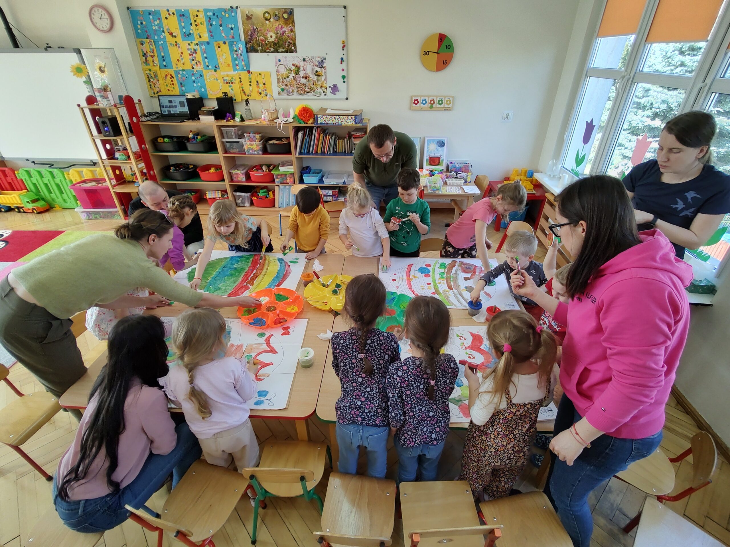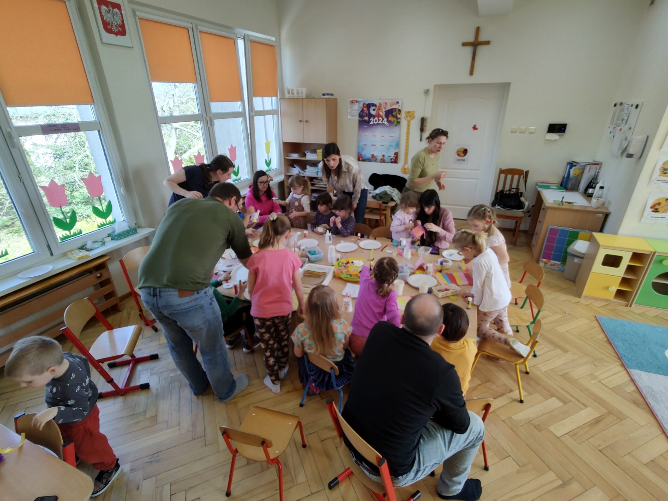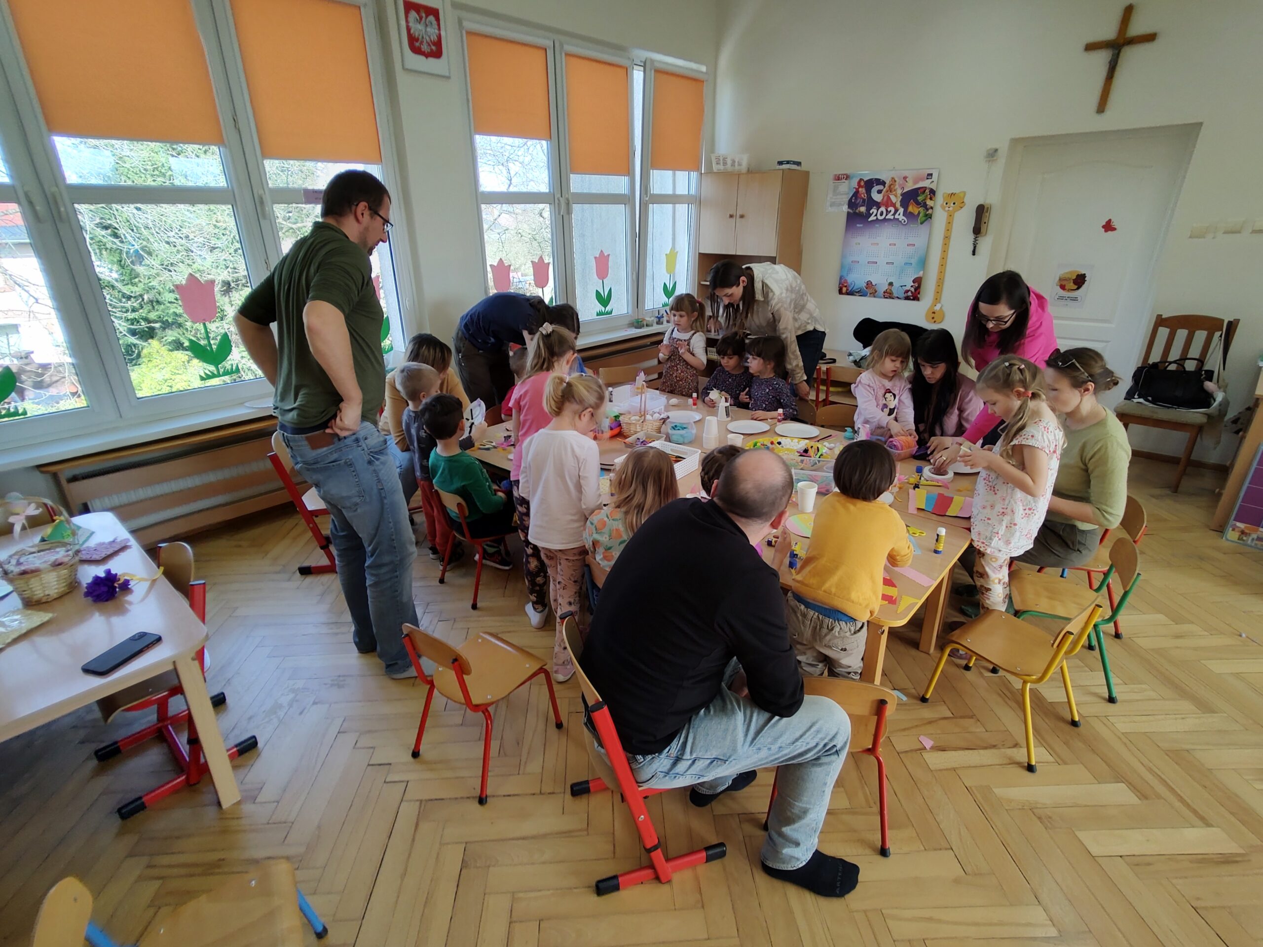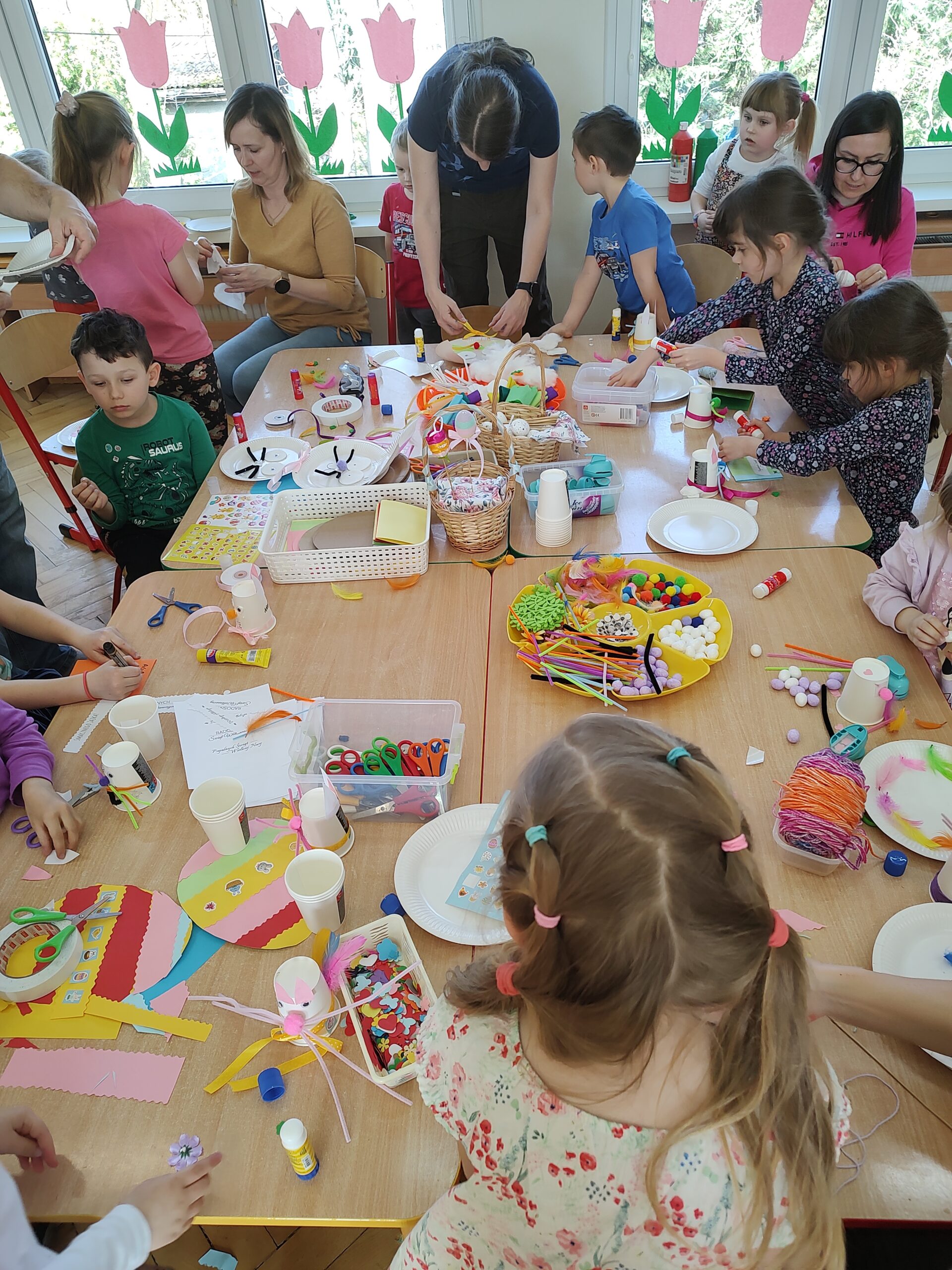 W grupie Jagódki odbyły się warsztaty wielkanocne z rodzicami. Po przybyciu wszystkich gości zaczęliśmy spotkanie zabawą integracyjną na dywanie , następnie dzieci ze swoimi bliskimi pomalowały ogromne pisanki . W drugiej części warsztatów wykonywaliśmy kreatywne pracę plastyczno – techniczne tj. zajączki z talerzyków lub kubeczków papierowych , wiosenne kwiaty , ozdabialiśmy styropianowe jajeczka oraz robiliśmy piękne kartki świąteczne.