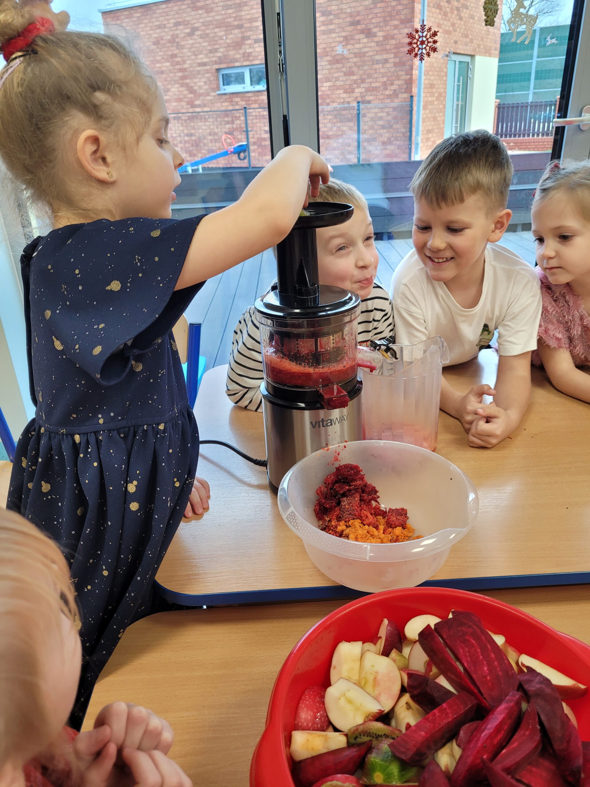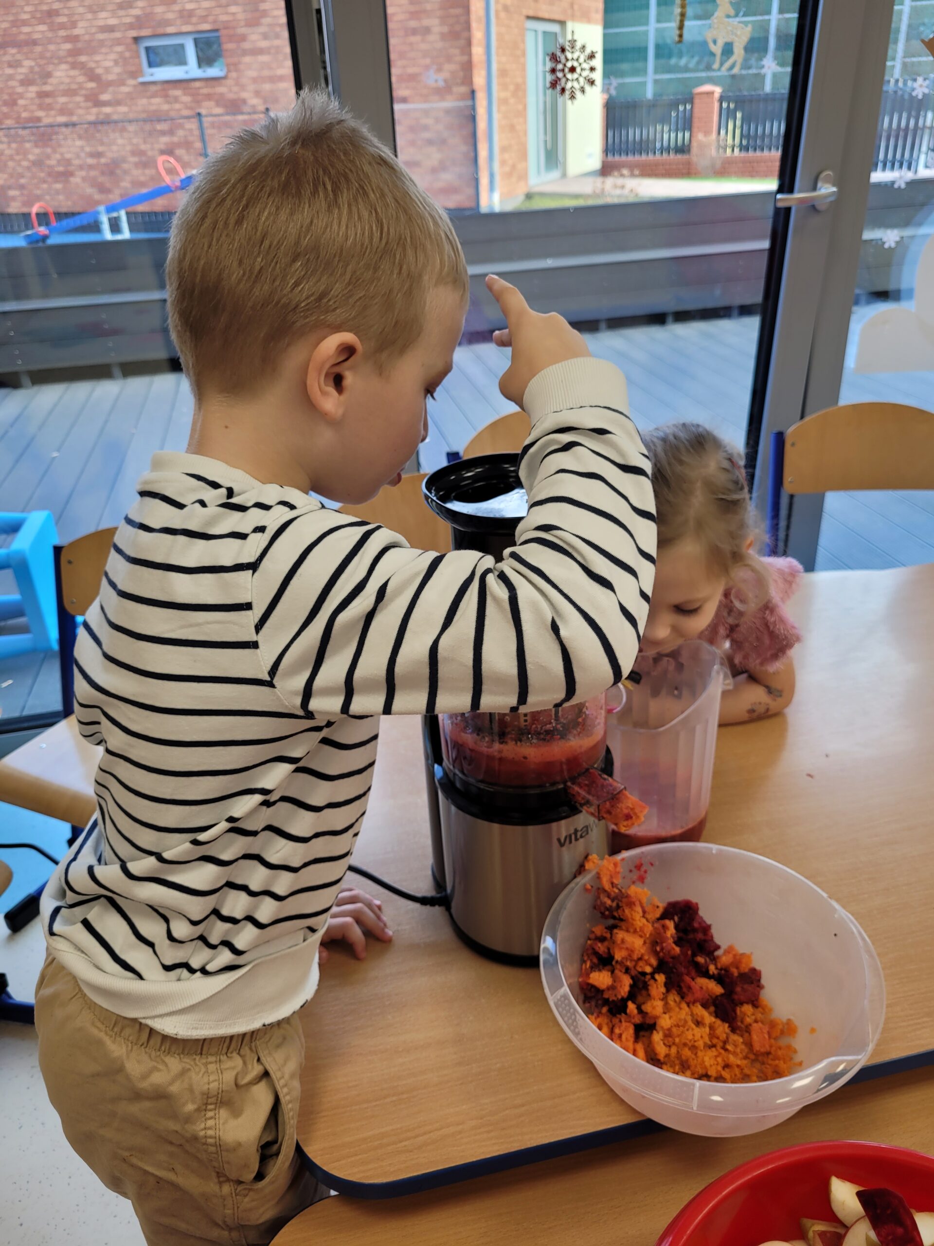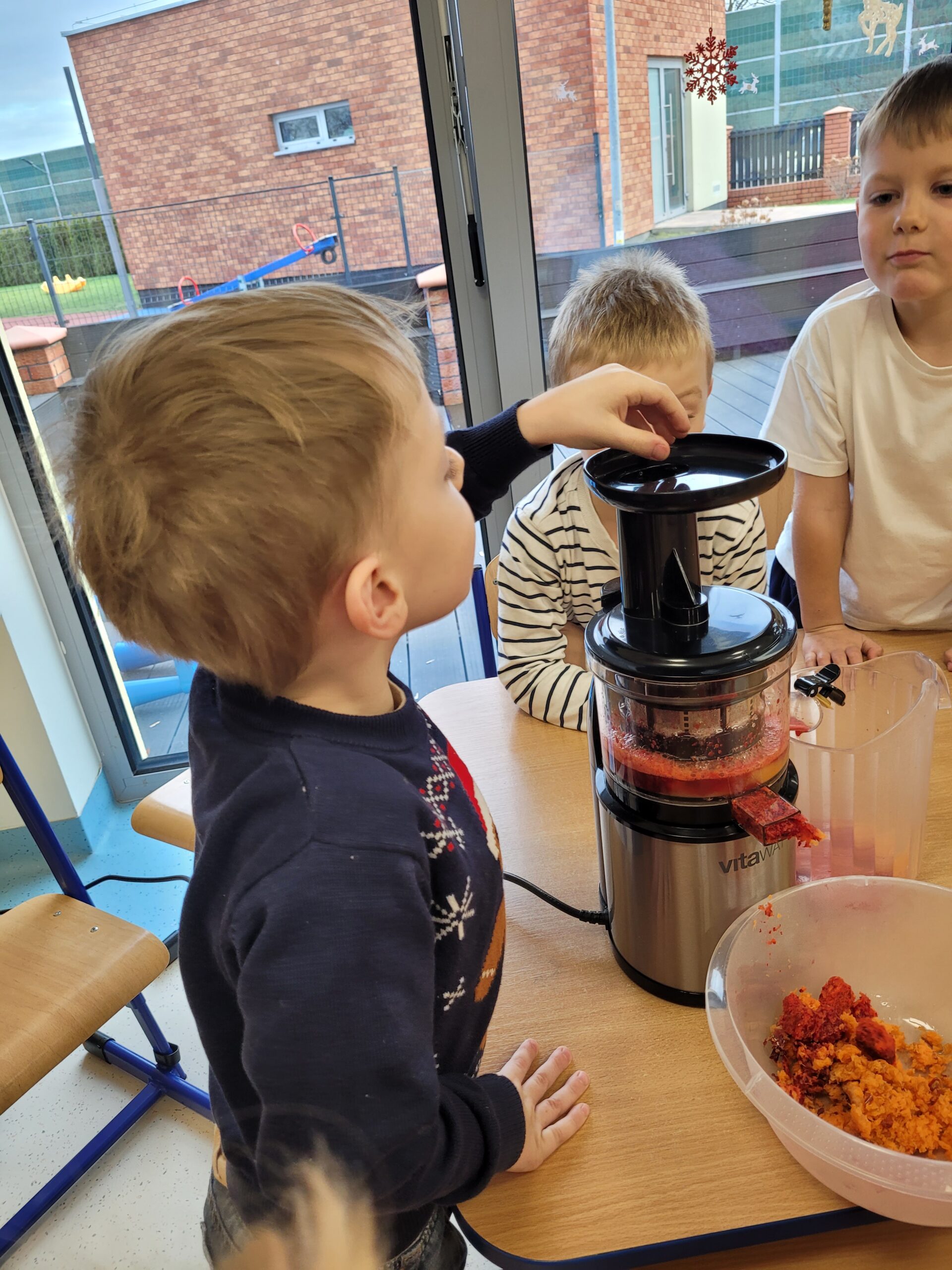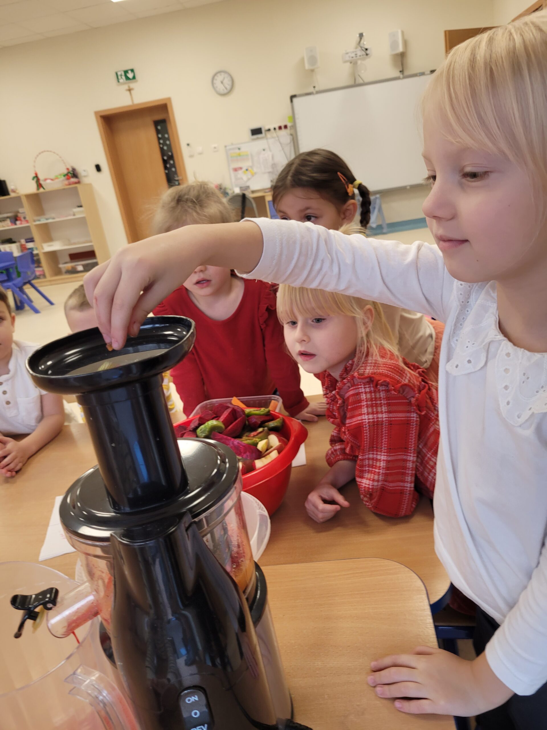 Najwięcej witaminy mają …. owoce i warzywa! Dzieci z grupy Kropek wiedzą o tym doskonalenie, dlatego co jakiś czas przygotowujemy sok ze świeżych warzyw o owoców.