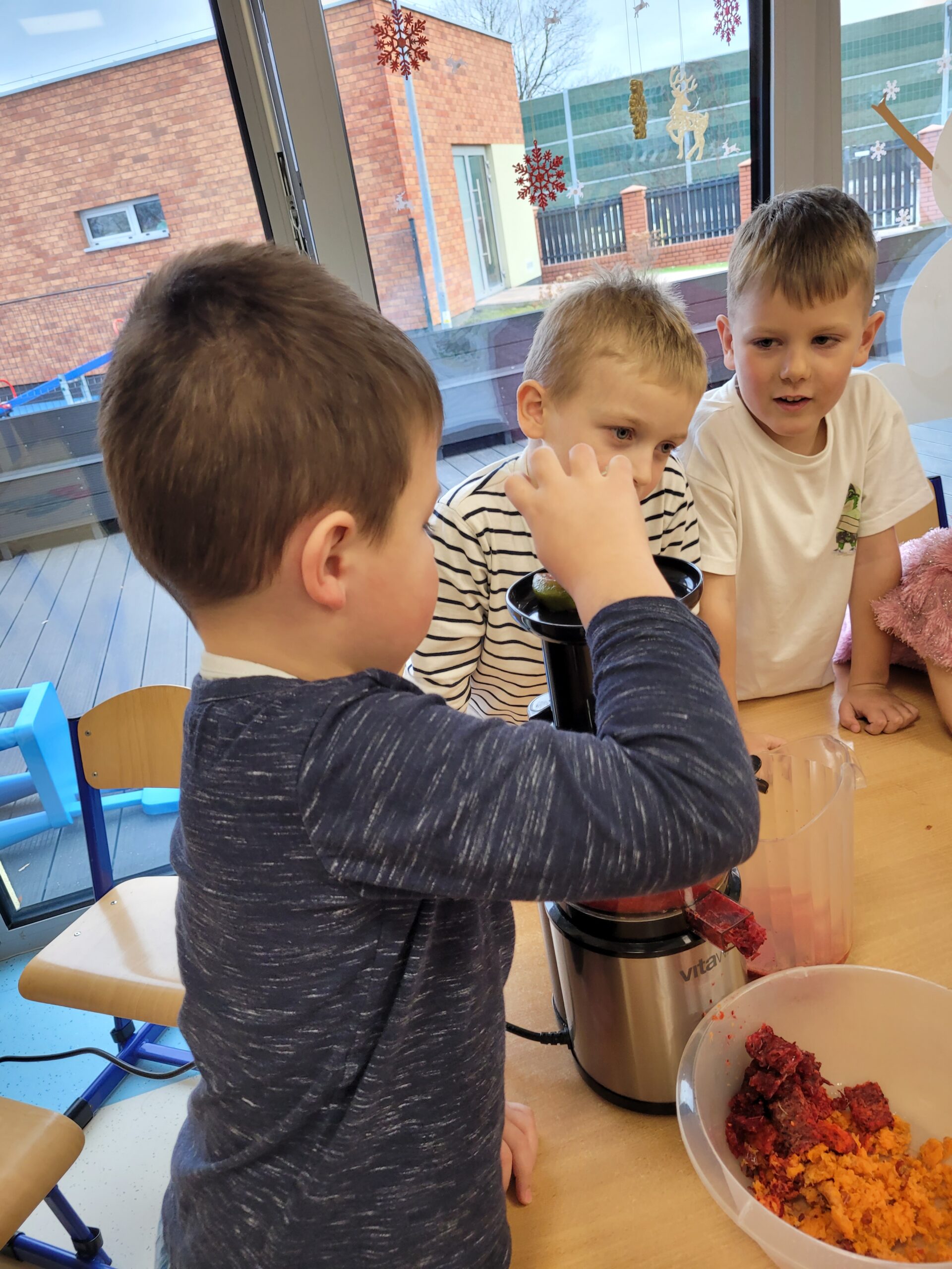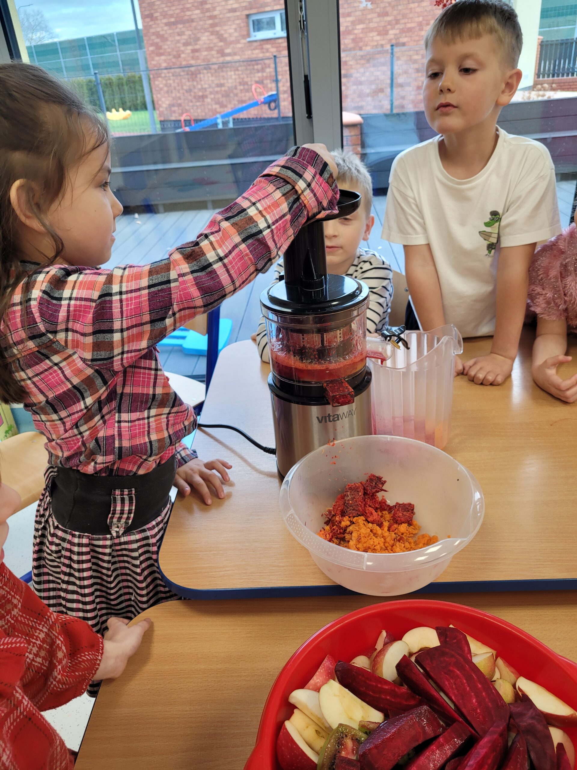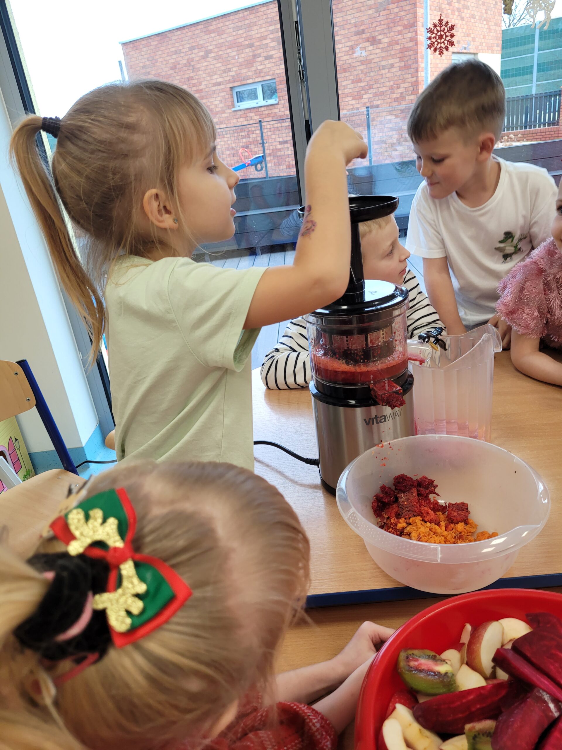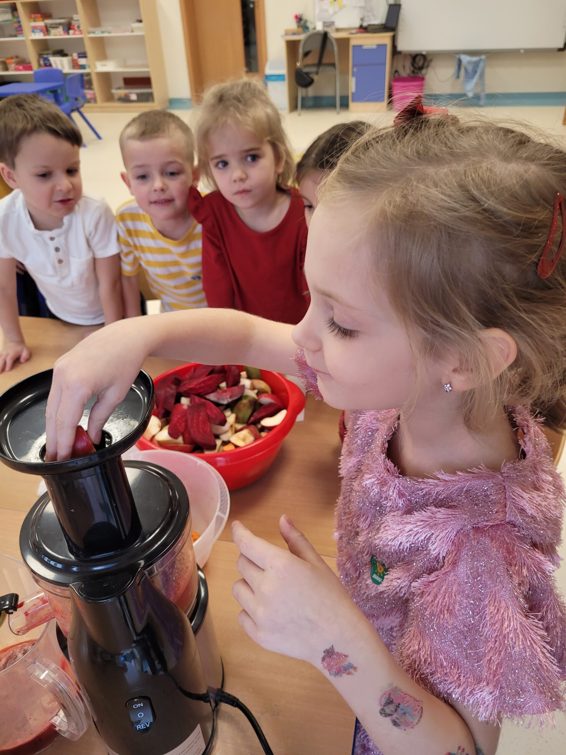Kropki podczas warsztatów kulinarnych własnoręcznie przygotowały sok z buraków, kiwi, marchewki oraz z jabłek. Dzieci ze smakiem wypiły wcześniej przygotowany sok podczas wspólnego podwieczorku.