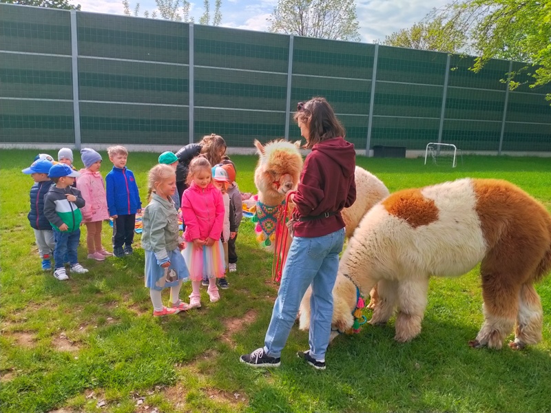 Podczas wizyty przedszkolaki miały okazję zobaczyć alpaki z bliska, dowiedzieć się ciekawostek na temat ich życia i zwyczajów, pogłaskać i nakarmić alpakę pod okiem opiekuna, a także wziąć udział w krótkich zajęciach plastycznych.