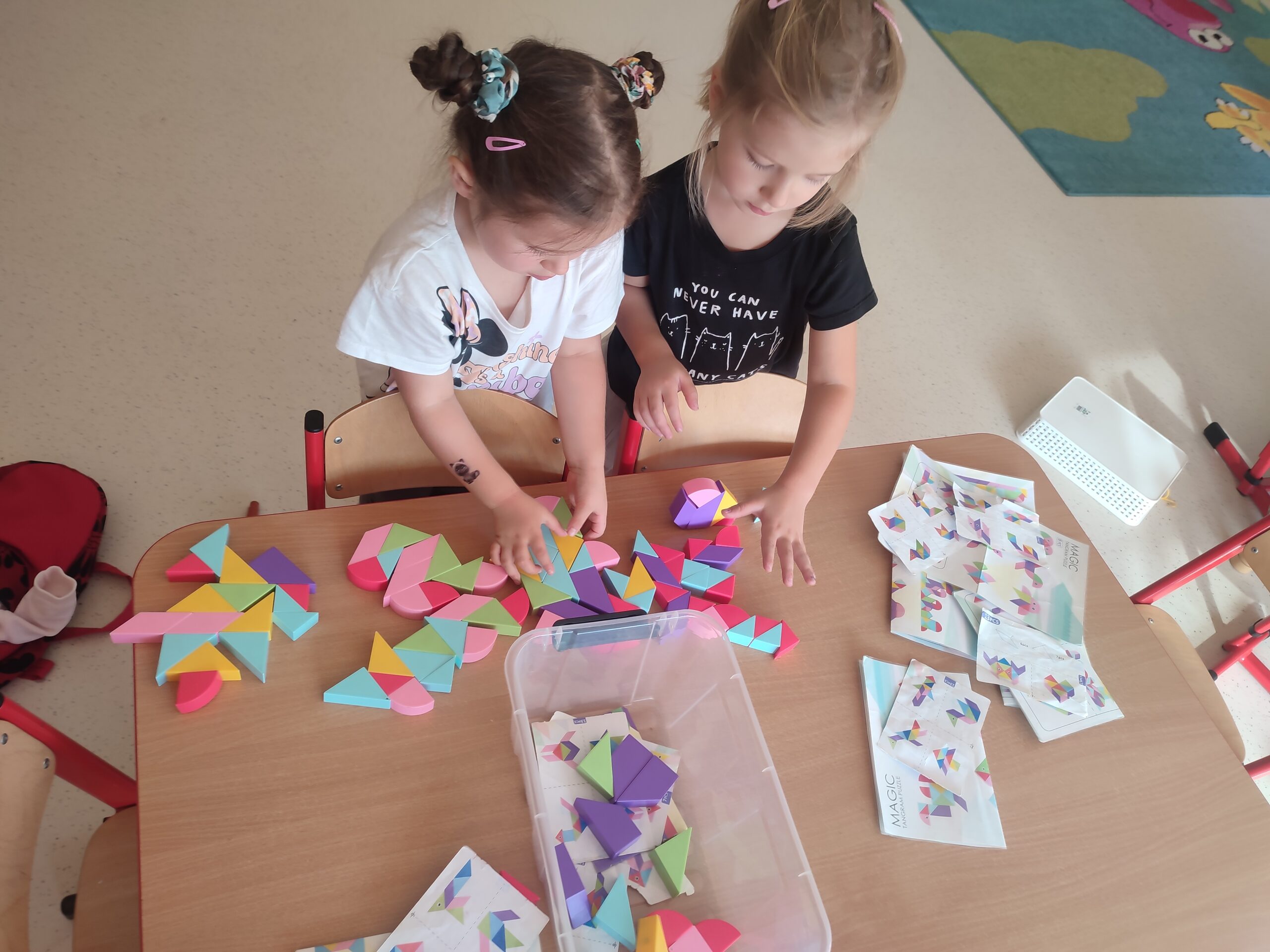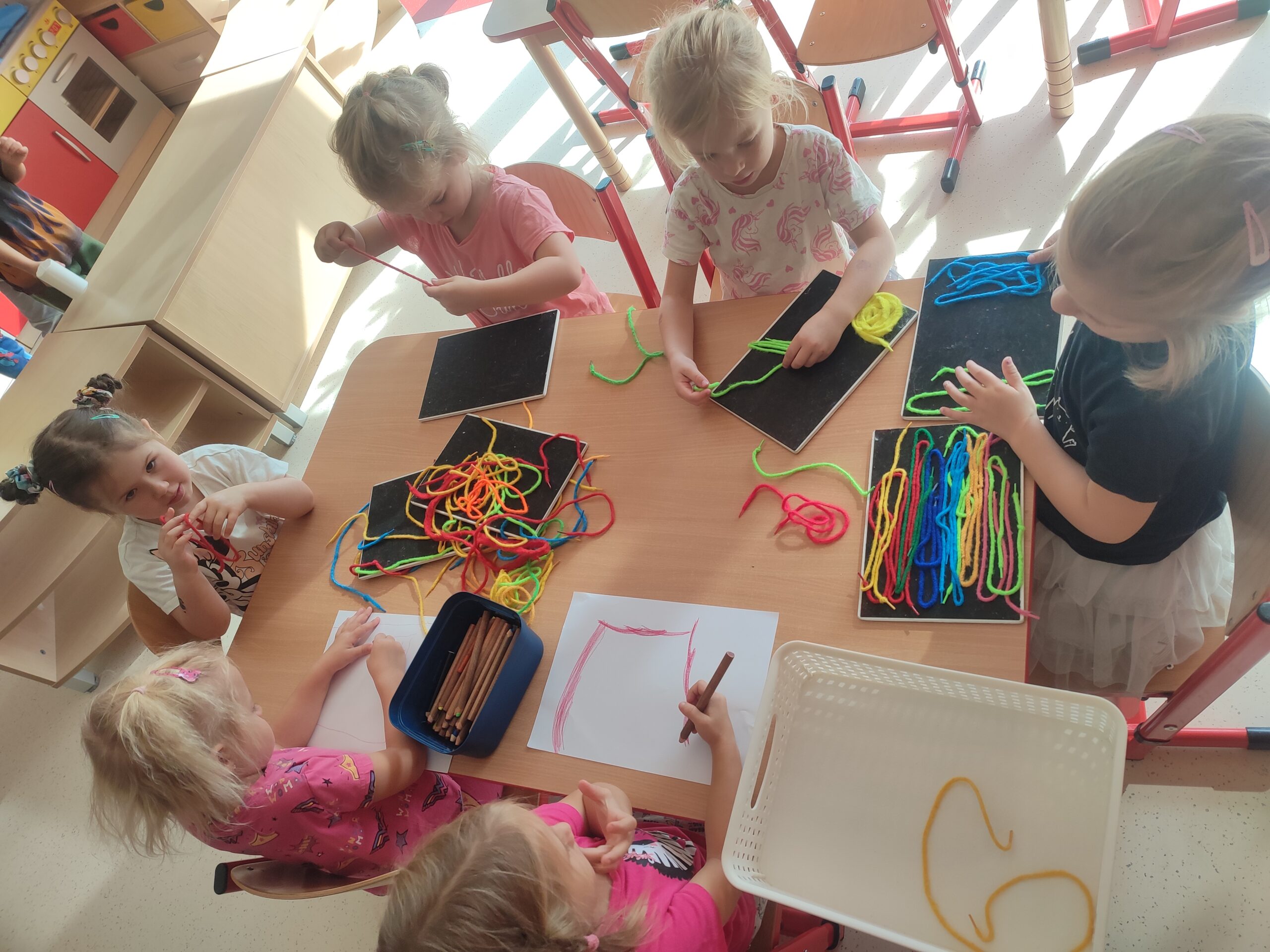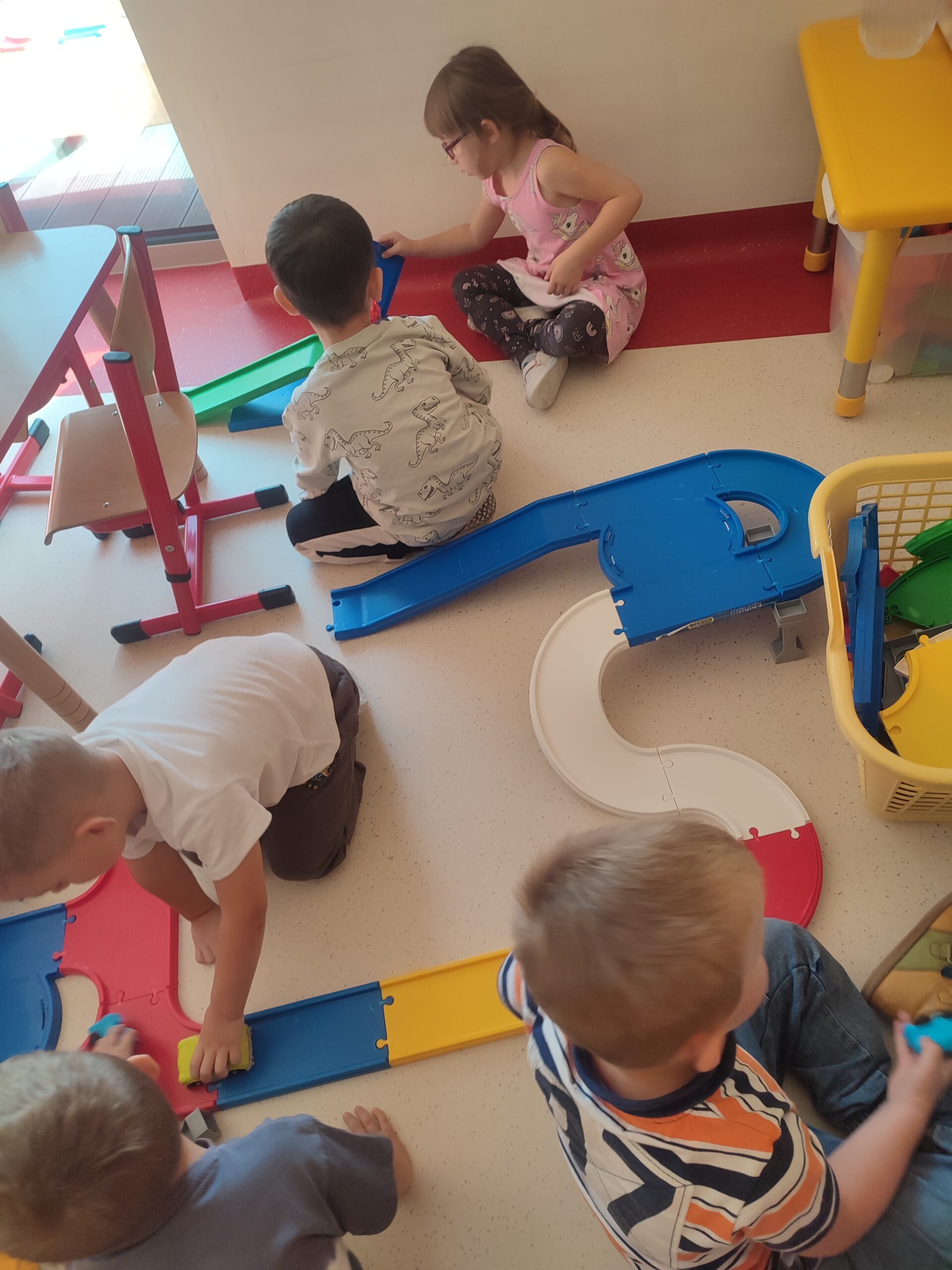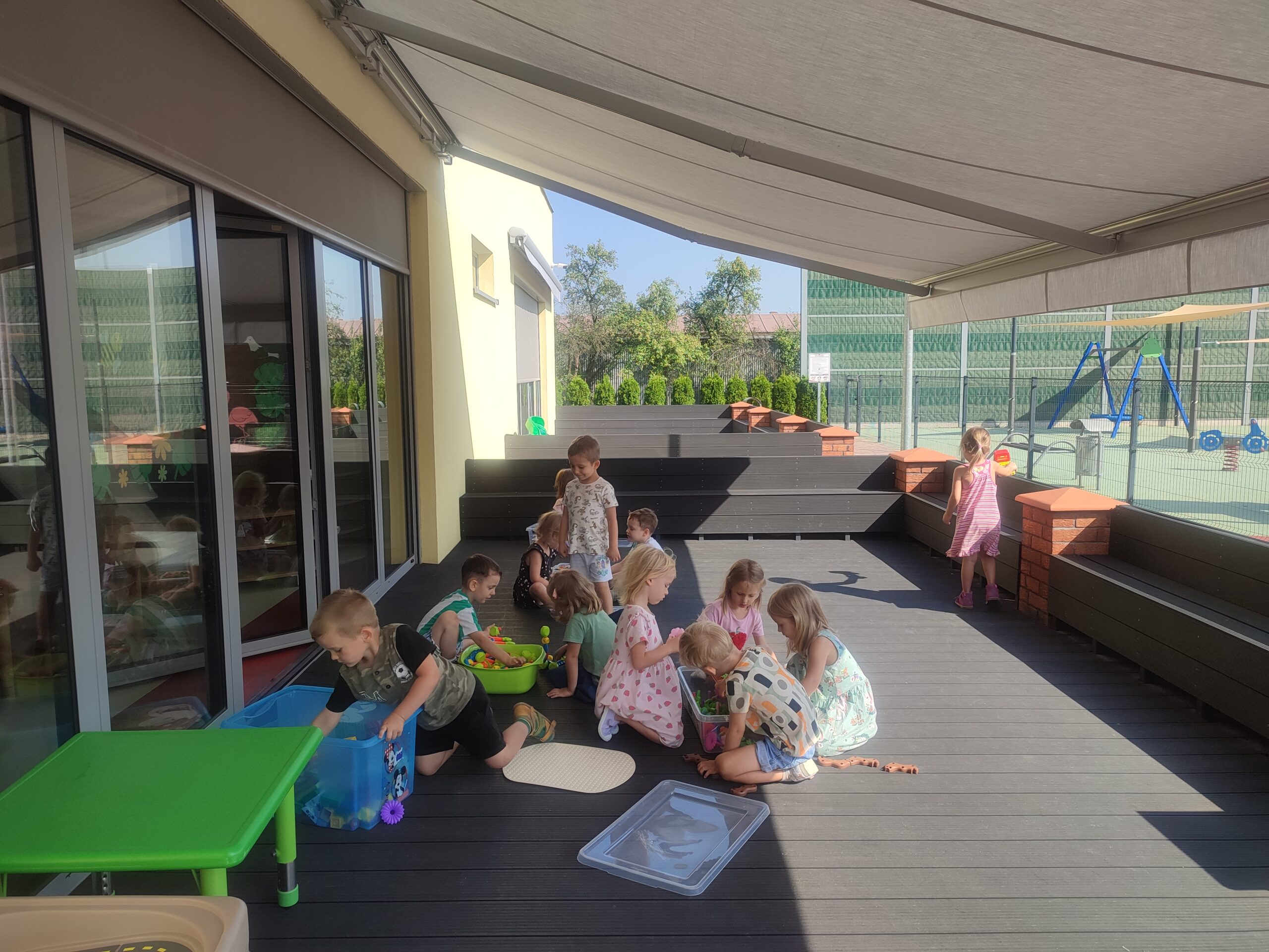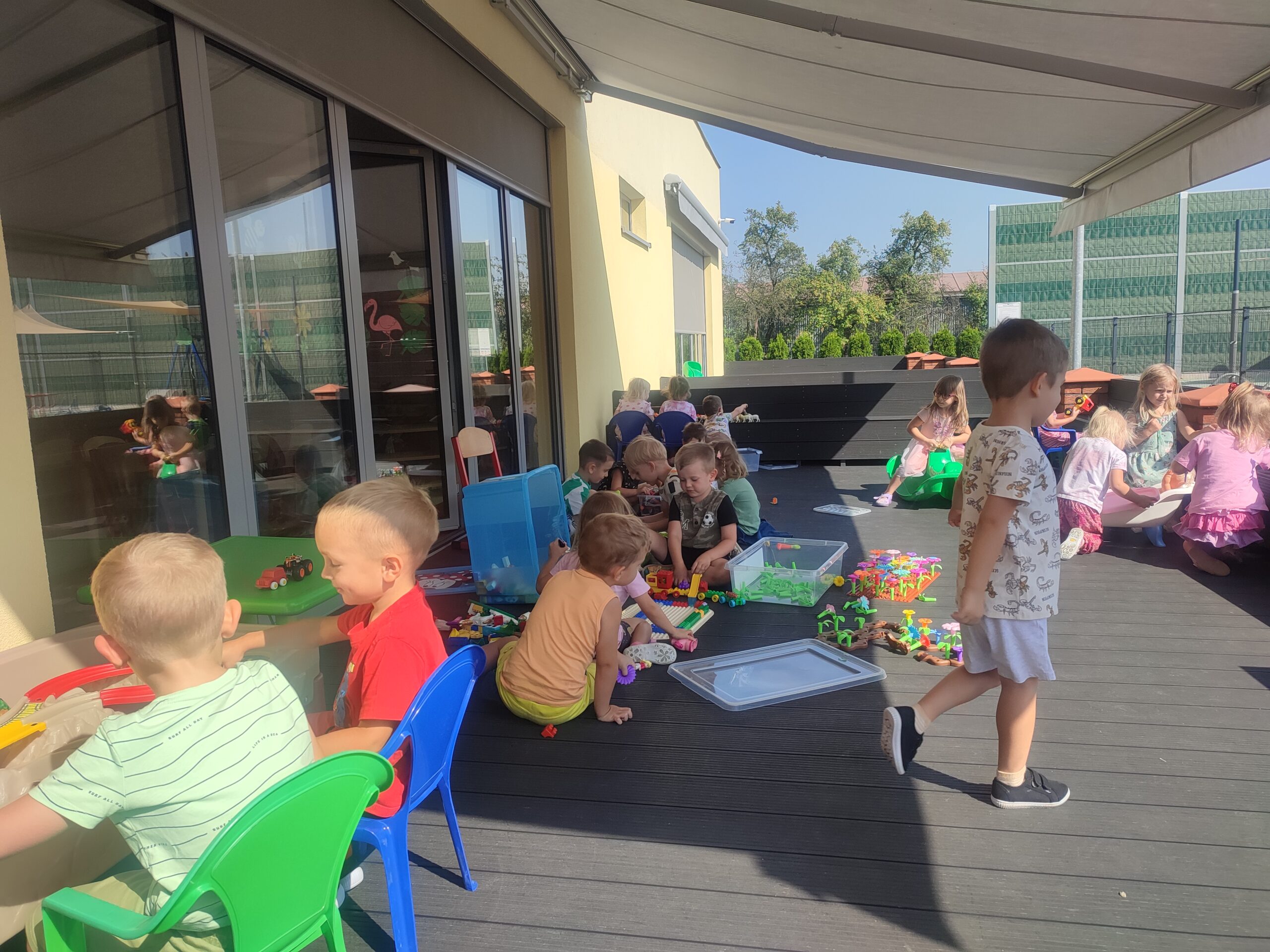 Uwielbiają się bawić w sali i na tarasie podczas pięknej pogody na dworze. Są bardzo kreatywni jeśli chodzi o gry i zabawy dowolne. Wykazują się pomysłowością i dużym zaangażowaniem.