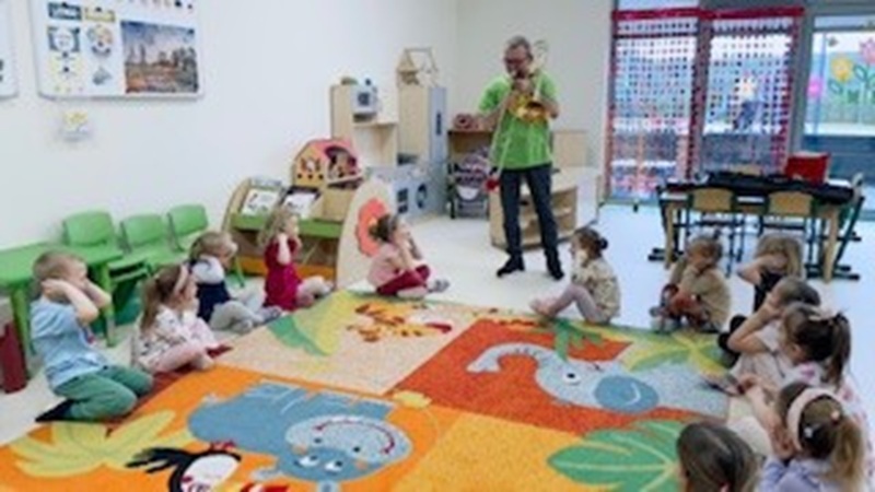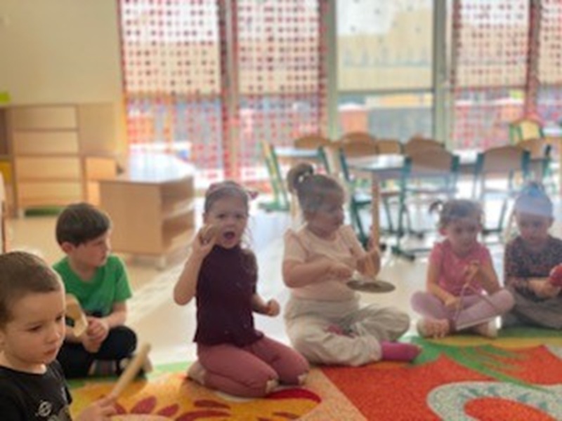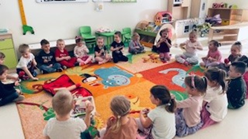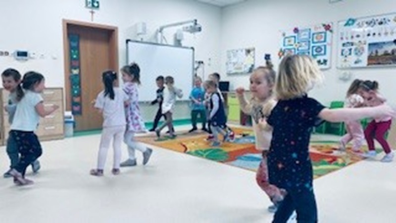 Dzieci z grupy III bardzo lubią zabawy muzyczno –  ruchowe. Celem takich zajęć jest rozwijanie słuchu muzycznego i poczucia rytmu. Wyrabianie zdolności skupienia uwagi i koncentracji. Nauczanie i doskonalenie różnych form ruchu przy muzyce. Rozwija się także wyobraźnia muzyczna. Dzieci chętnie grają na instrumentach muzycznych, a także świetnie się  bawią podczas rytmiki, którą prowadzi pan Tomek. Zawsze ma fajną niespodziankę dla dzieci, dzięki której dzieci poznają nowe dźwięki.
